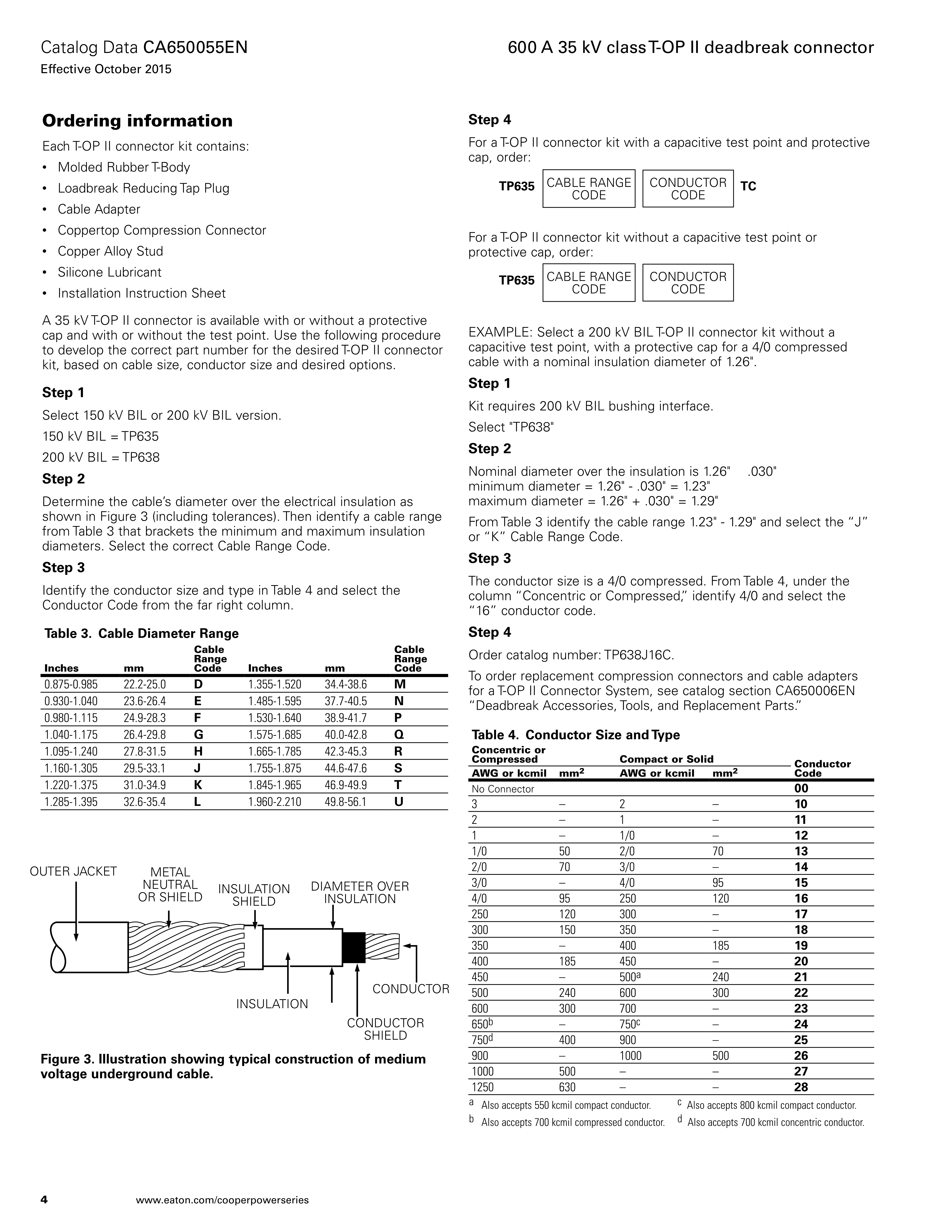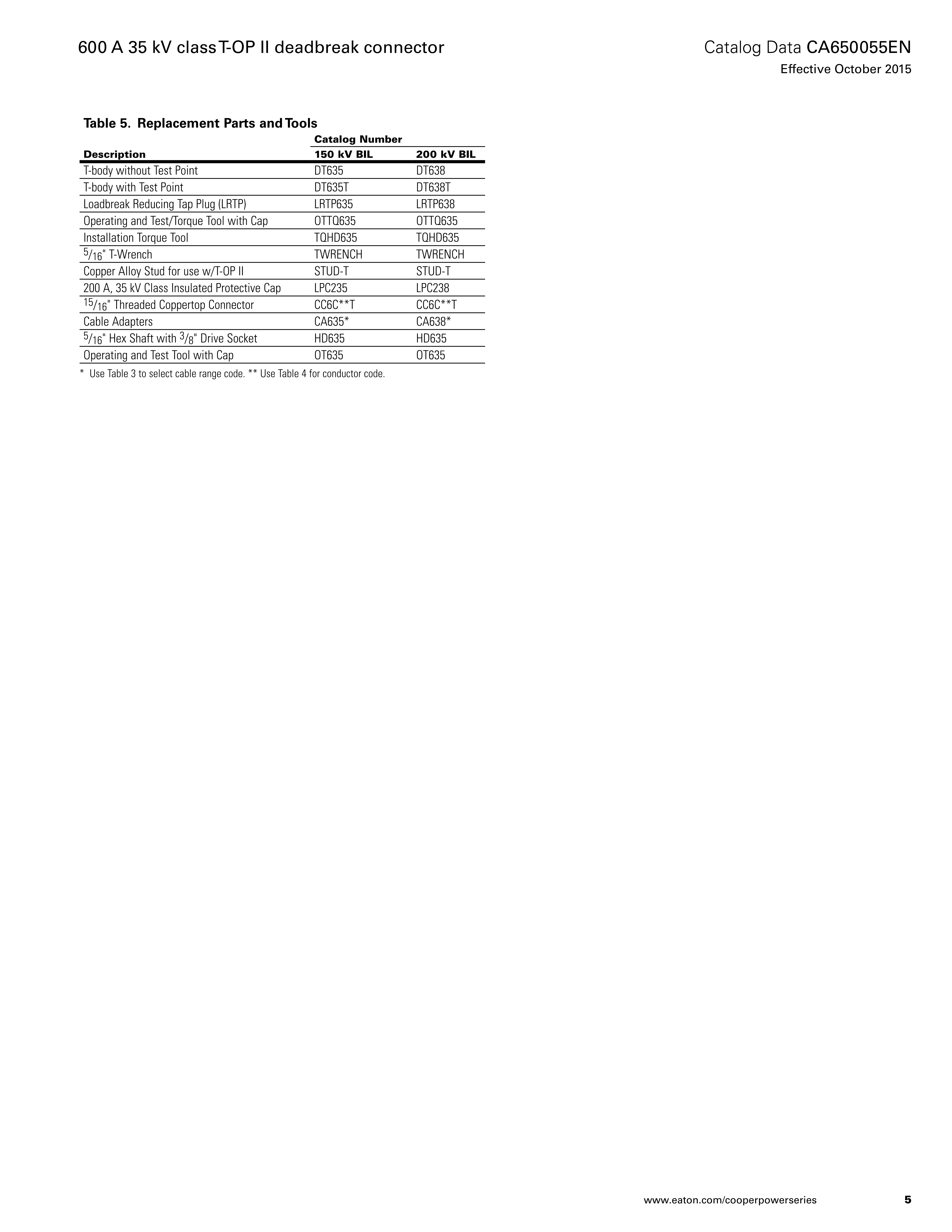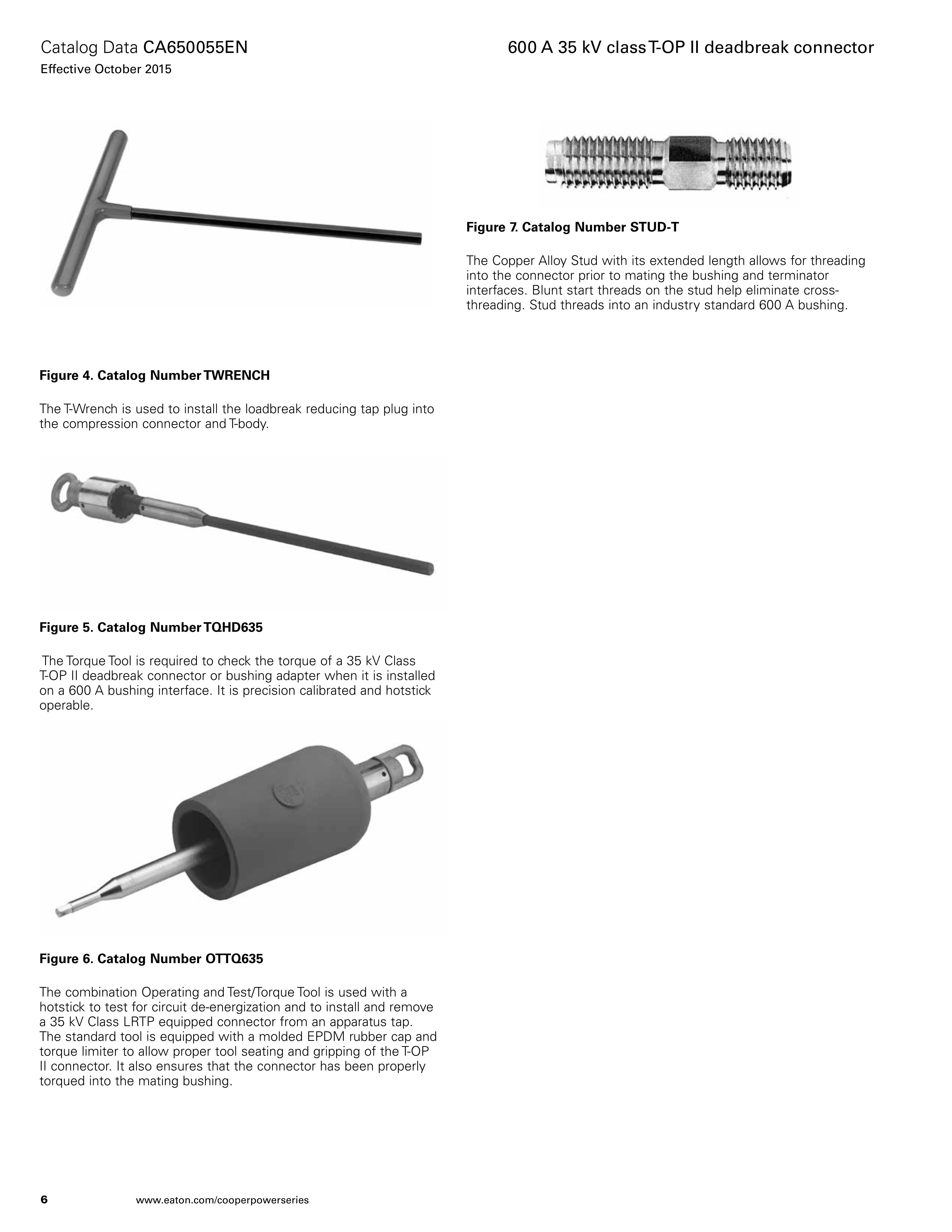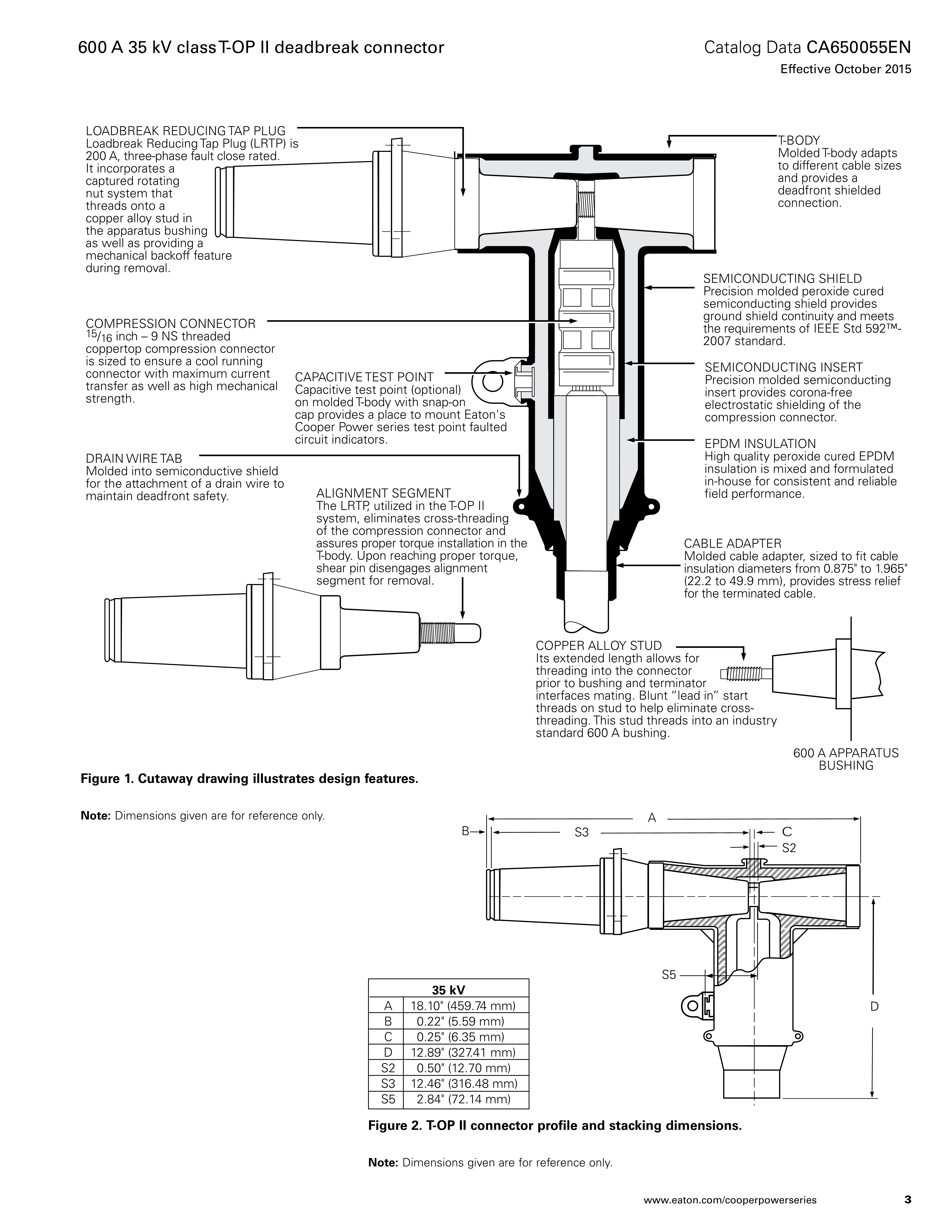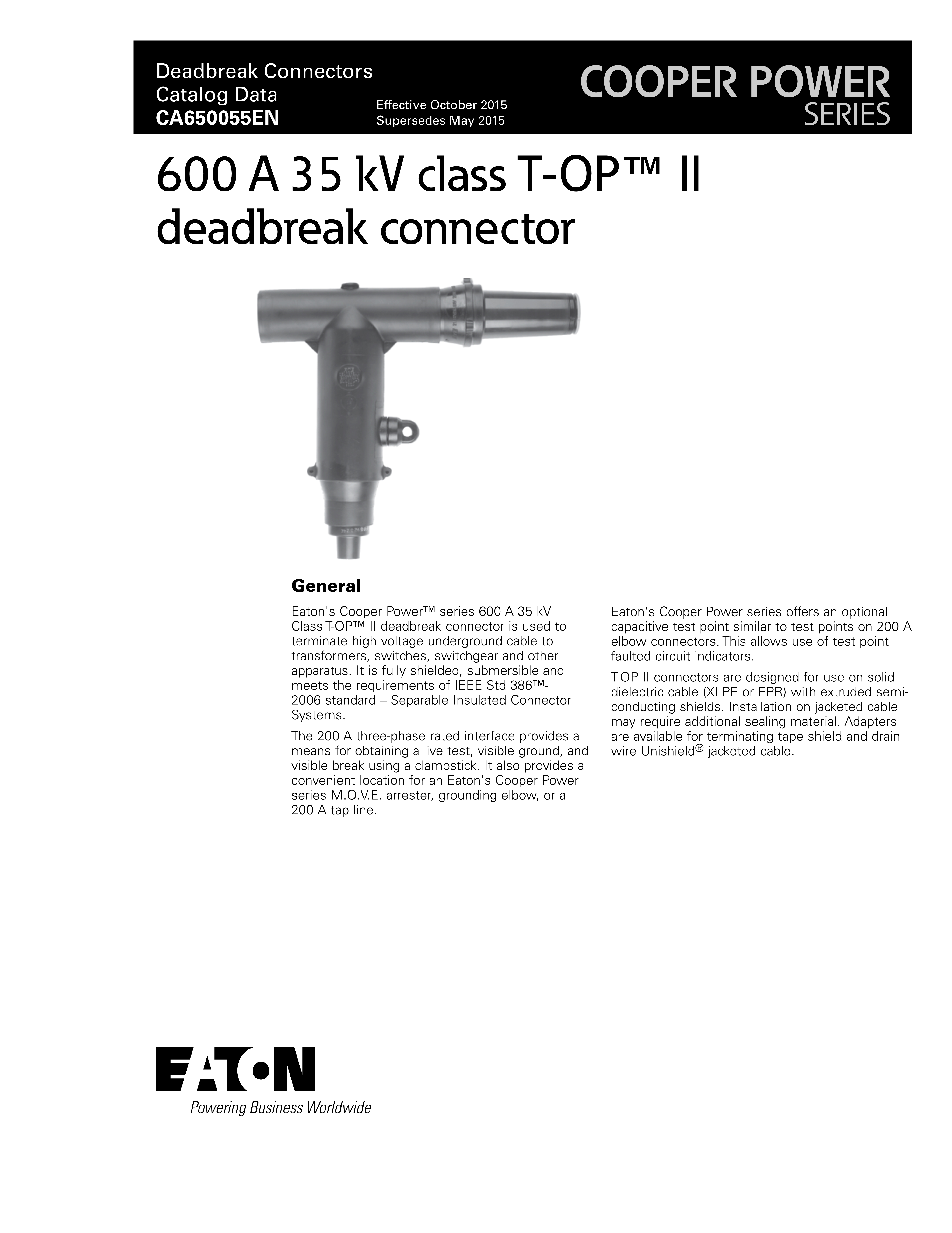 Eaton's Cooper Power™ series 600 A 35 kV Class T-OP™ II deadbreak connector is used to terminate high voltage underground cable to transformers, switches, switchgear and other apparatus. It is fully shielded, submersible and meets the requirements of IEEE Std 386™- 2006 standard – Separable Insulated Connector Systems.