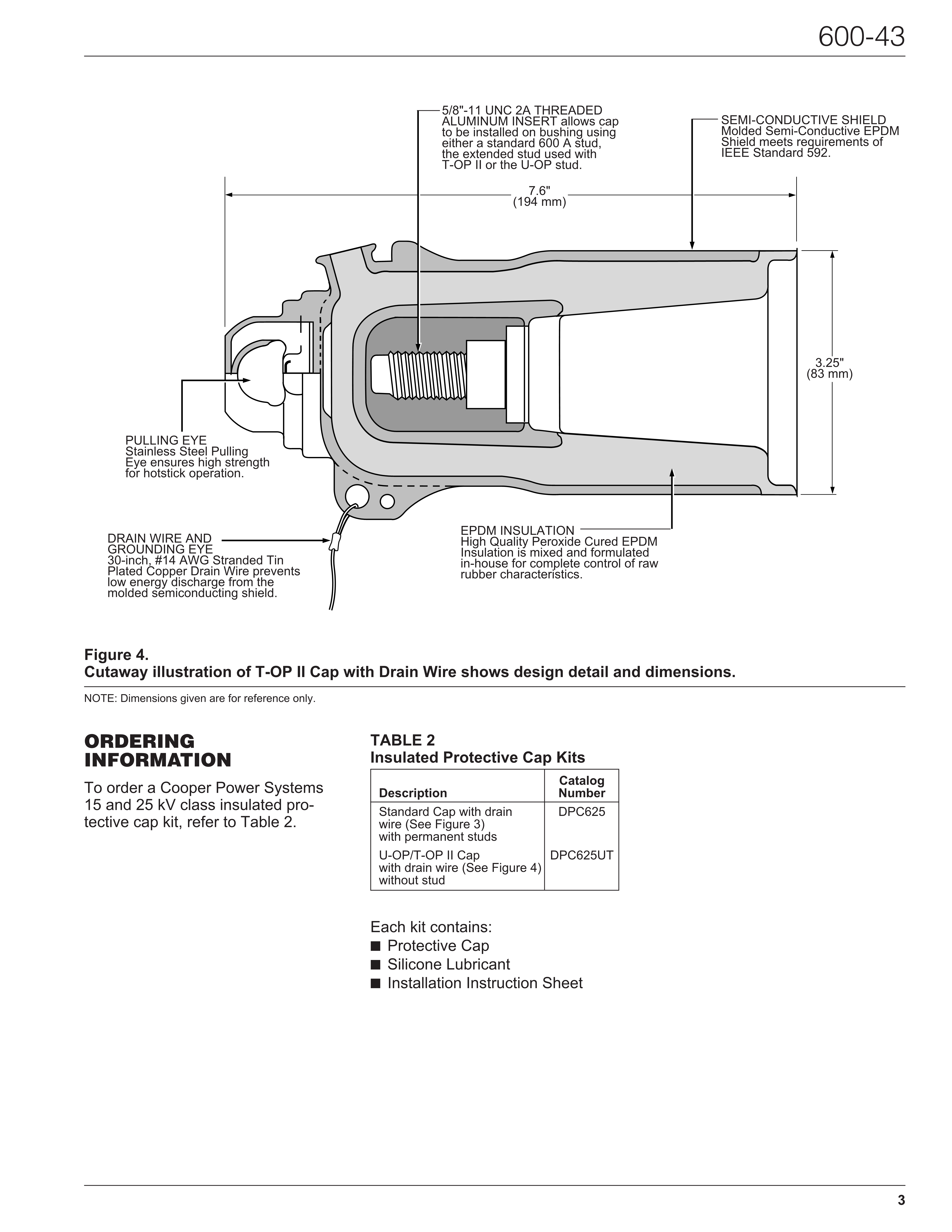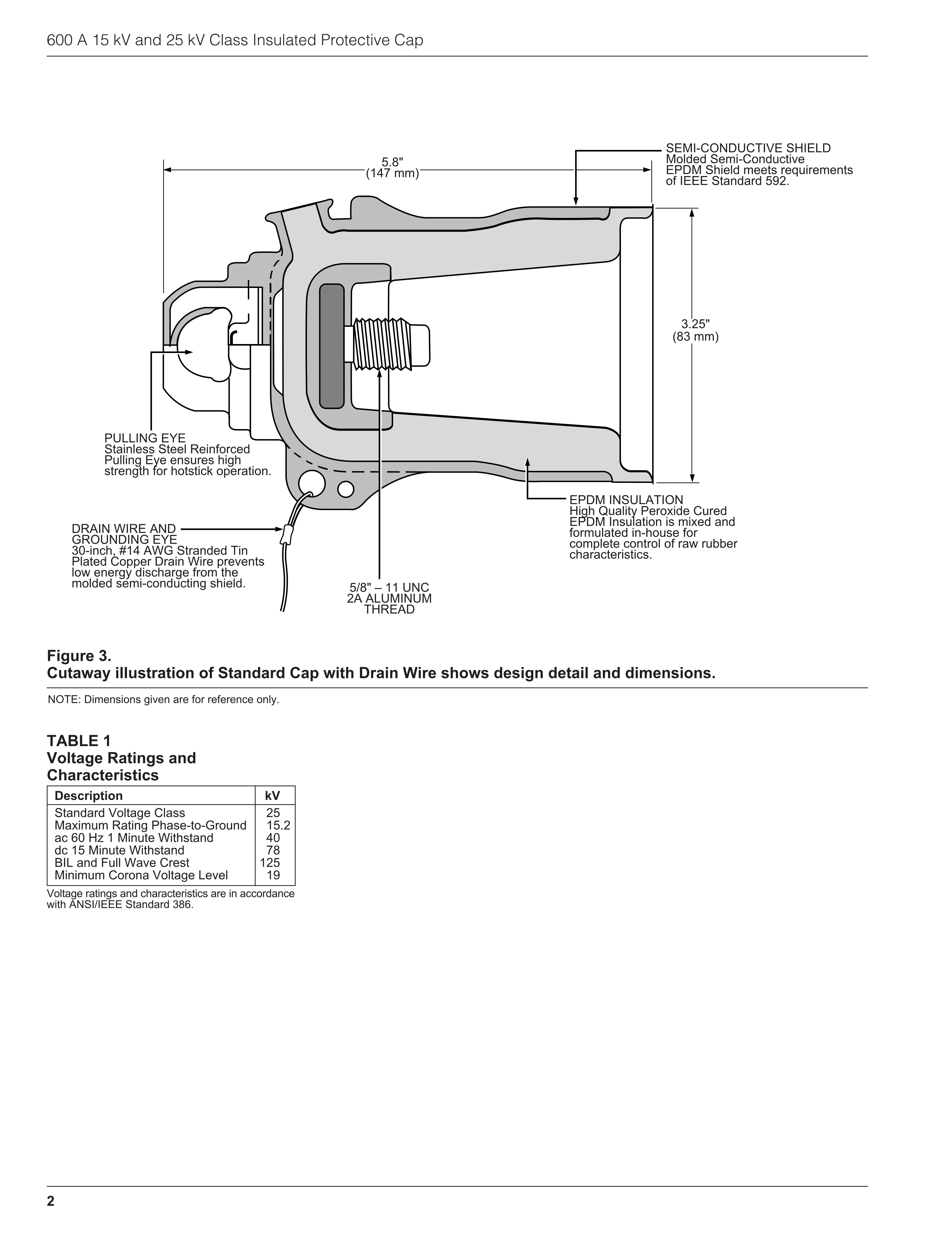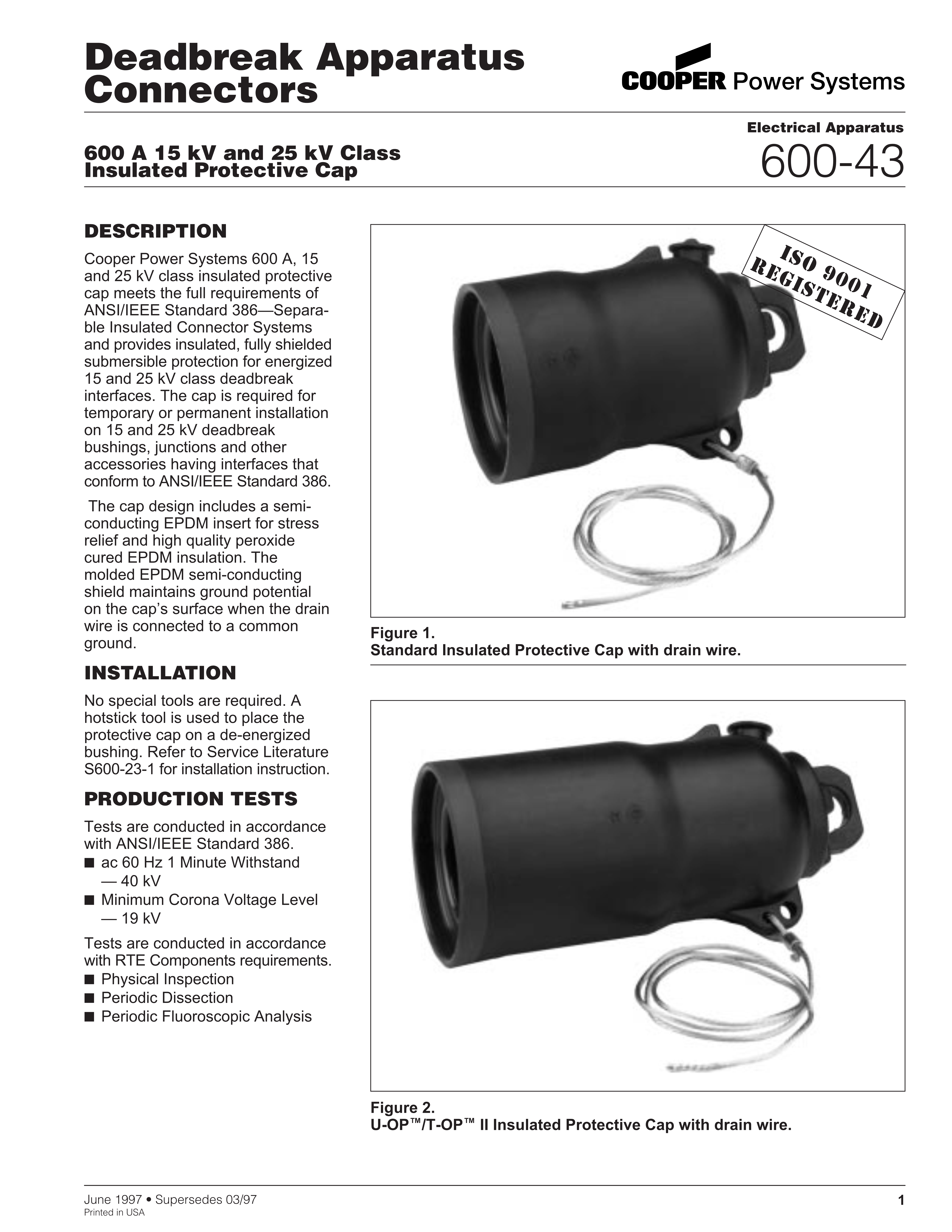 Cooper Power Systems 600 A, 15 and 25 kV class insulated protective cap meets the full requirements of ANSI/IEEE Standard 386—Separable Insulated Connector Systems and provides insulated, fully shielded submersible protection for energized 15 and 25 kV class deadbreak interfaces. The cap is required for temporary or permanent installation on 15 and 25 kV deadbreak bushings, junctions and other accessories having interfaces that conform to ANSI/IEEE Standard 386.
