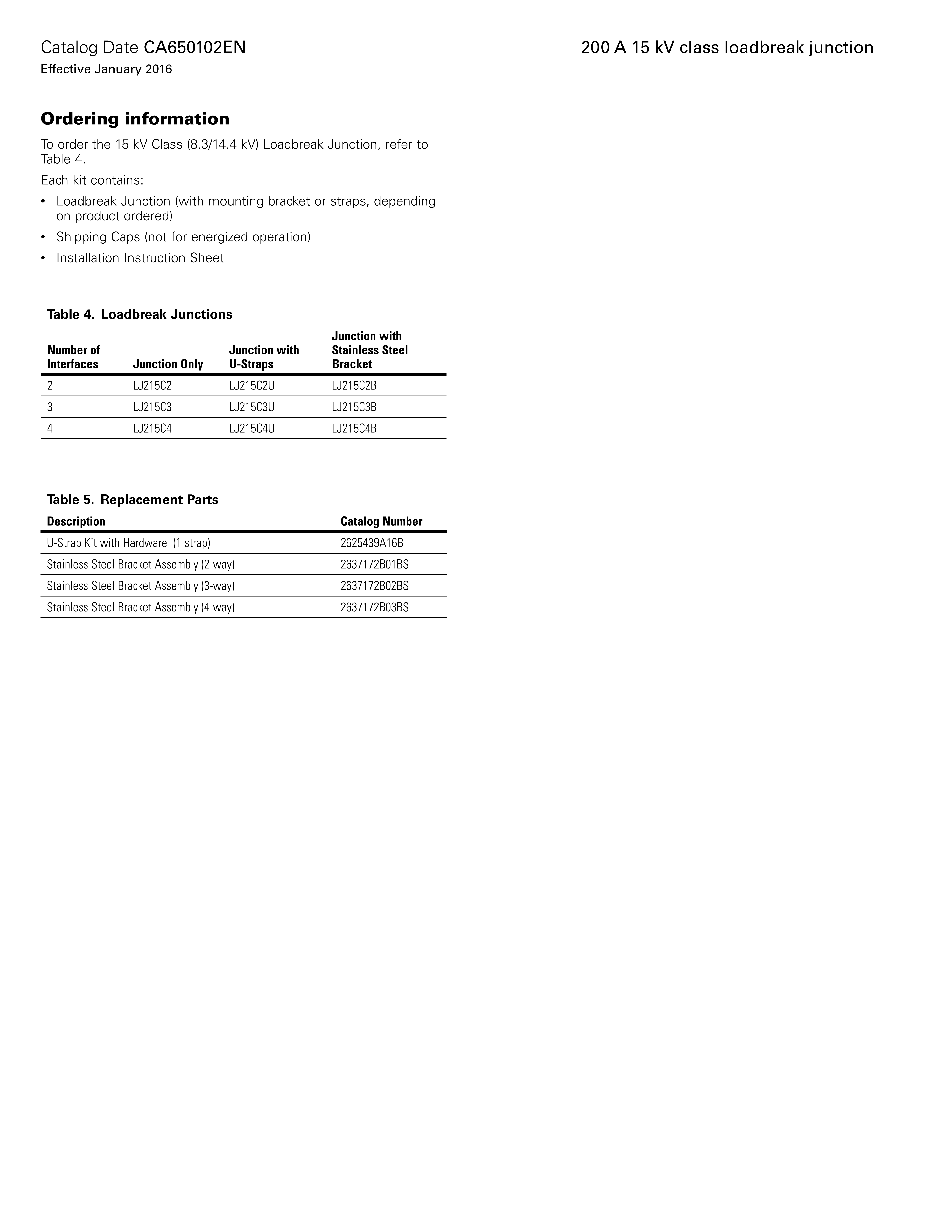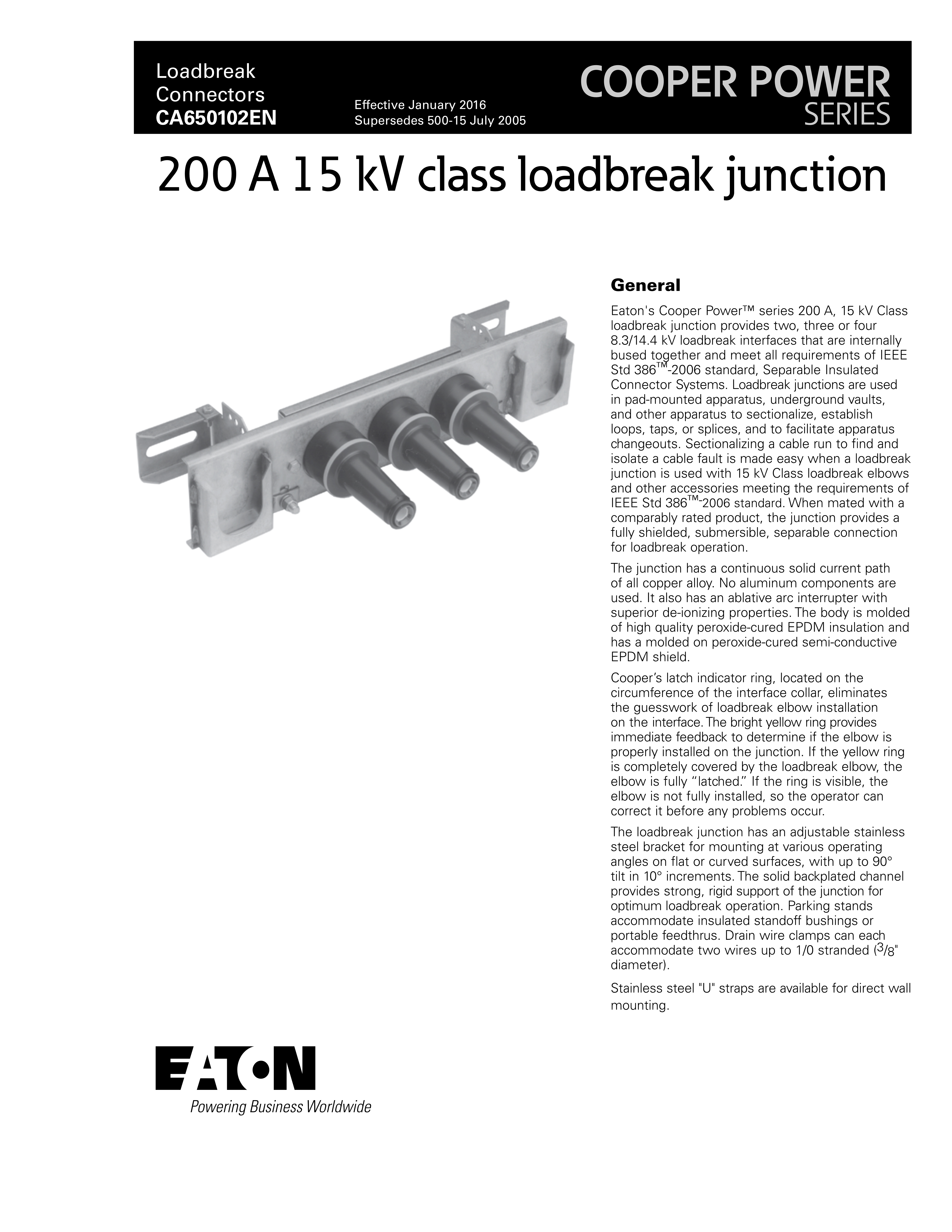 Eaton's Cooper Power™ series 200 A, 15 kV Class loadbreak junction provides two, three or four 8.3/14.4 kV loadbreak interfaces that are internally bused together and meet all requirements of IEEE Std 386™-2006 standard, Separable Insulated Connector Systems. Loadbreak junctions are used in pad-mounted apparatus, underground vaults, and other apparatus to sectionalize, establish loops, taps, or splices, and to facilitate apparatus changeouts. Sectionalizing a cable run to find and isolate a cable fault is made easy when a loadbreak junction is used with 15 kV Class loadbreak elbows and other accessories meeting the requirements of IEEE Std 386™-2006 standard. When mated with a comparably rated product, the junction provides a fully shielded, submersible, separable connection for loadbreak operation.