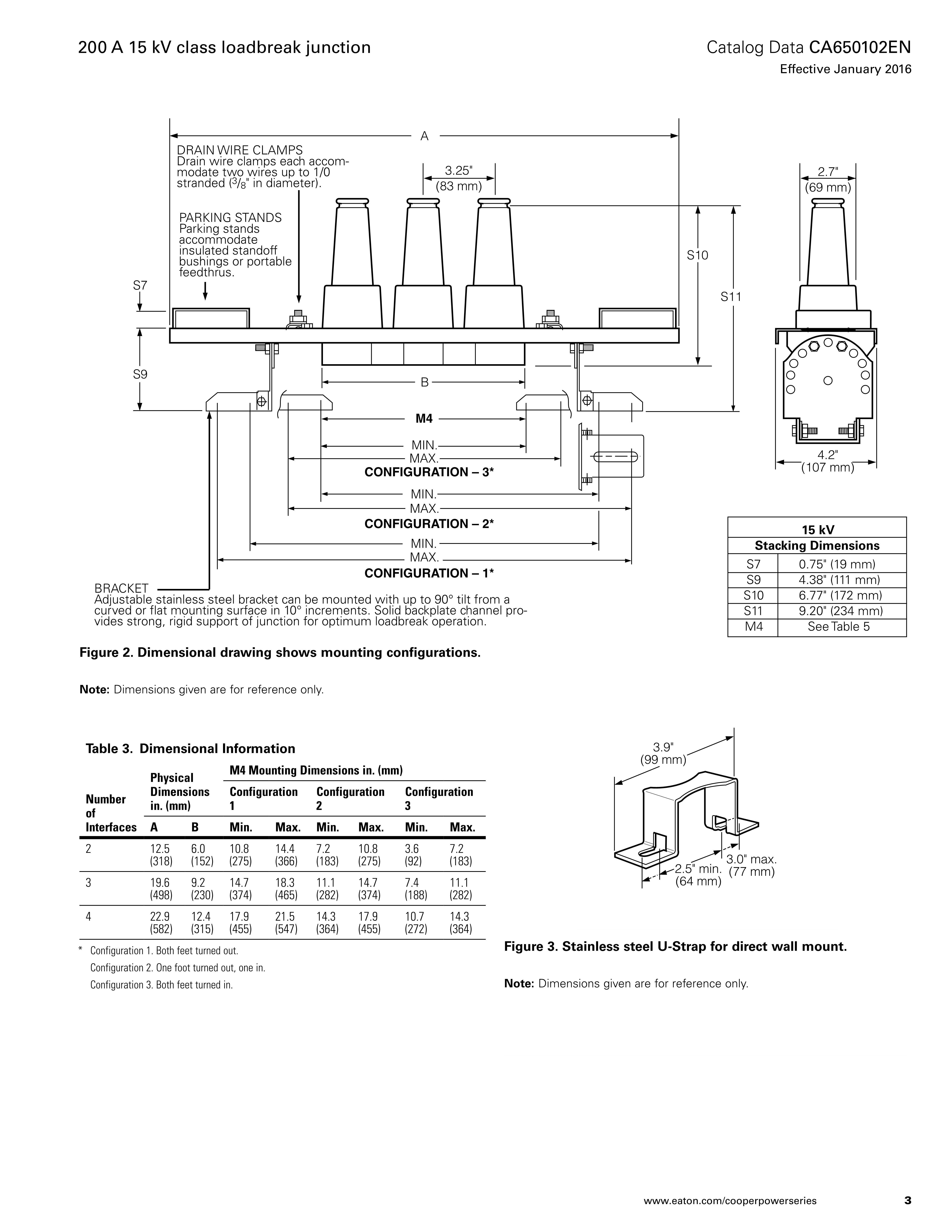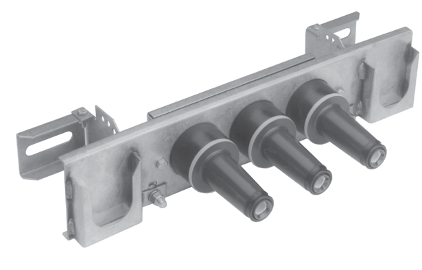 The loadbreak junction has an adjustable stainless steel bracket for mounting at various operating angles on flat or curved surfaces, with up to 90° tilt in 10° increments. The solid backplated channel provides strong, rigid support of the junction for optimum loadbreak operation. Parking stands accommodate insulated standoff bushings or portable feedthrus. Drain wire clamps can each accommodate two wires up to 1/0 stranded (3/8" diameter).