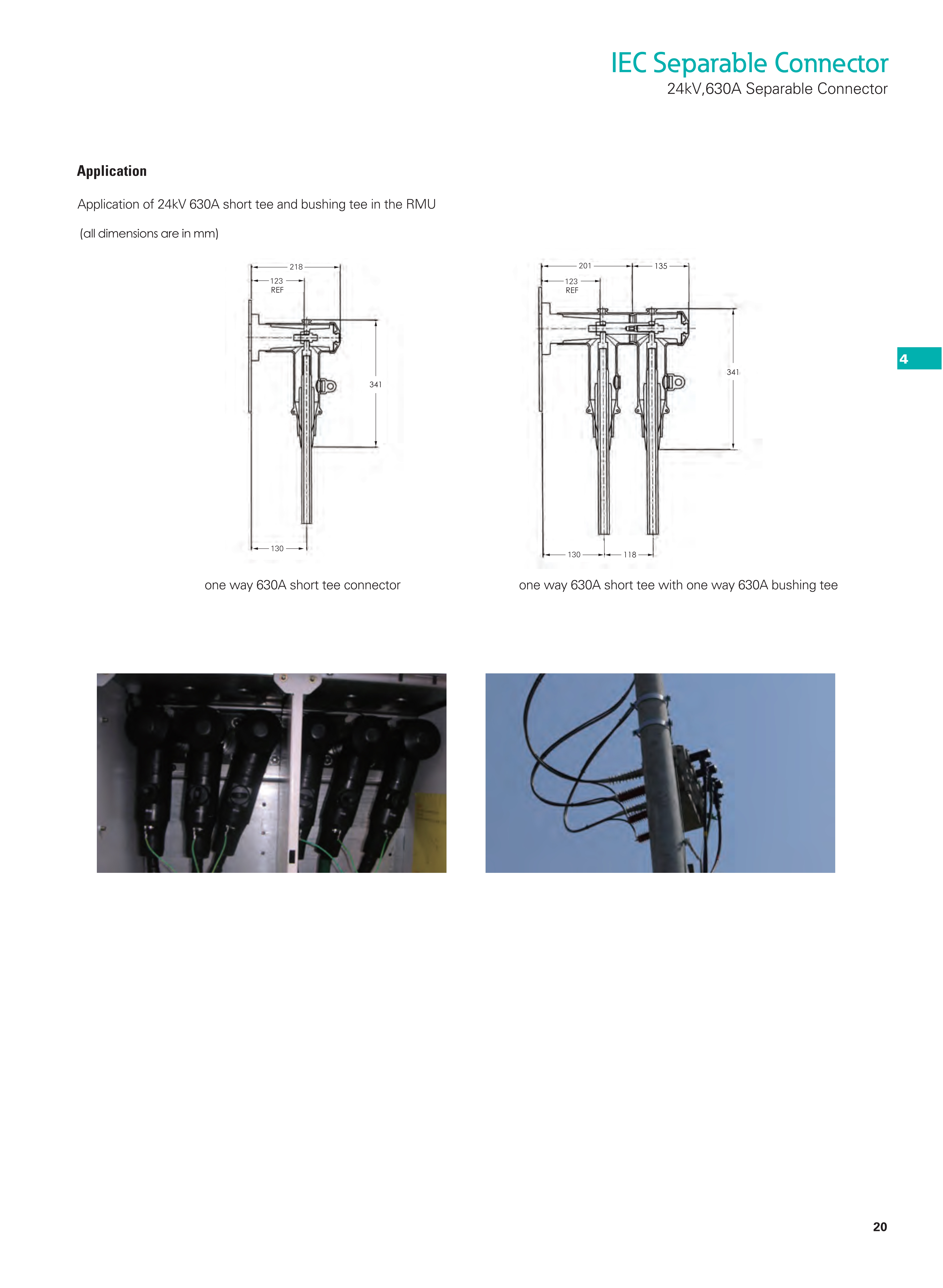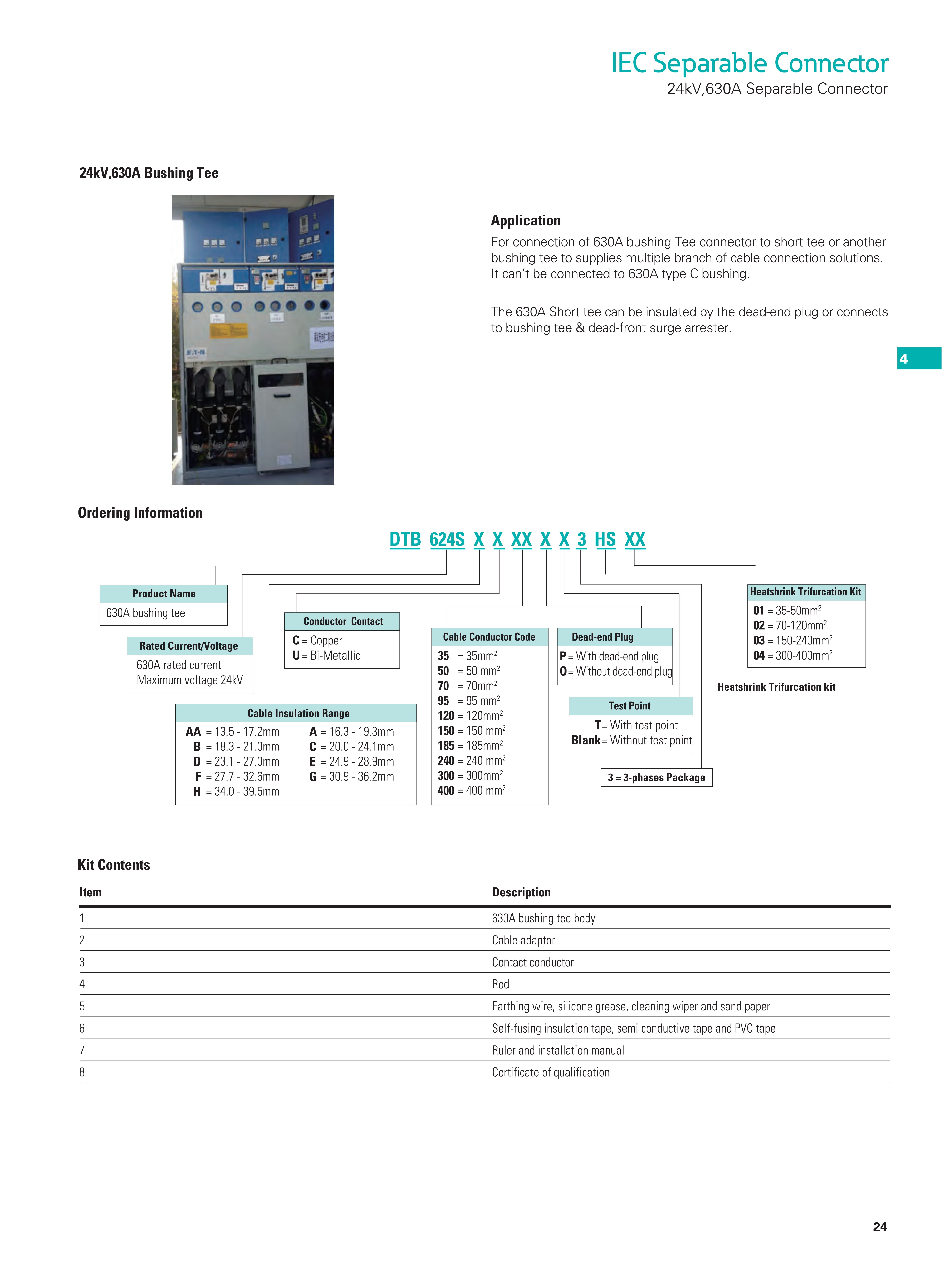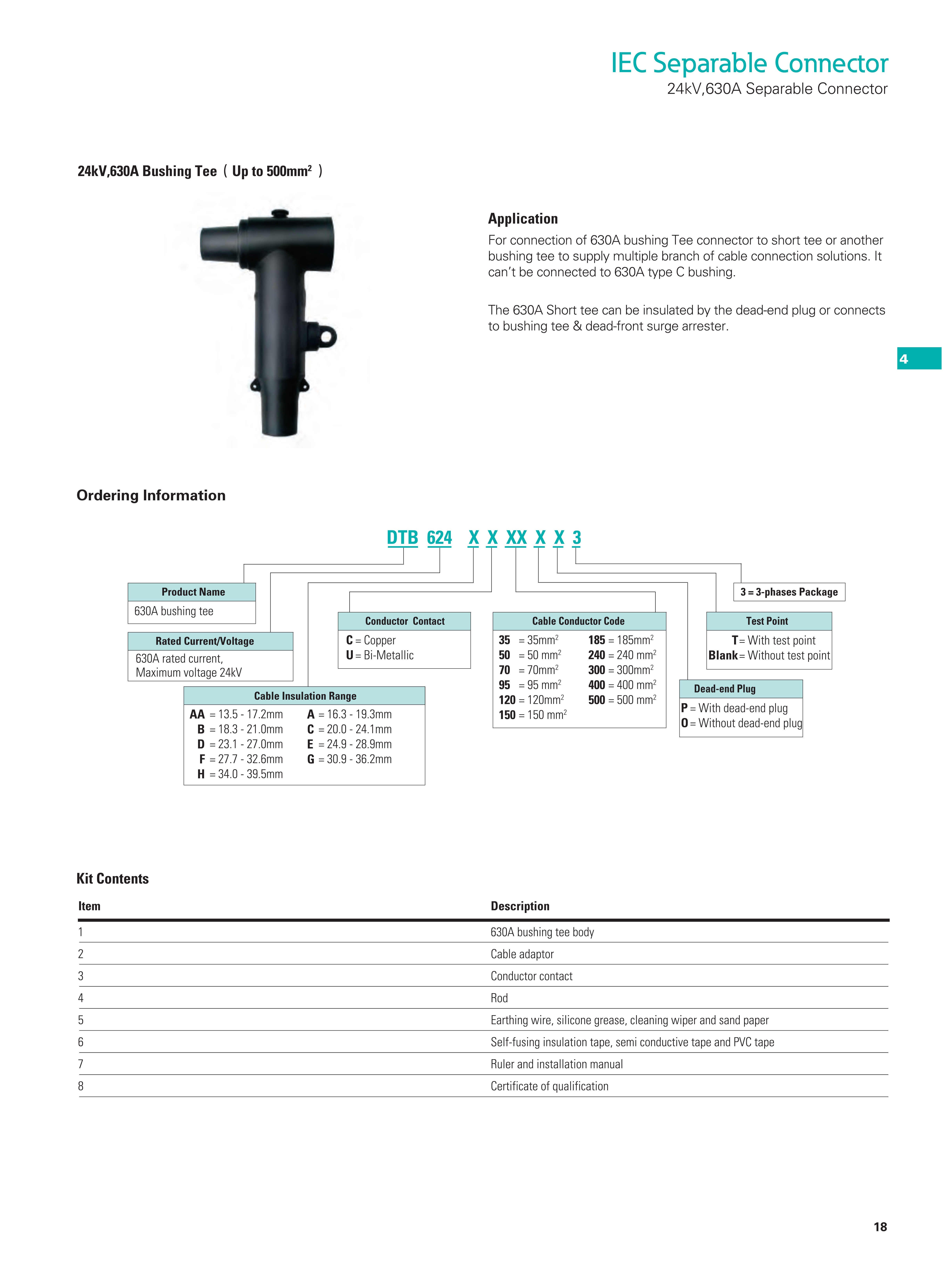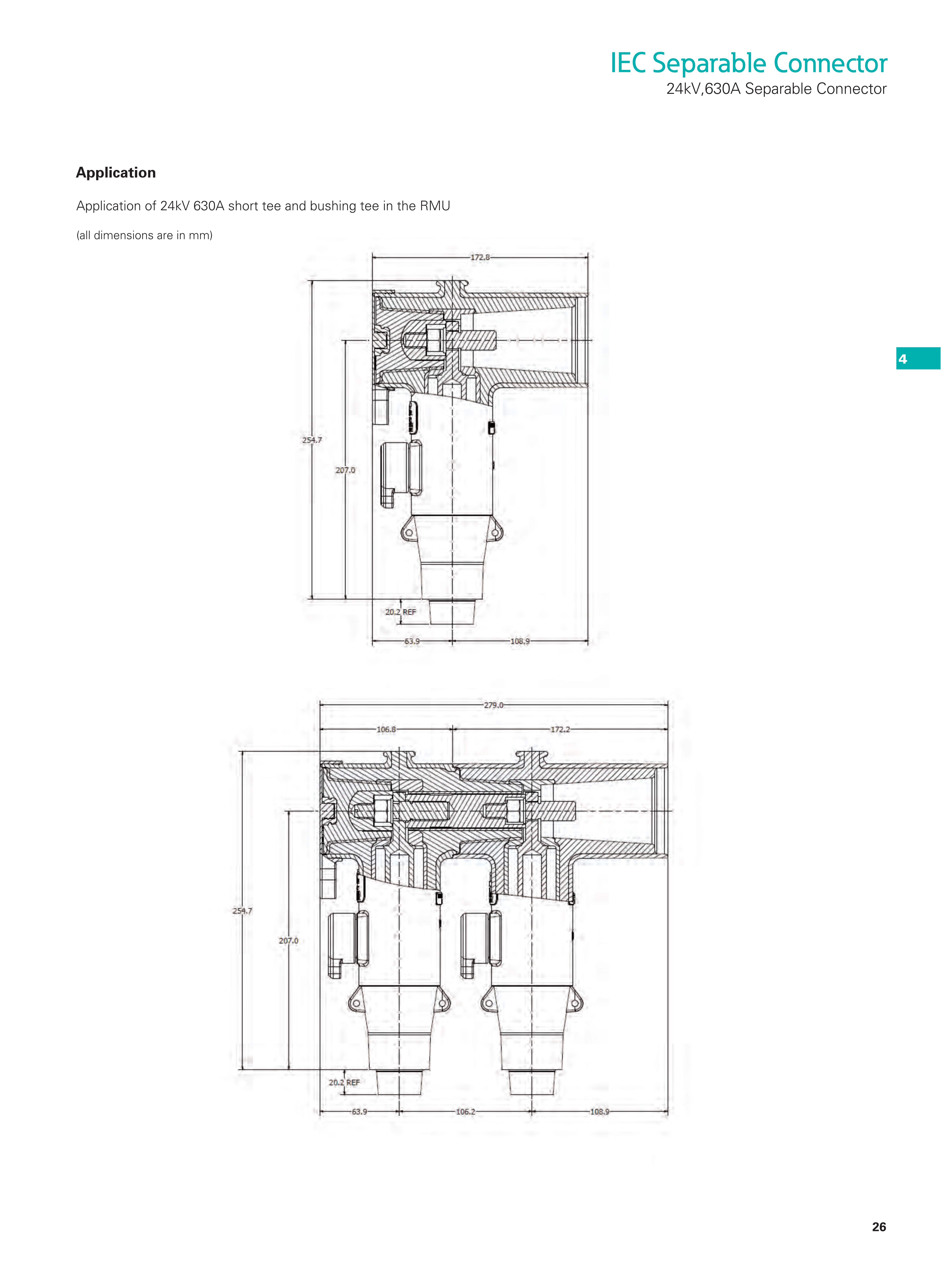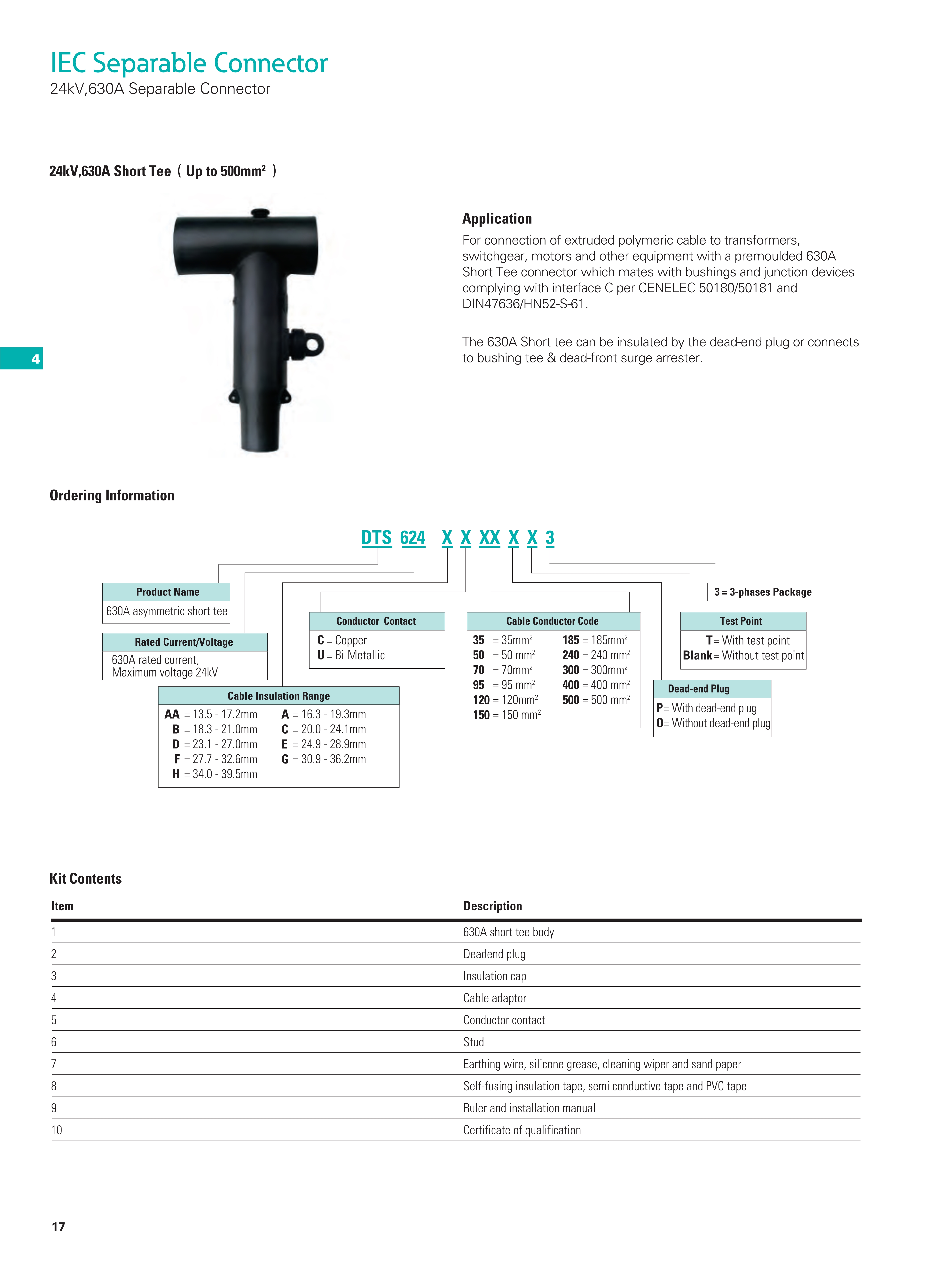 For connection of extruded polymeric cable to transformers, switchgear, sectionalizing cabinets with a premoulded 630A separable connector.