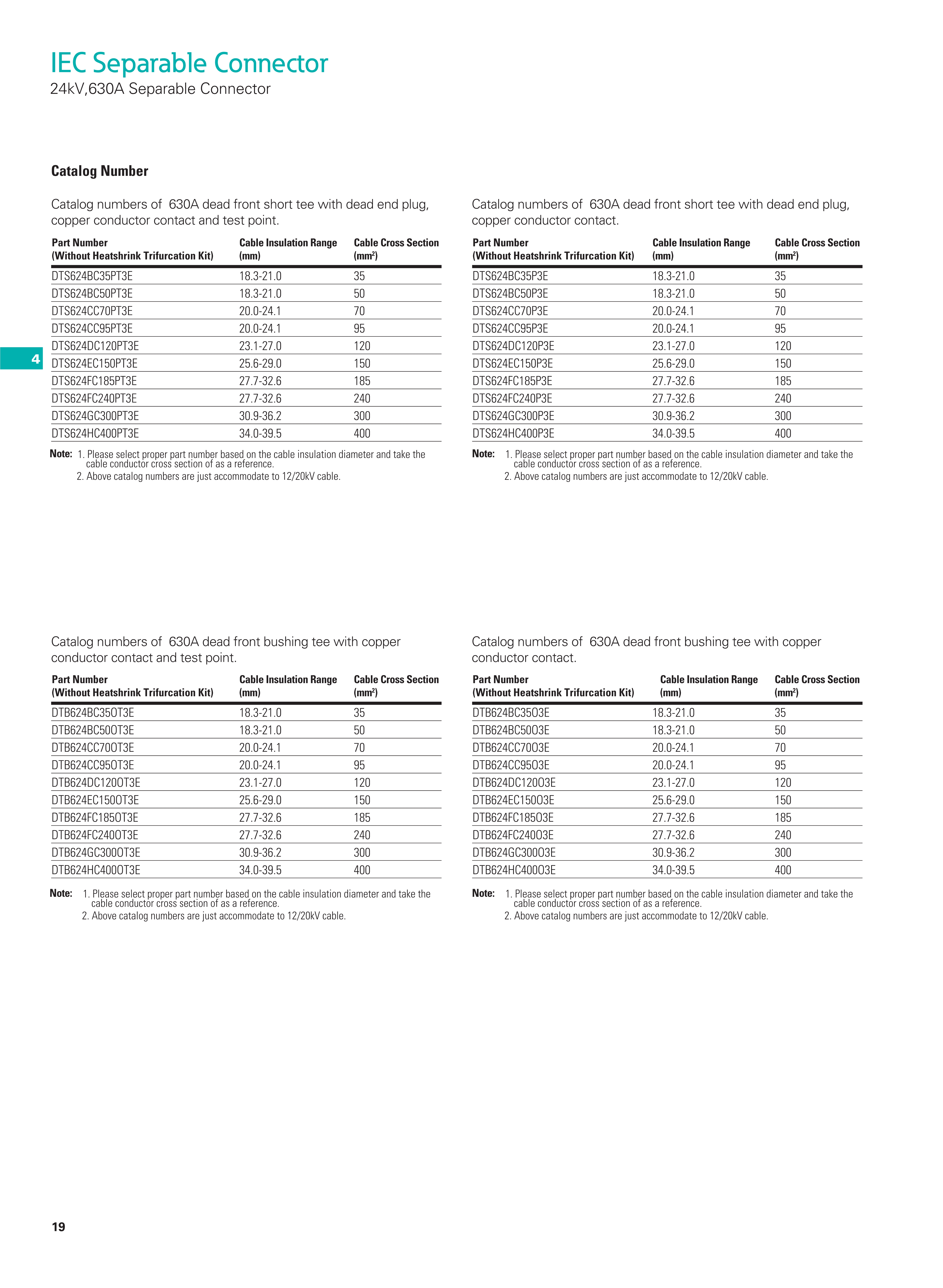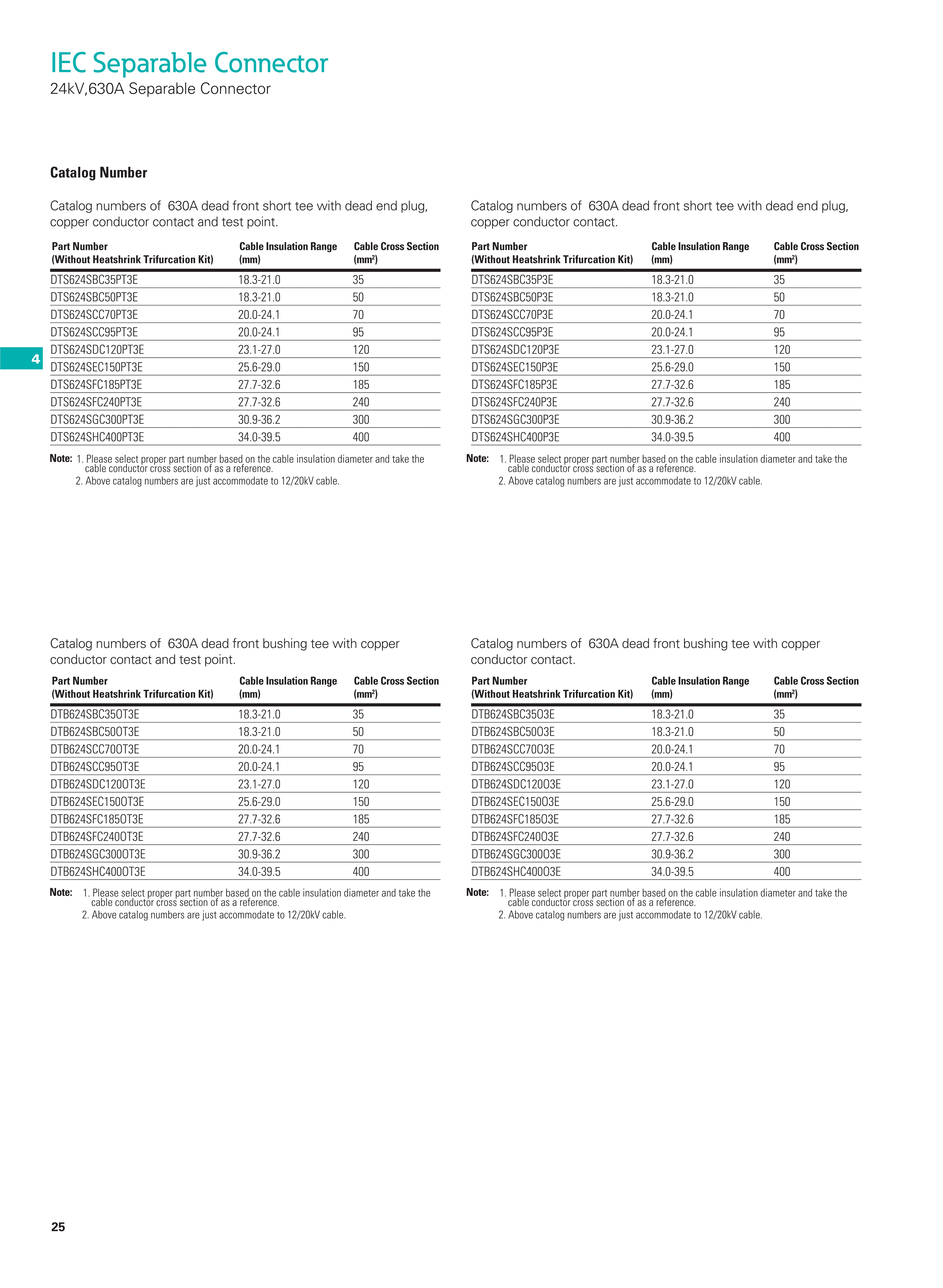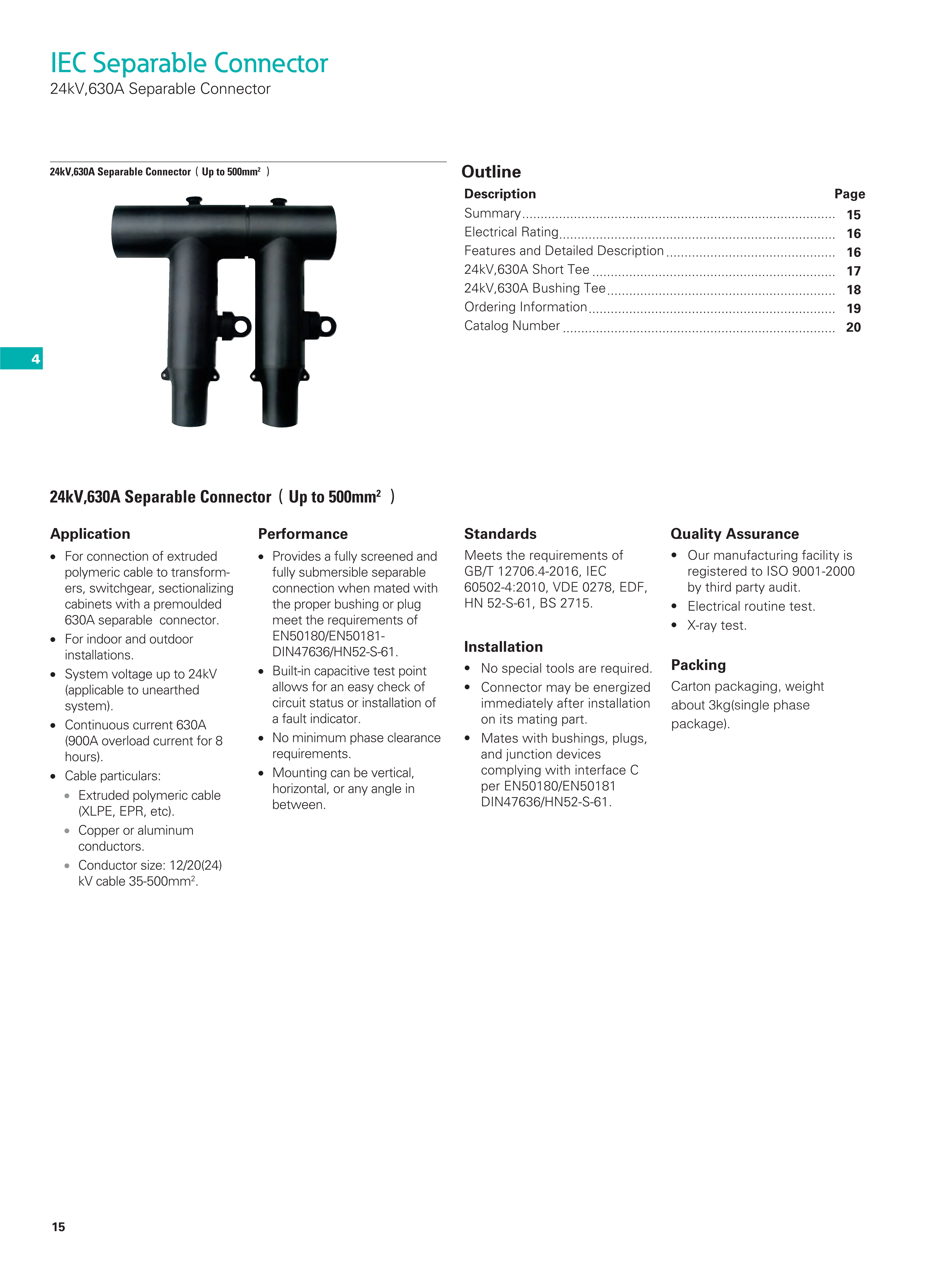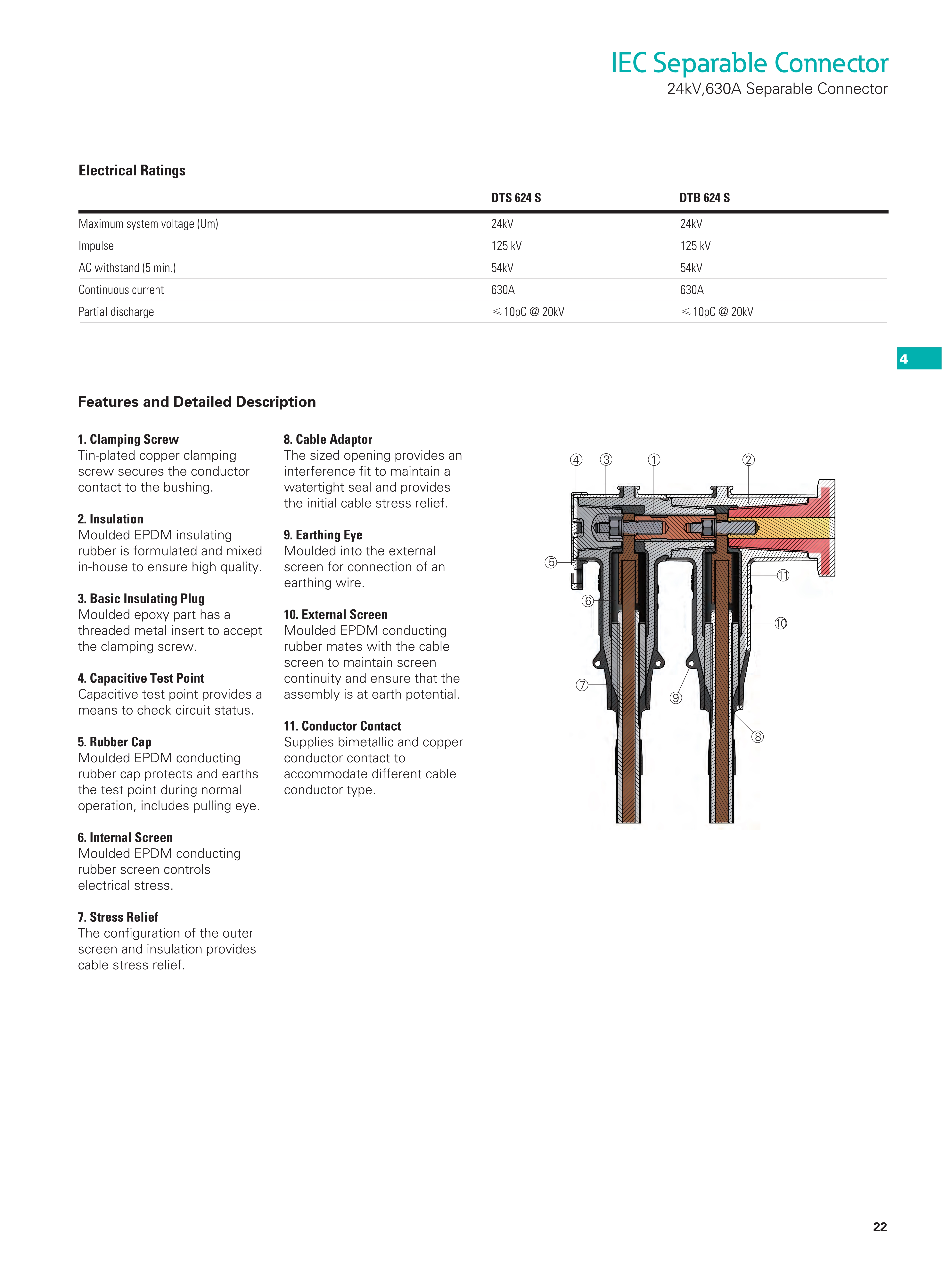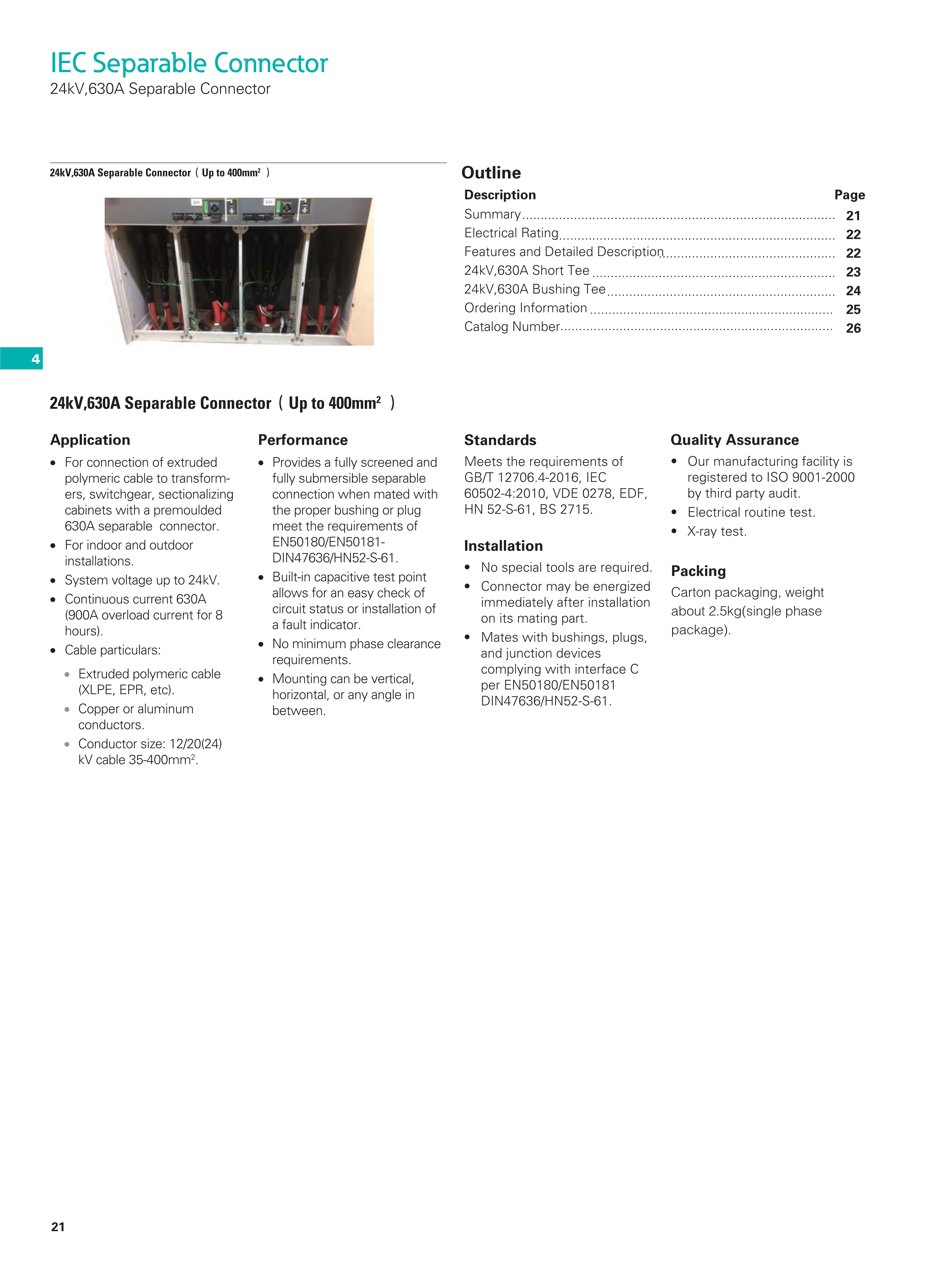 For connection of extruded polymeric cable to transformers, switchgear, sectionalizing cabinets with a premoulded 630A separable connector.