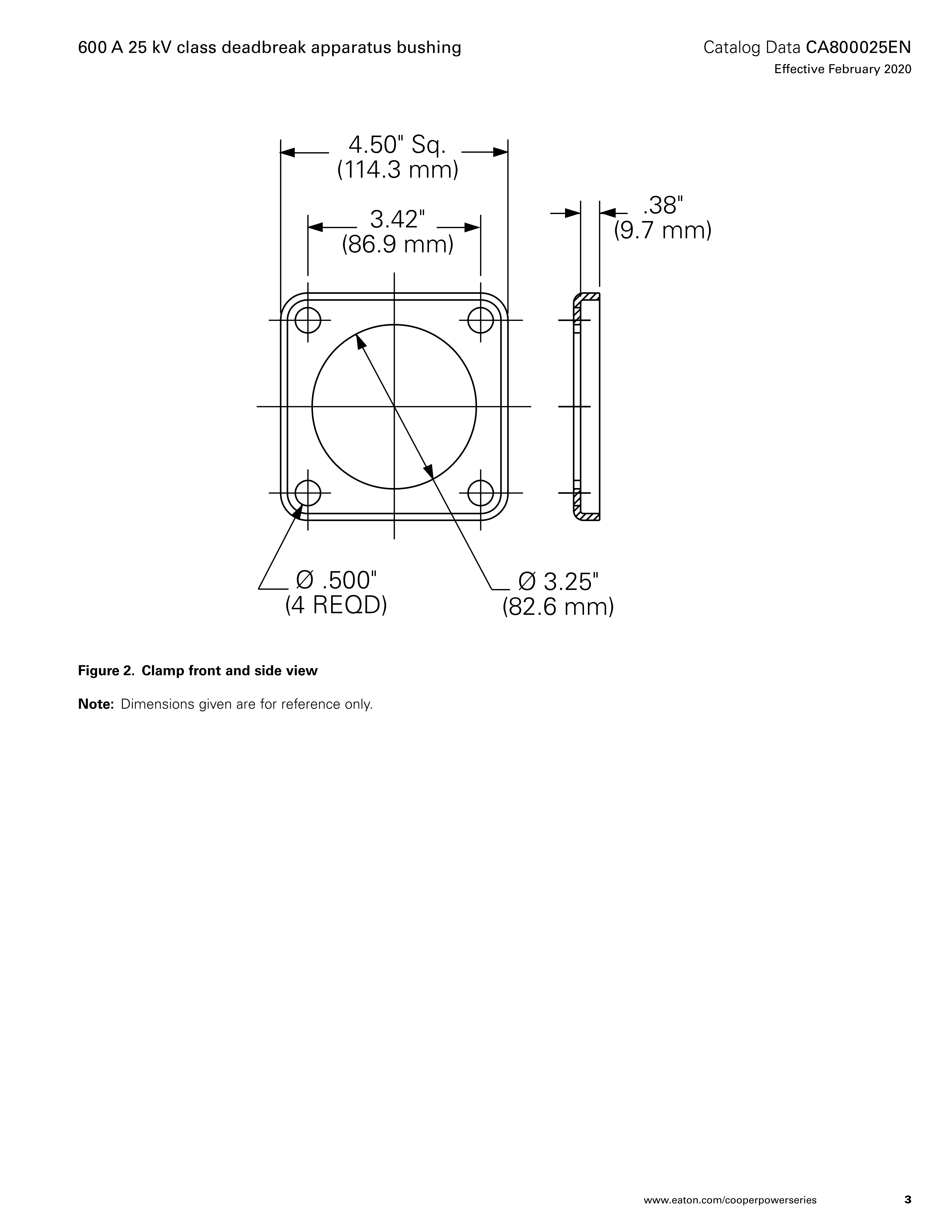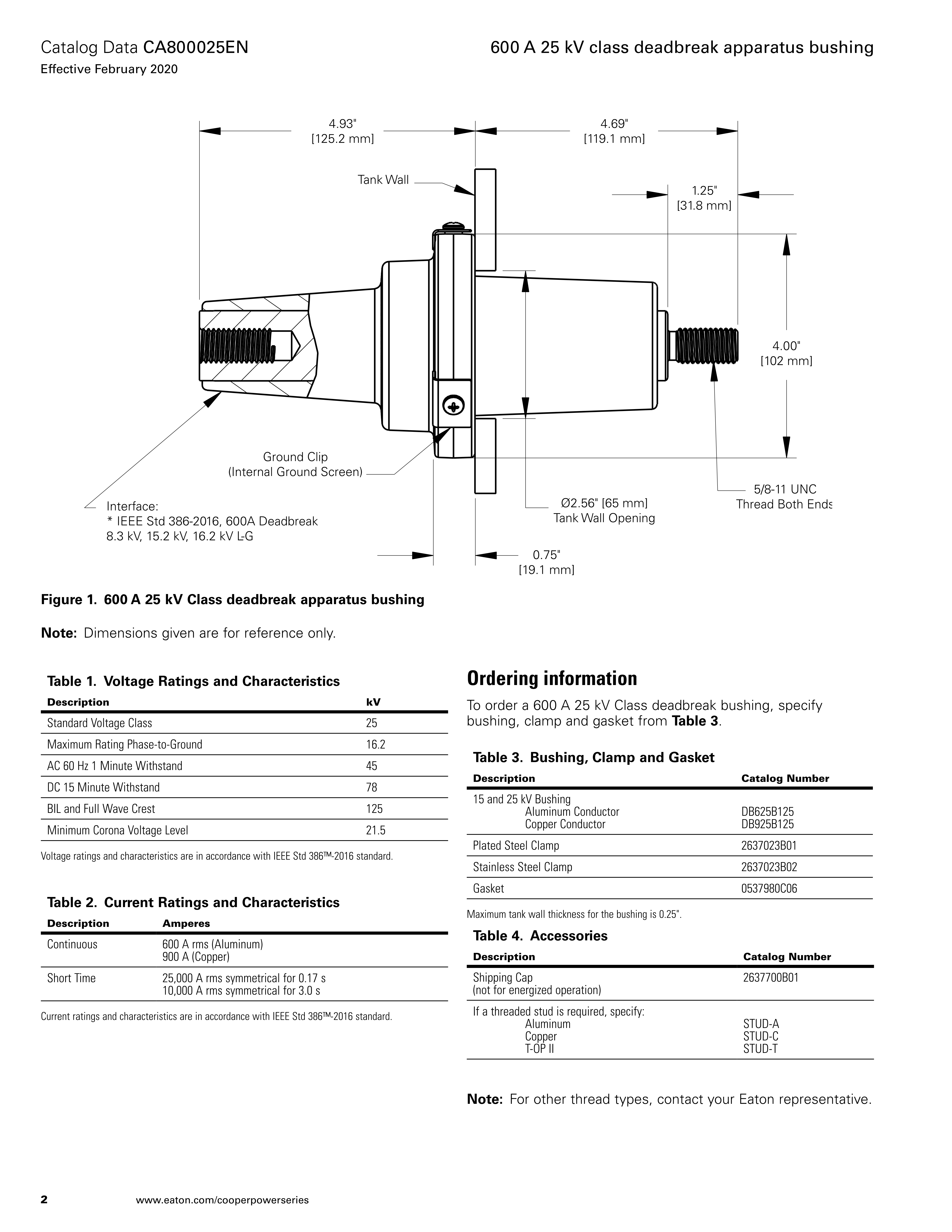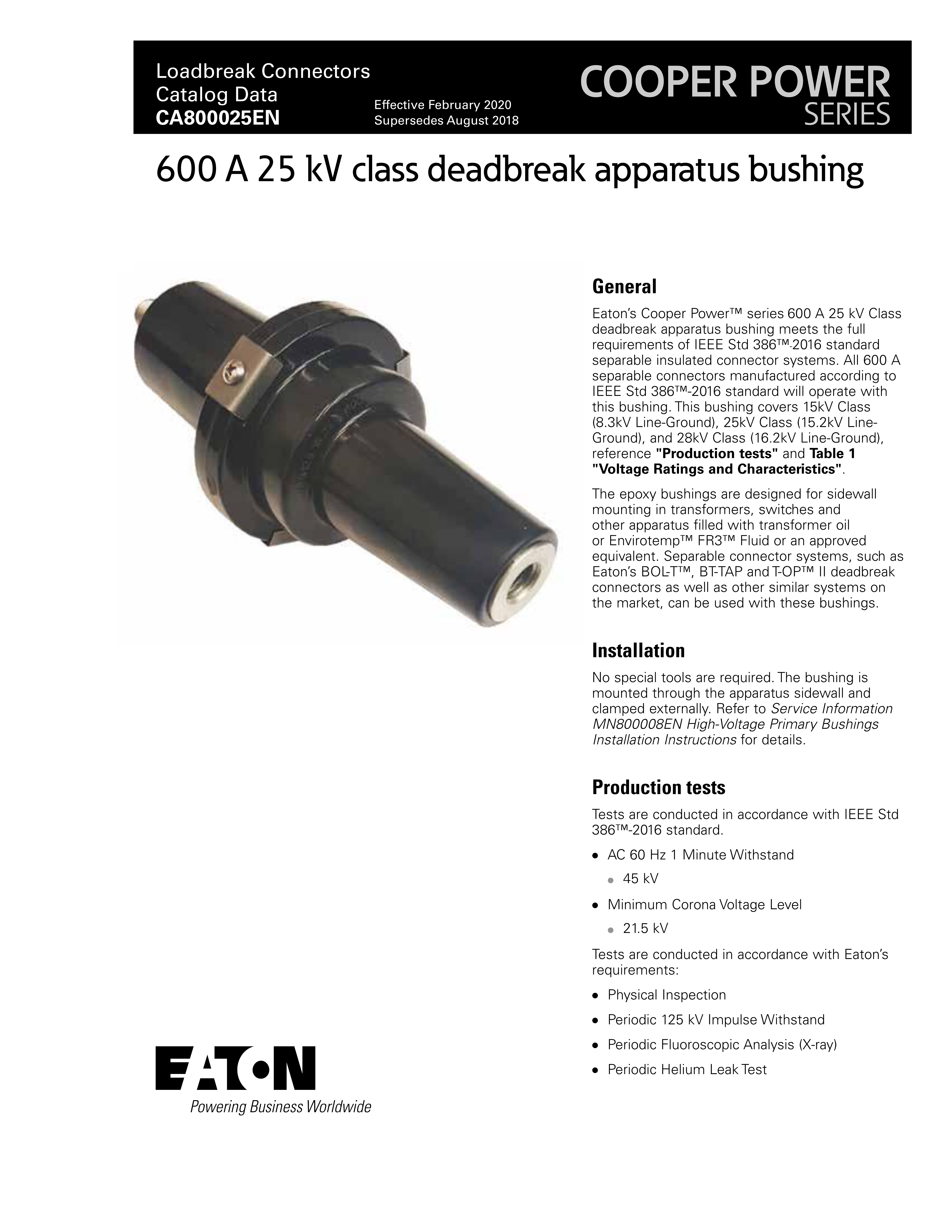 Eaton’s Cooper Power™ series 600 A 25 kV Class deadbreak apparatus bushing meets the full requirements of IEEE Std 386™-2016 standard separable insulated connector systems. All 600 A separable connectors manufactured according to IEEE Std 386™-2016 standard will operate with this bushing. This bushing covers 15kV Class (8.3kV Line-Ground), 25kV Class (15.2kV LineGround), and 28kV Class (16.2kV Line-Ground), reference "Production tests" and Table 1 "Voltage Ratings and Characteristics".