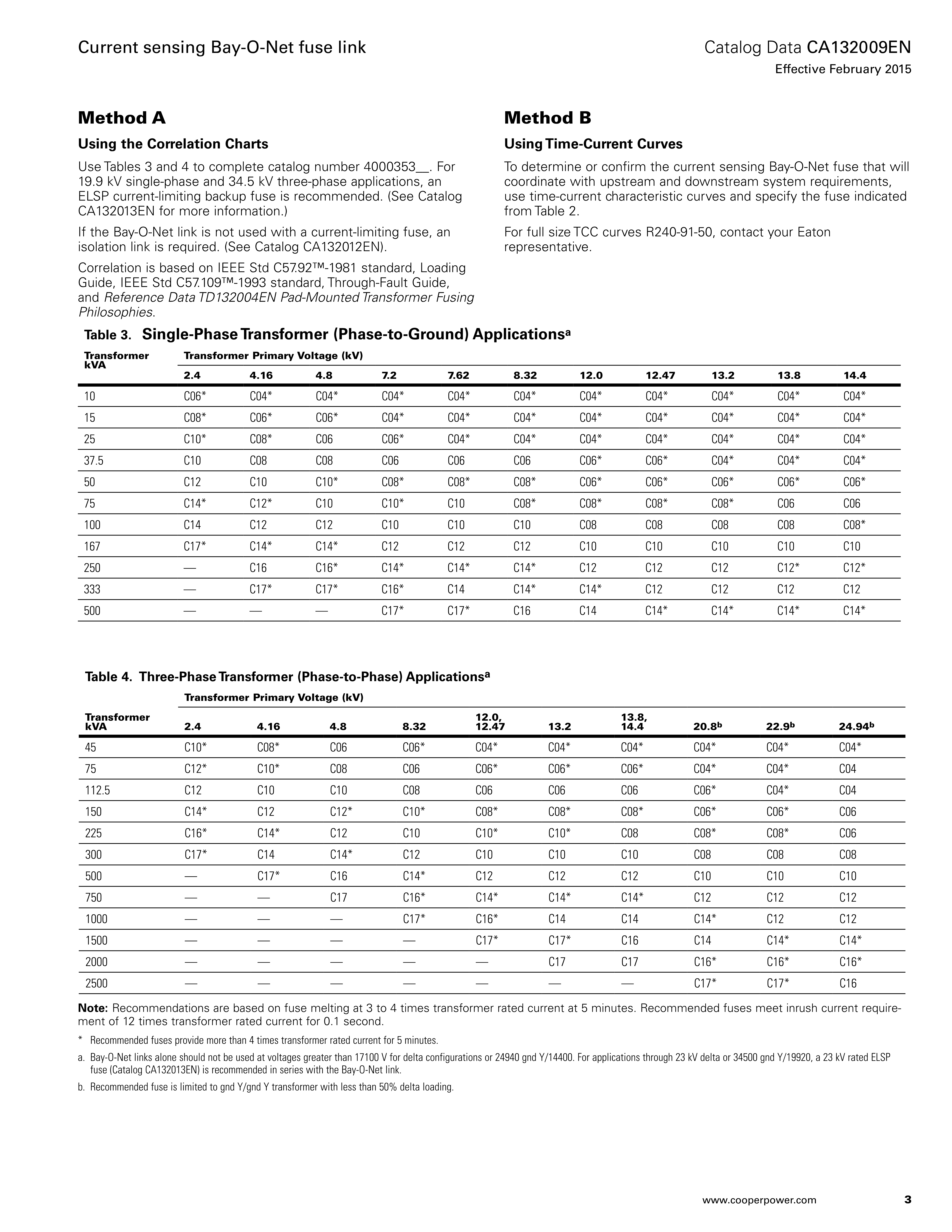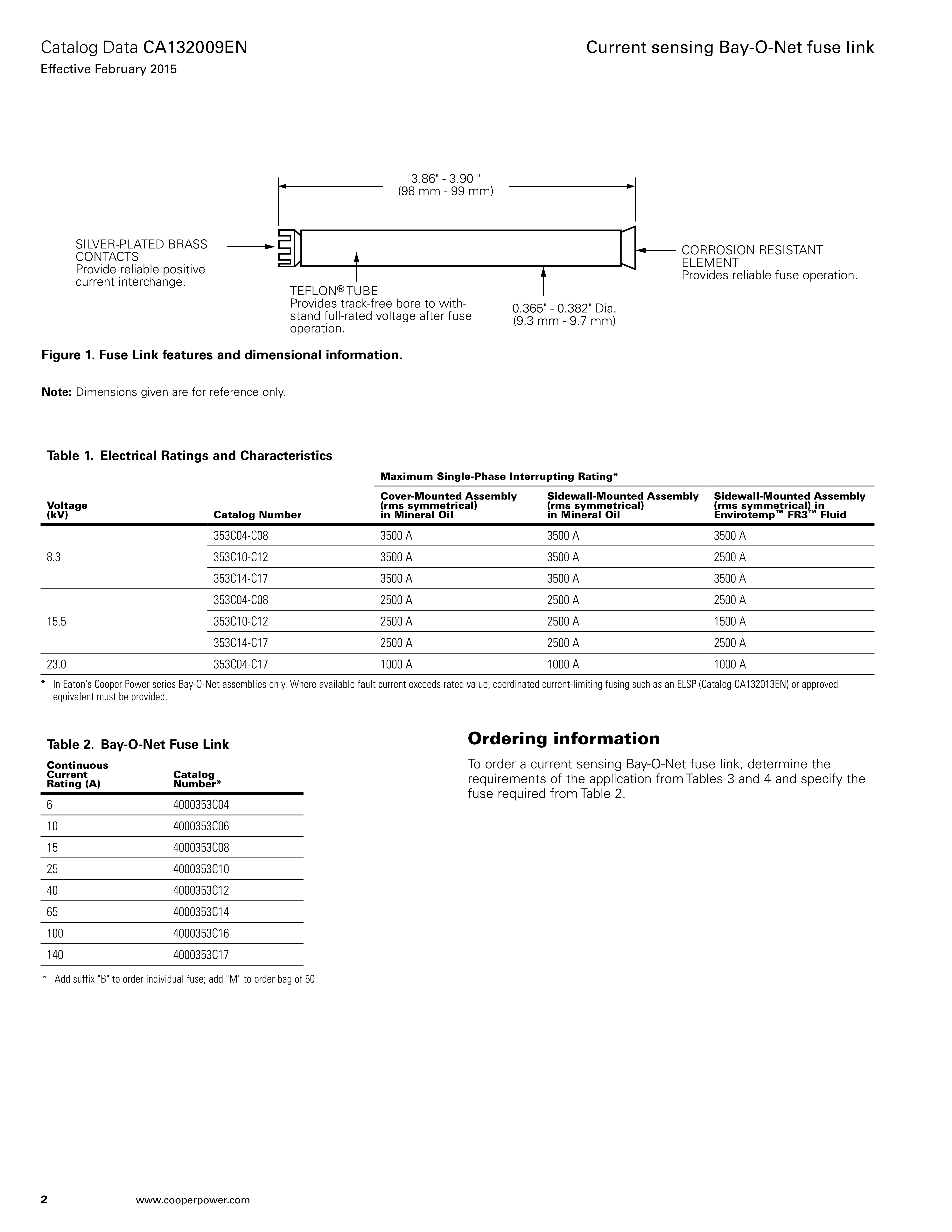 Eaton protects both distribution apparatus from damaging currents and distribution systems from failed apparatus with its Cooper Power series current sensing Bay-O-Net fuse link that is used in Eaton's Cooper Power series Bay-O-Net fuse assemblies (see Catalog CA132015EN SidewallMounted and Cover-Mounted Bay-O-Net Fuse Assembly). They are used on single-phase conventional and self-protected distribution transformers and other apparatus rated through 500 kVA, and on three-phase equipment through 1500 kVA.