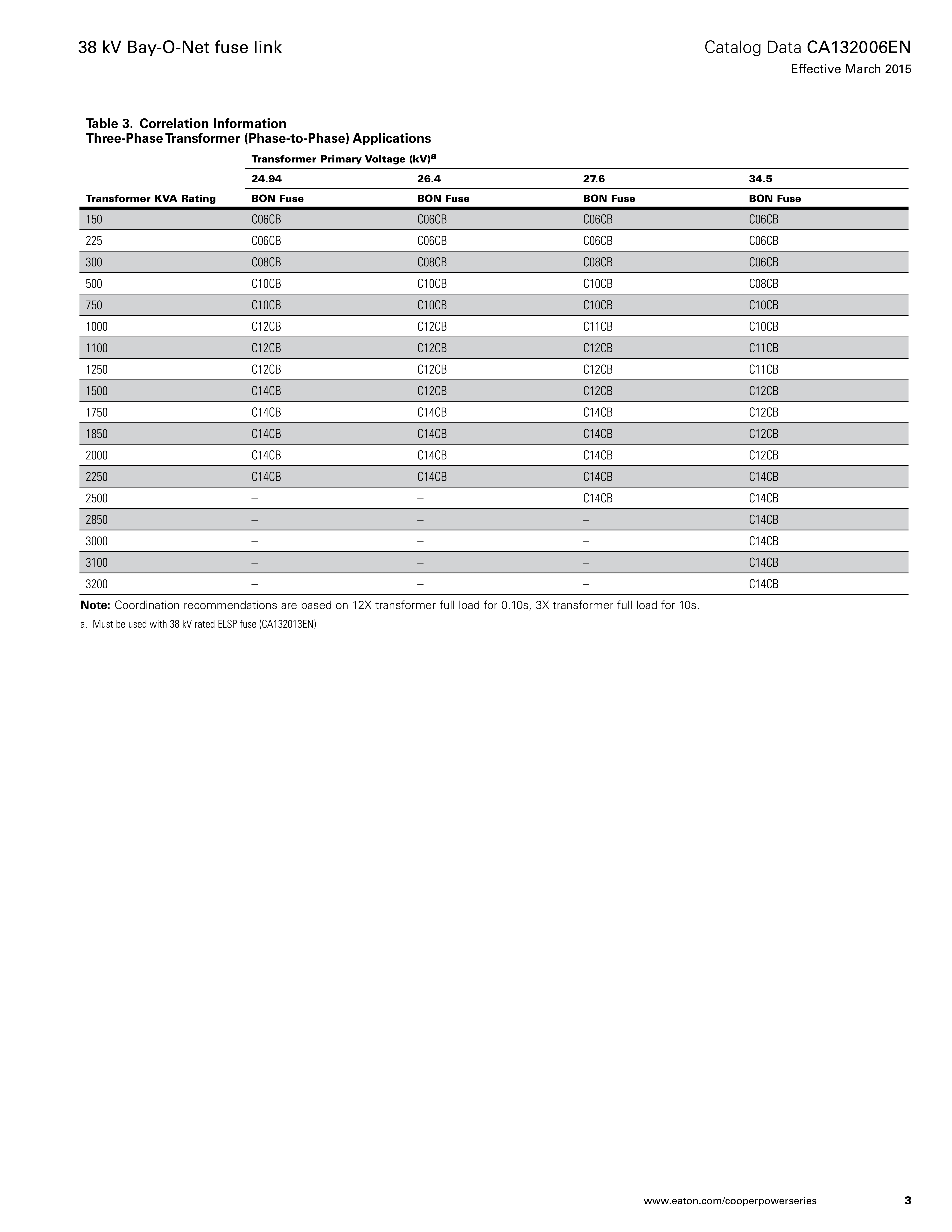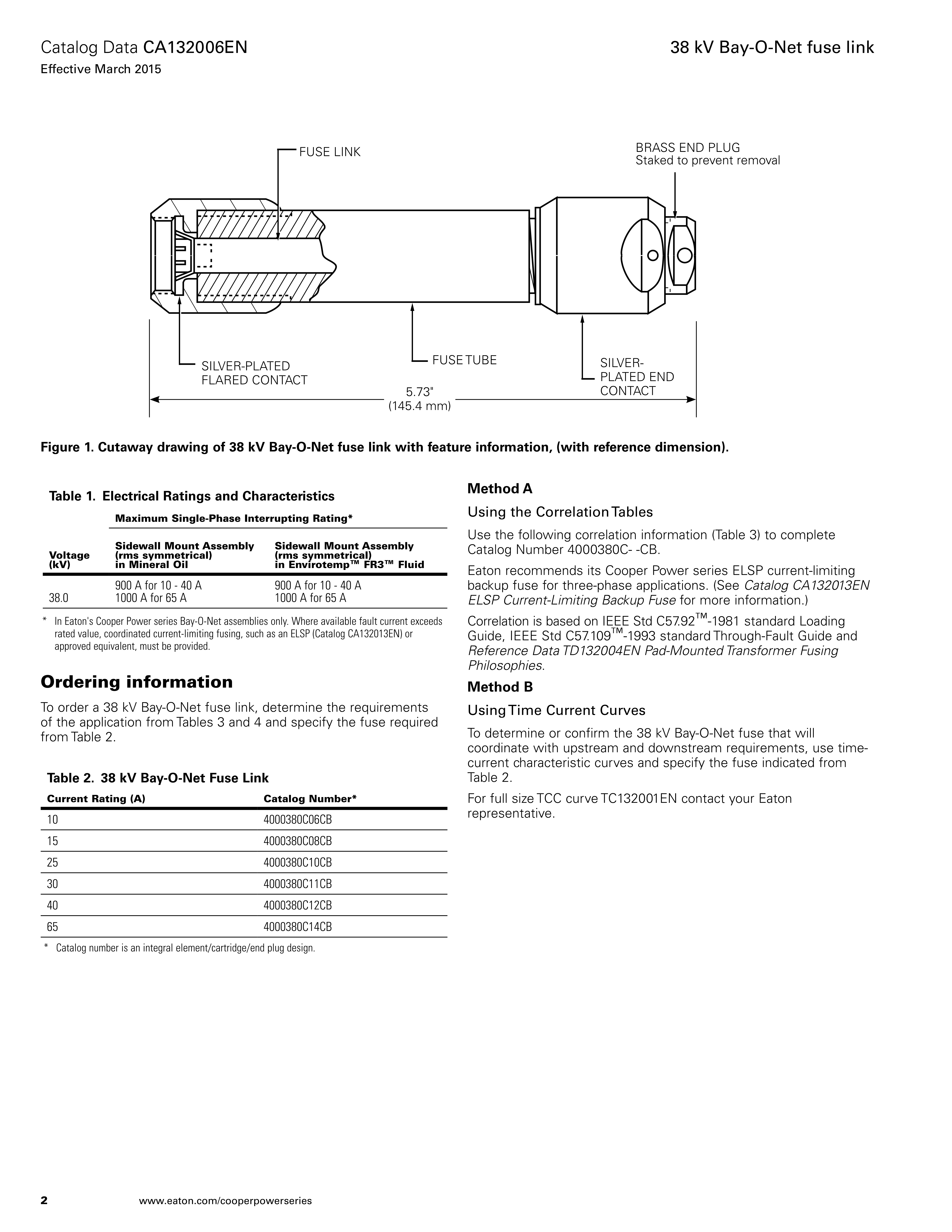 Eaton protects distribution apparatus from damaging currents and distribution systems from failed apparatus with its Cooper Power™ series 38 kV Bay-O-Net fuse link when used in Eaton's Cooper Power series 38 kV silver-plated Bay-O-Net assemblies. (See Catalog CA132015EN 23 kV and 38 kV Sidewall-Mounted and 23 kV Cover-Mounted Bay-O-Net Fuse Assembly for information about the fuse assembly).