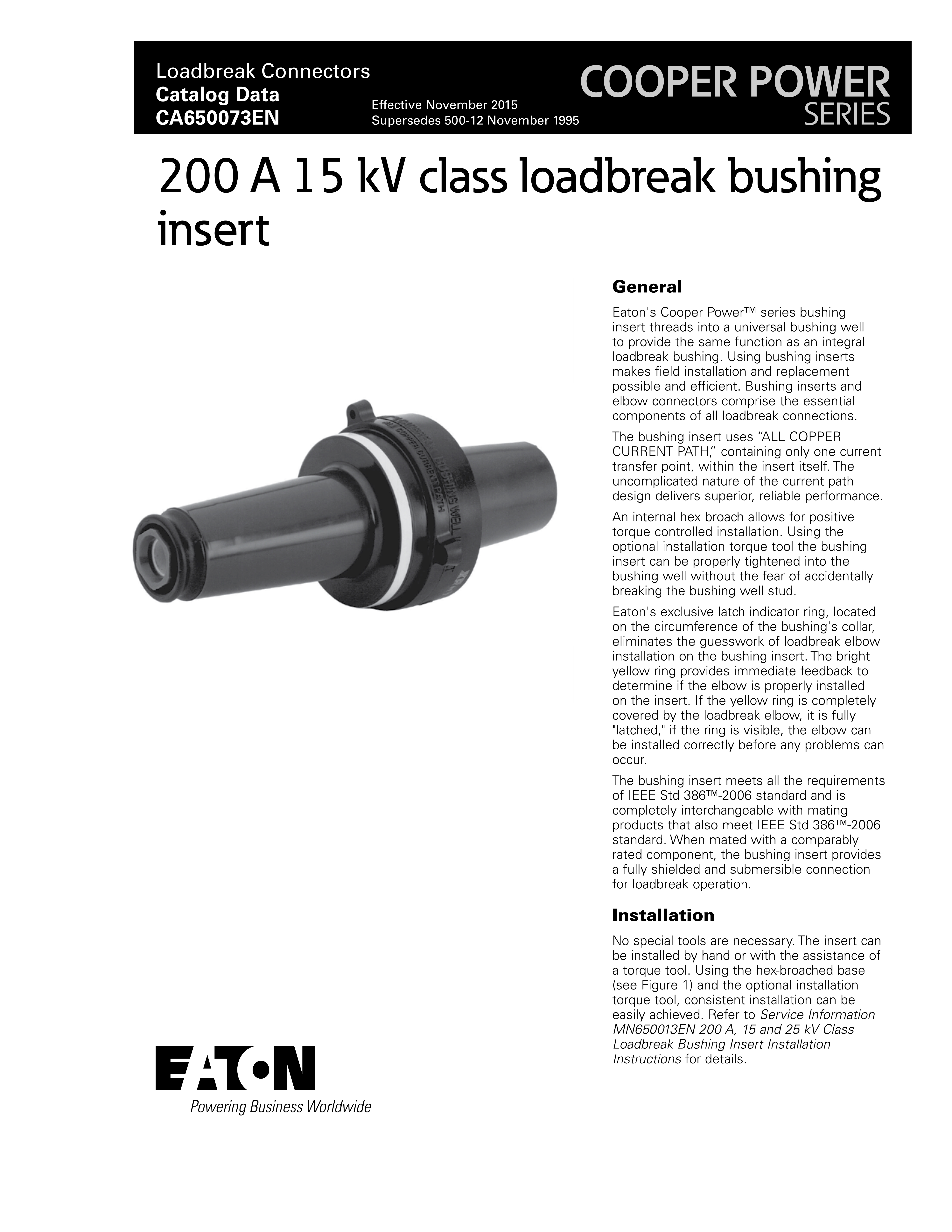 No special tools are necessary. The insert can be installed by hand or with the assistance of a torque tool. Using the hex-broached base (see Figure 1) and the optional installation torque tool, consistent installation can be easily achieved. Refer to Service Information MN650013EN 200 A, 15 and 25 kV Class Loadbreak Bushing Insert Installation Instructions for details.