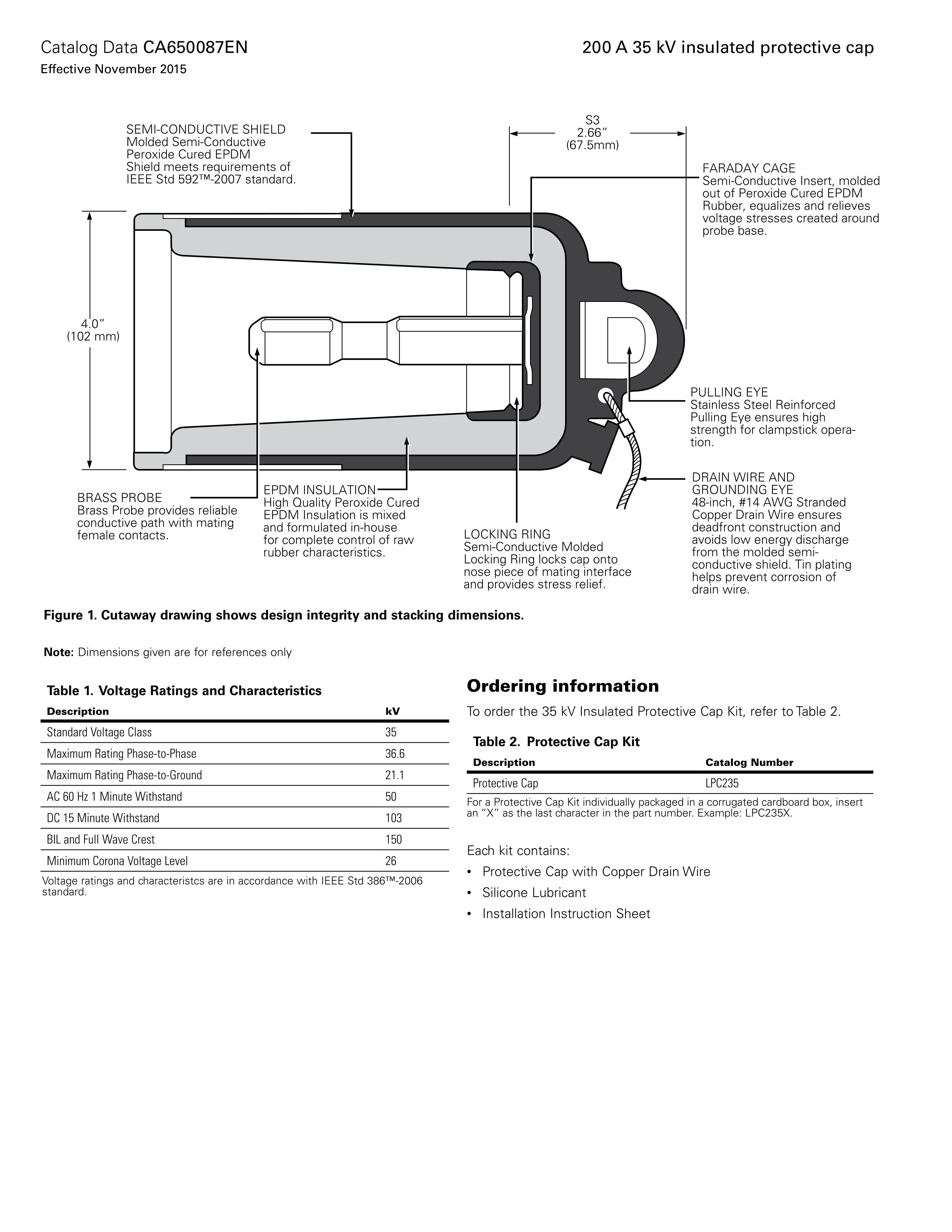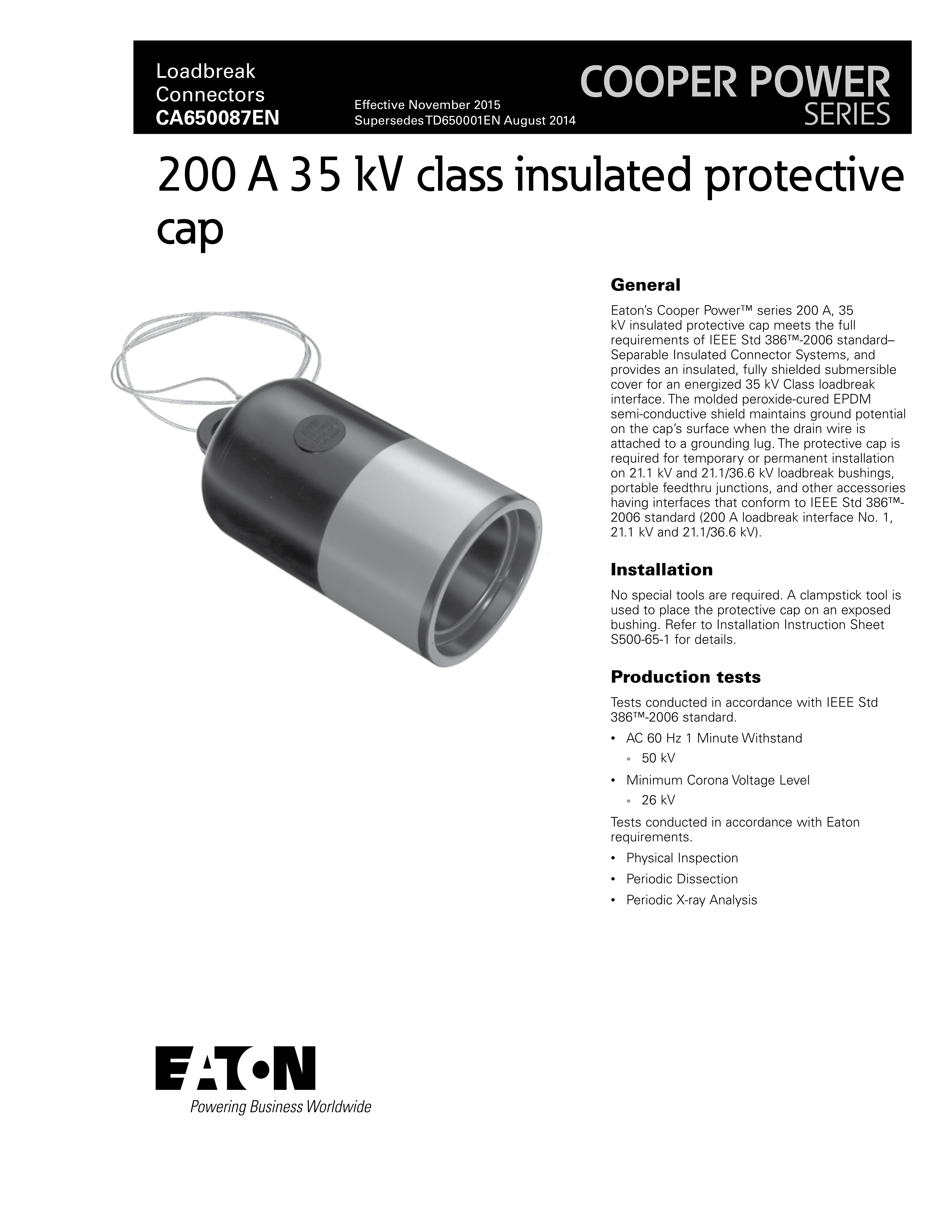 Eaton’s Cooper Power™ series 200 A, 35 kV insulated protective cap meets the full requirements of IEEE Std 386™-2006 standard– Separable Insulated Connector Systems, and provides an insulated, fully shielded submersible cover for an energized 35 kV Class loadbreak interface. The molded peroxide-cured EPDM semi-conductive shield maintains ground potential on the cap’s surface when the drain wire is attached to a grounding lug. The protective cap is required for temporary or permanent installation on 21.1 kV and 21.1/36.6 kV loadbreak bushings, portable feedthru junctions, and other accessories having interfaces that conform to IEEE Std 386™- 2006 standard (200 A loadbreak interface No. 1, 21.1 kV and 21.1/36.6 kV).