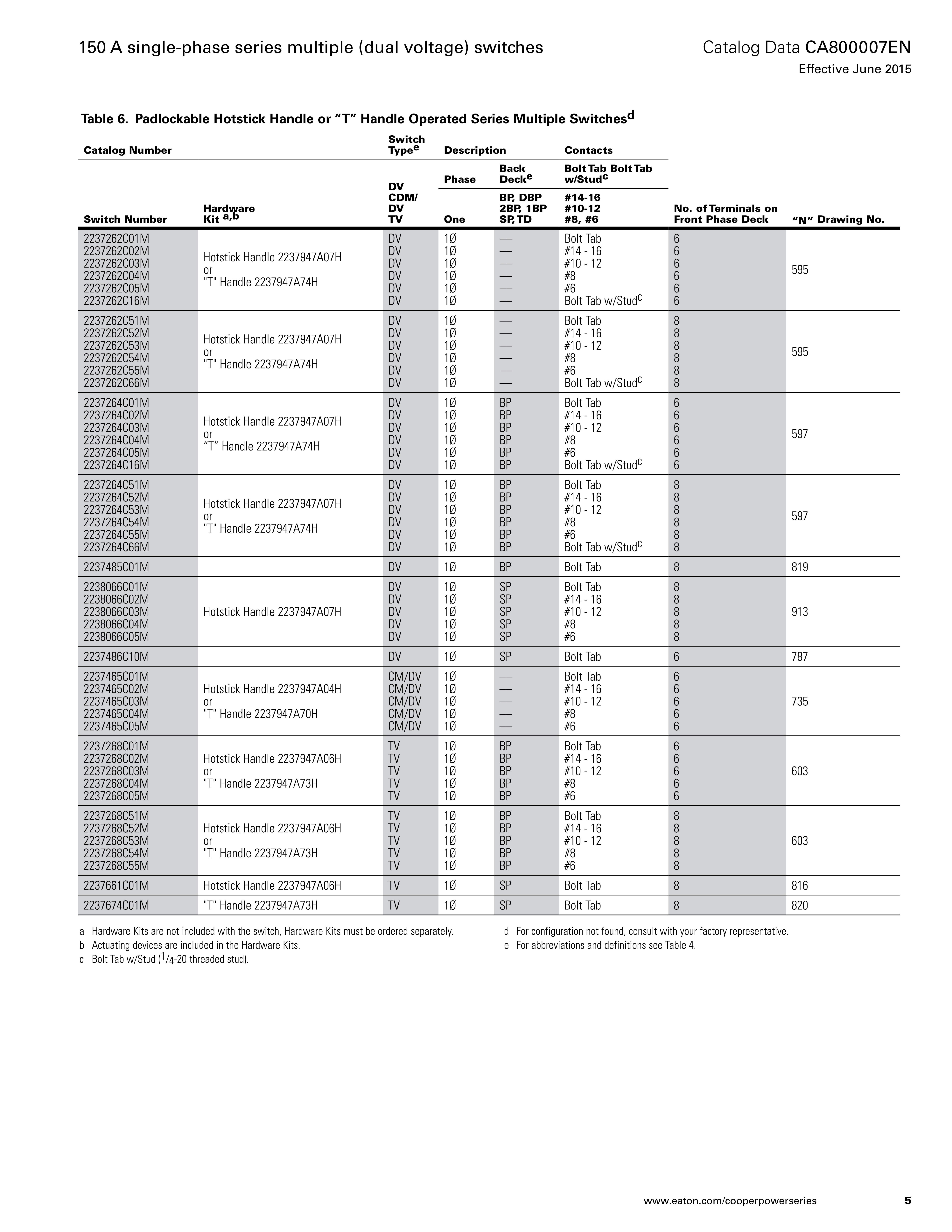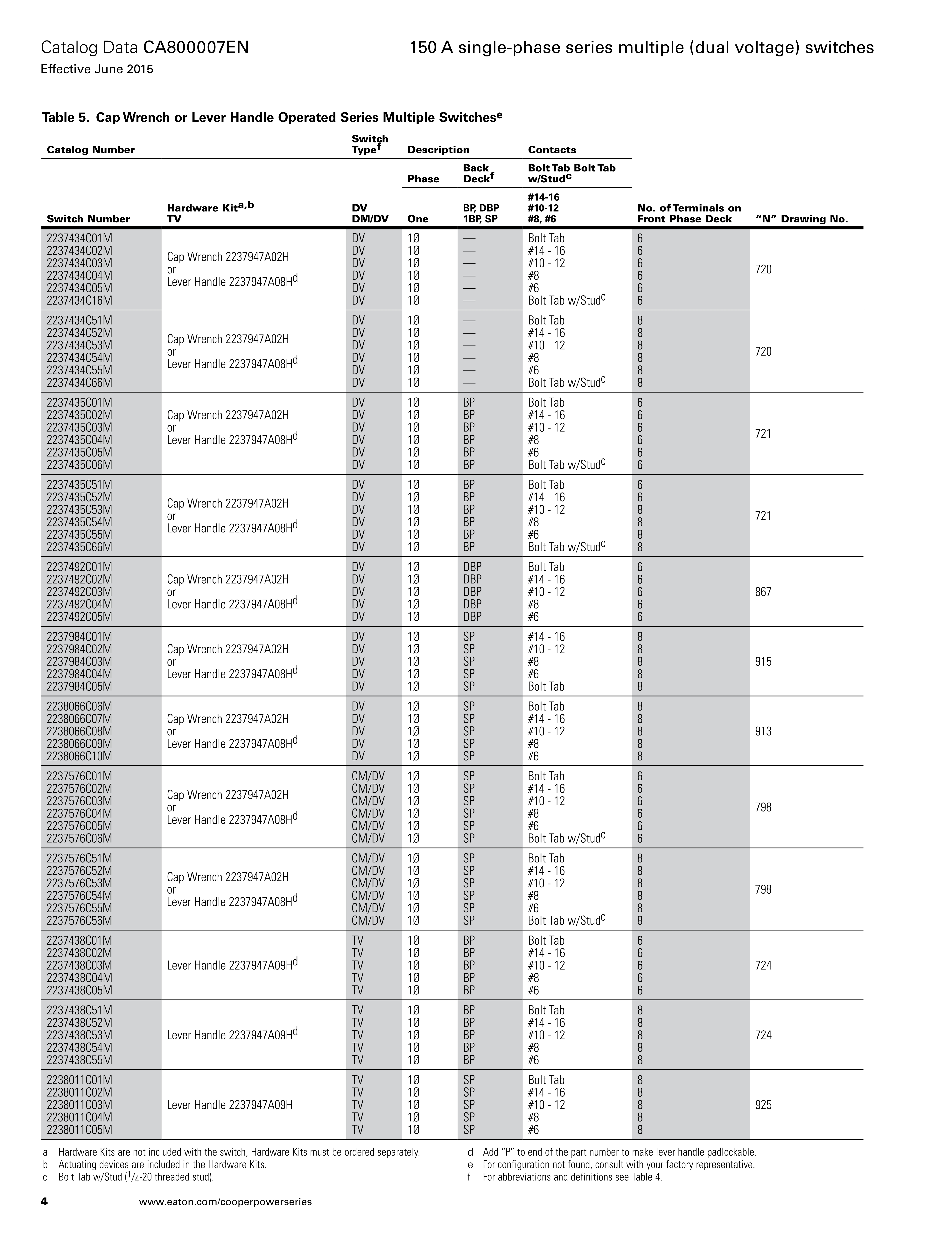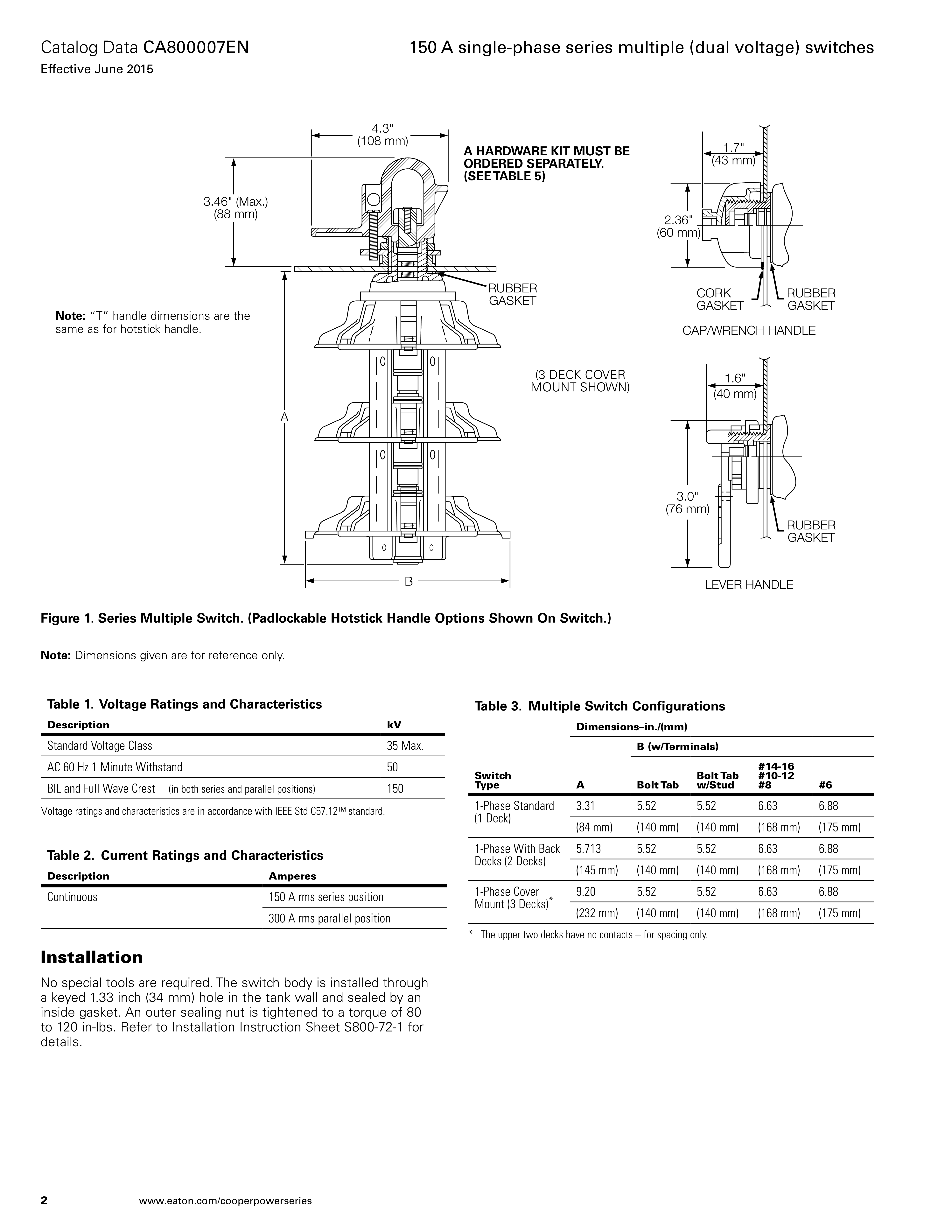 Series multiple (dual voltage) switches are available with cap/wrench, lever, “T”, or hotstick-operable handles. The lever handle has an indexing screw to ensure complete, positive switch contact. The cap/wrench handle has an innovative “one-way-in/ one-way-out” operating feature that ensures positive operation. The threaded cap protects the shaft seal. The spring-loaded pad lockable handle is hotstick-operable. It allows greater leverage and provides positive indication of switch position.