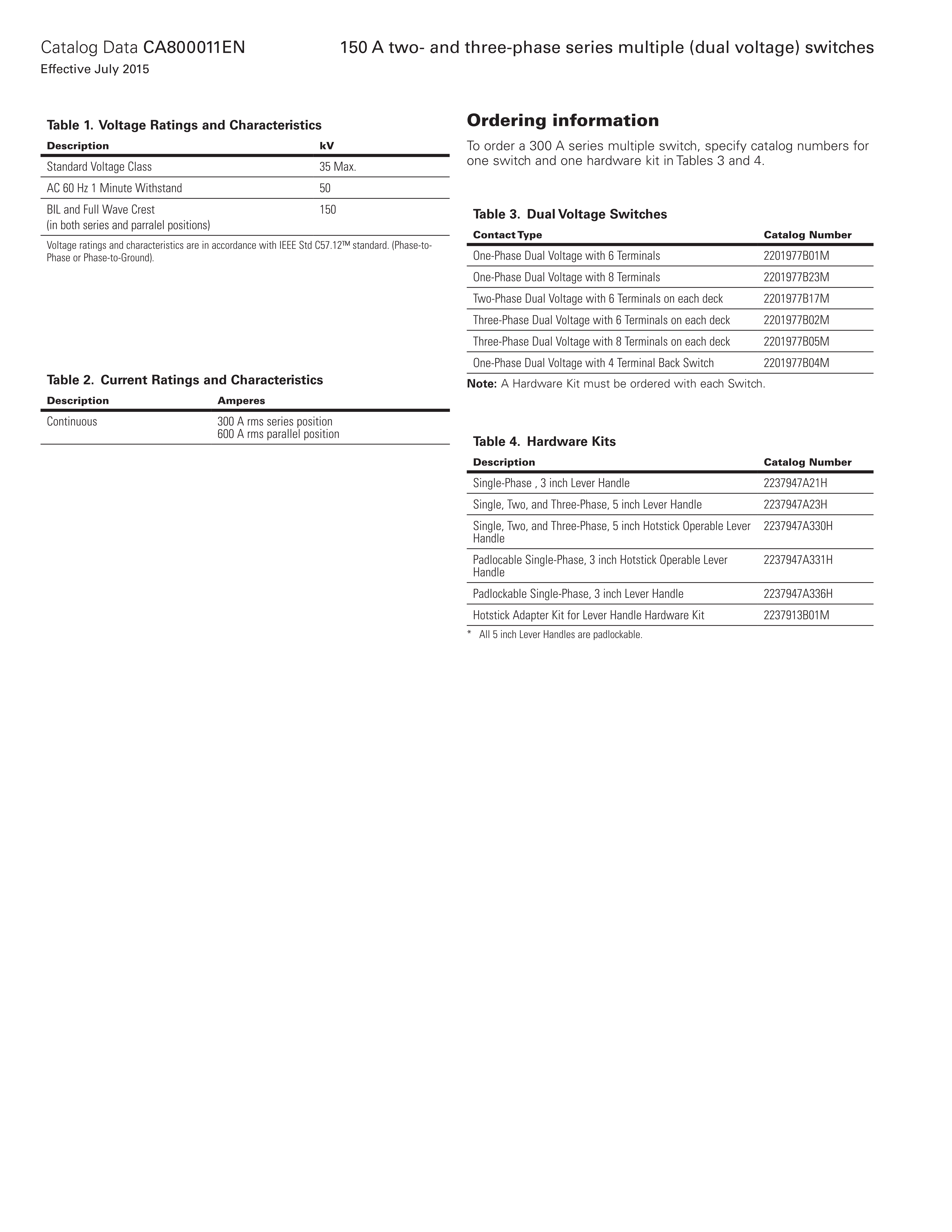 Series multiple switches have pad-lockable, hotstick-operable handles, which provide greater leverage and positive indication of switch position. The switch shaft is made from high strength steel and is sealed against leakage by two high temperature resistant Viton® O-Rings. The switch body and rotor are made of a glass-reinforced polyester. The spring tempered high conductivity copper pinch-type rotor contacts provide dependable self-cleaning action.