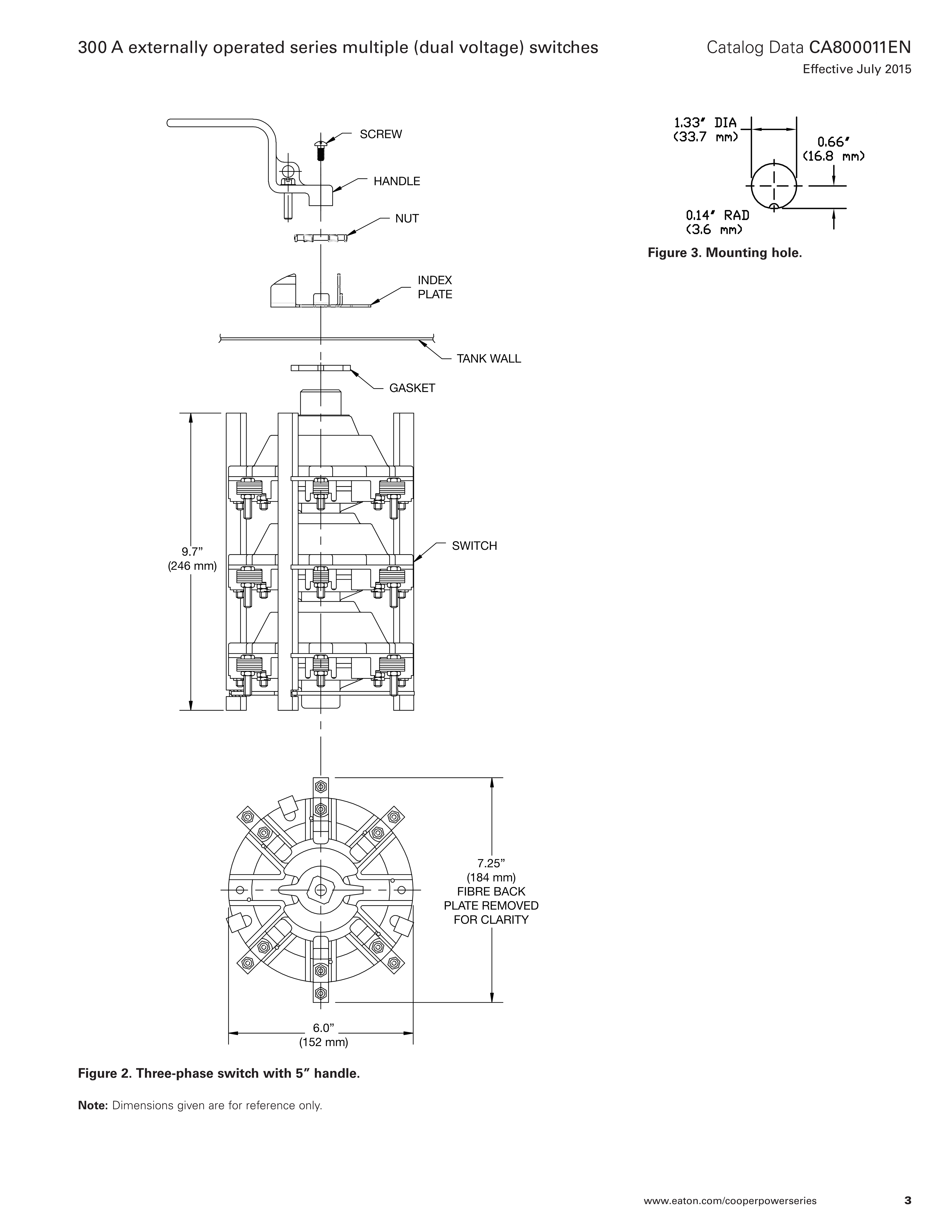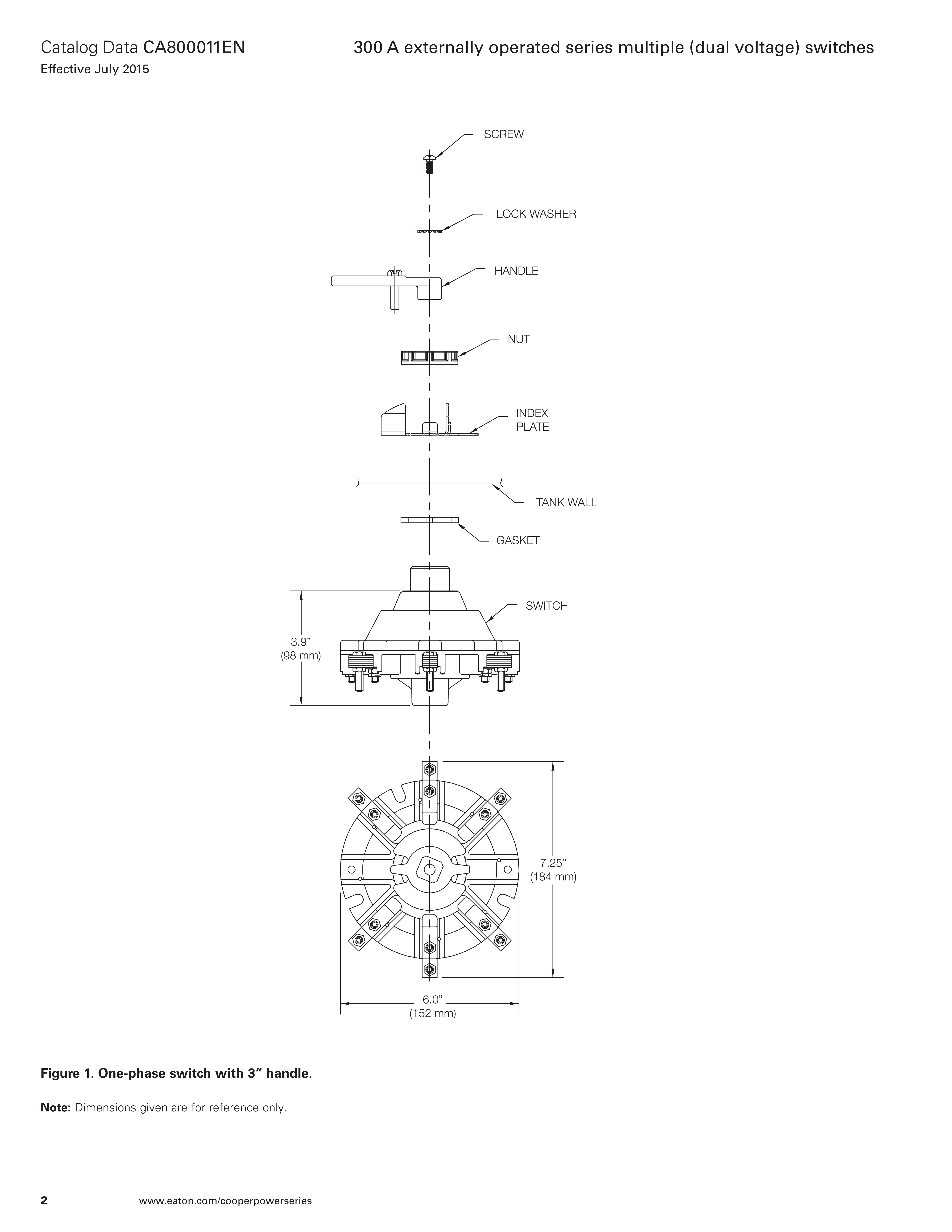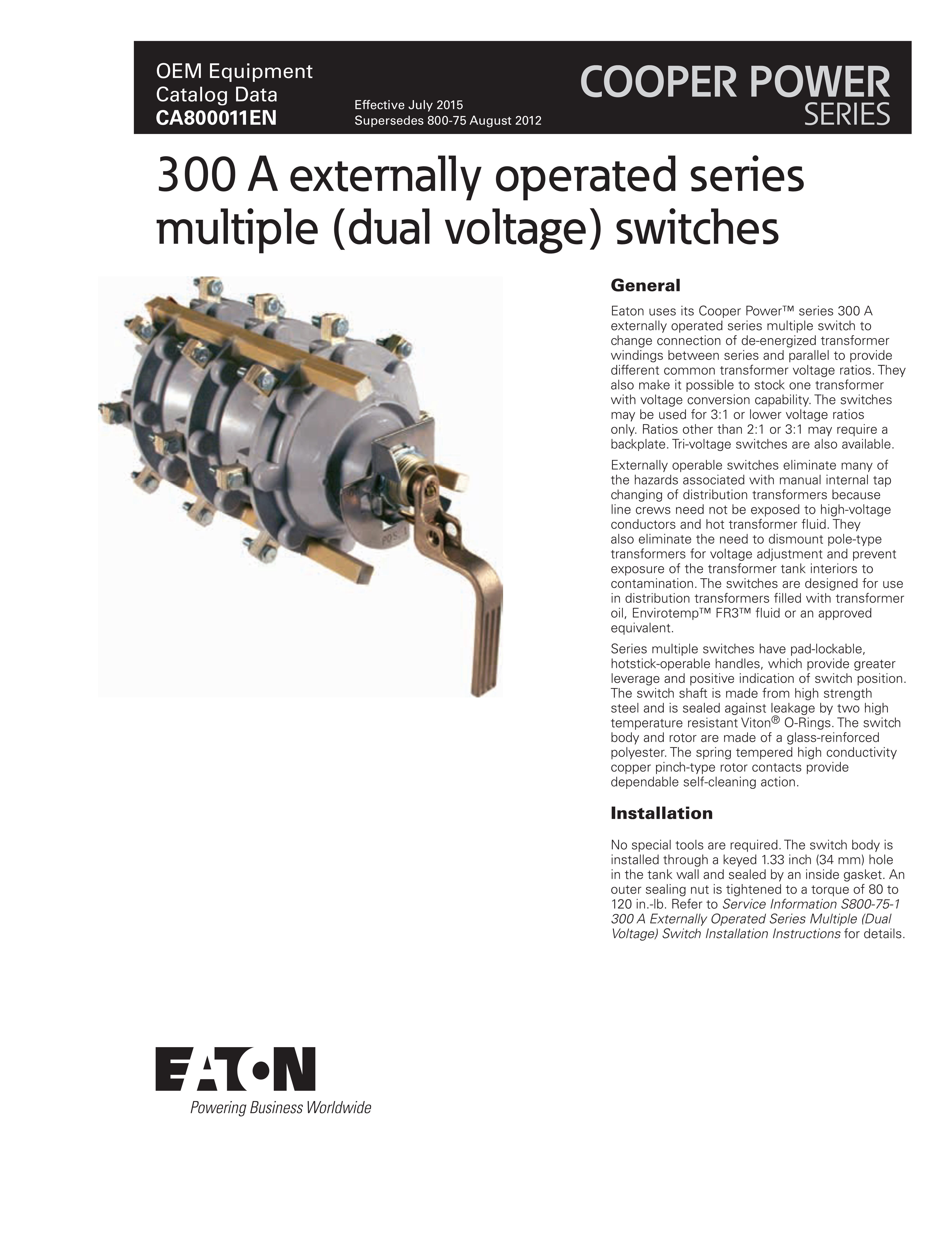 Eaton uses its Cooper Power™ series 300 A externally operated series multiple switch to change connection of de-energized transformer windings between series and parallel to provide different common transformer voltage ratios. They also make it possible to stock one transformer with voltage conversion capability. The switches may be used for 3:1 or lower voltage ratios only. Ratios other than 2:1 or 3:1 may require a backplate. Tri-voltage switches are also available.