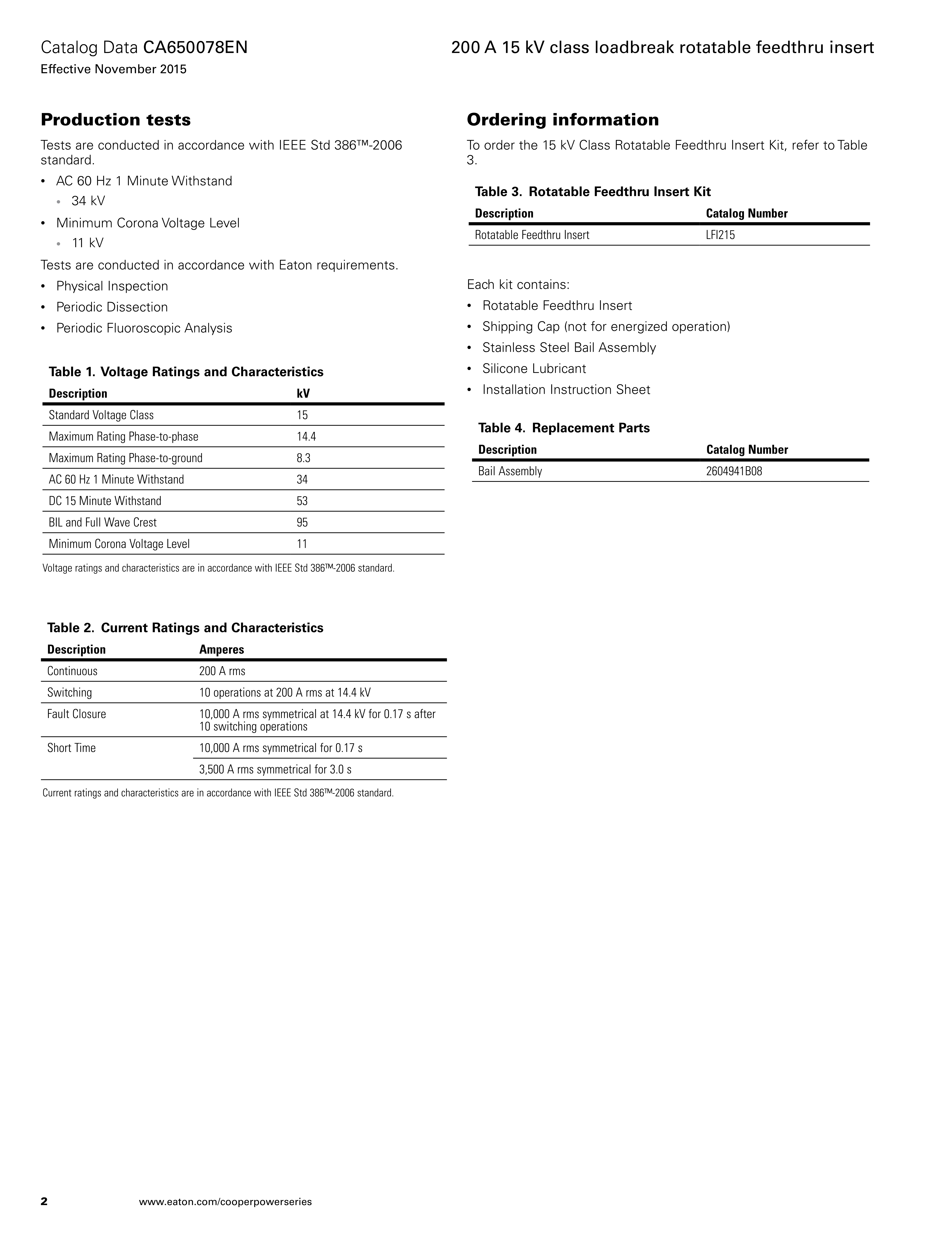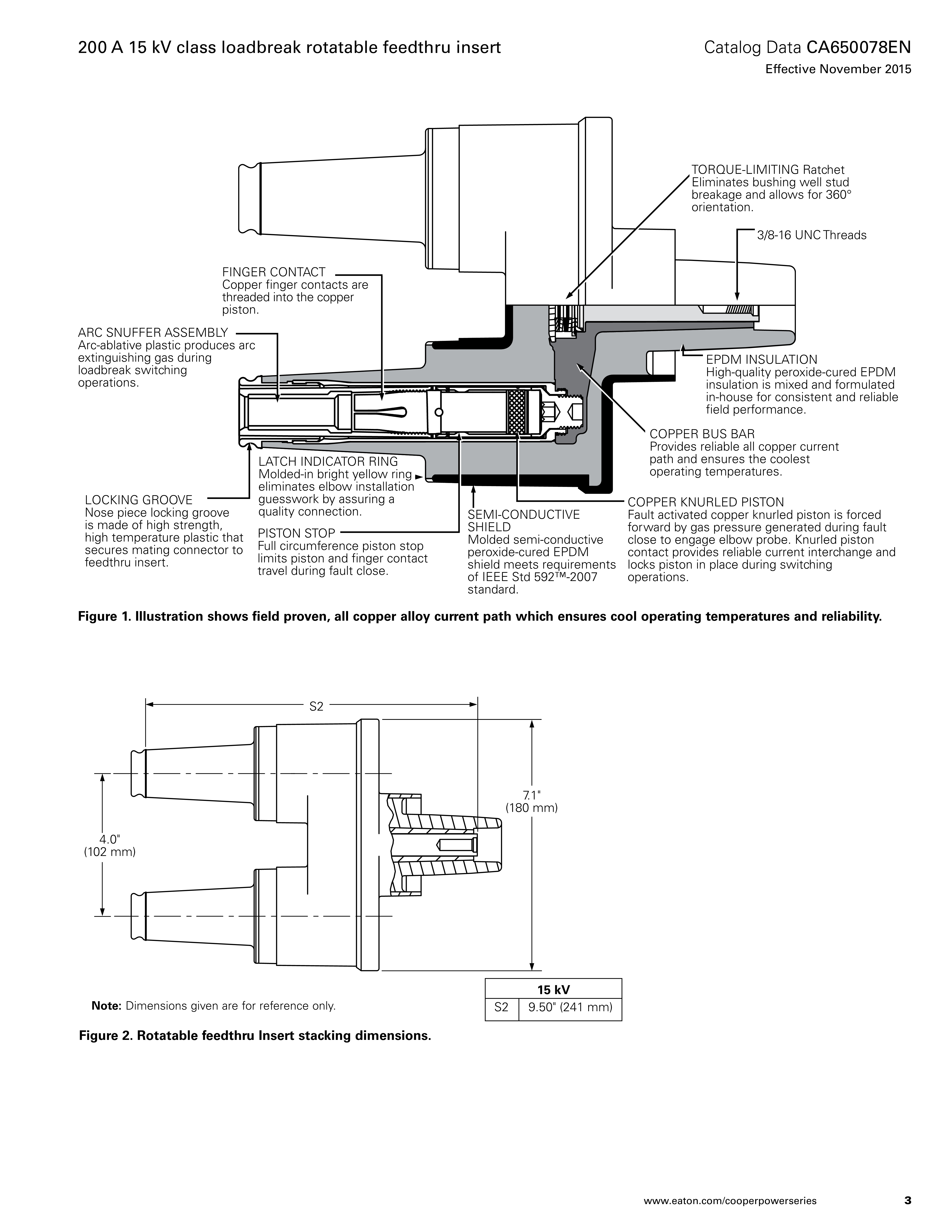 The rotatable feedthru insert incorporates an all copper current path and peroxide-cured EPDM insulation and semiconducting shield. It fully meets the requirements of IEEE Std 386™-2006 standard. When mated with comparably rated products, the insert provides a fully shielded and submersible loadbreak apparatus connection.
