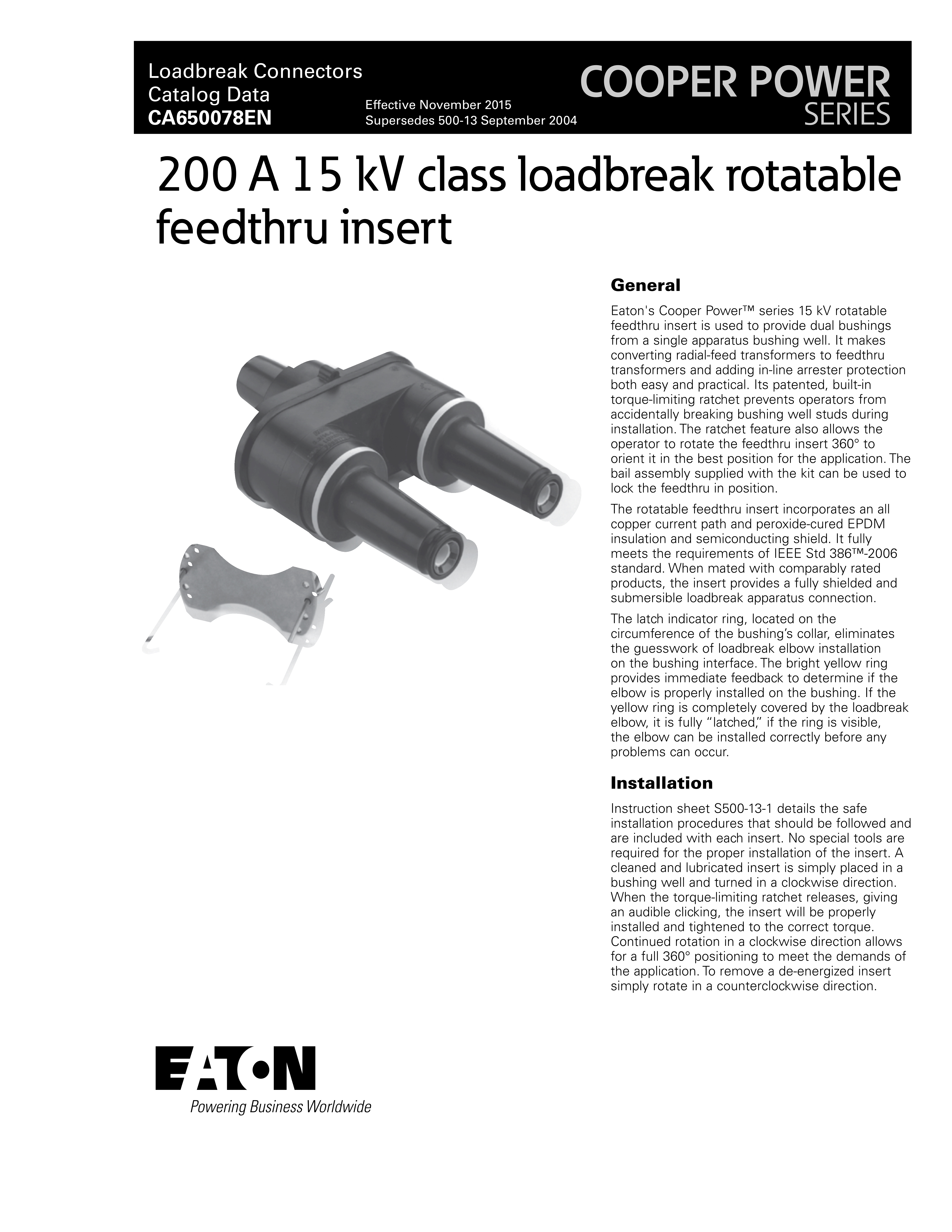 Eaton's Cooper Power™ series 15 kV rotatable feedthru insert is used to provide dual bushings from a single apparatus bushing well. It makes converting radial-feed transformers to feedthru transformers and adding in-line arrester protection both easy and practical. Its patented, built-in torque-limiting ratchet prevents operators from accidentally breaking bushing well studs during installation. The ratchet feature also allows the operator to rotate the feedthru insert 360° to orient it in the best position for the application. The bail assembly supplied with the kit can be used to lock the feedthru in position.