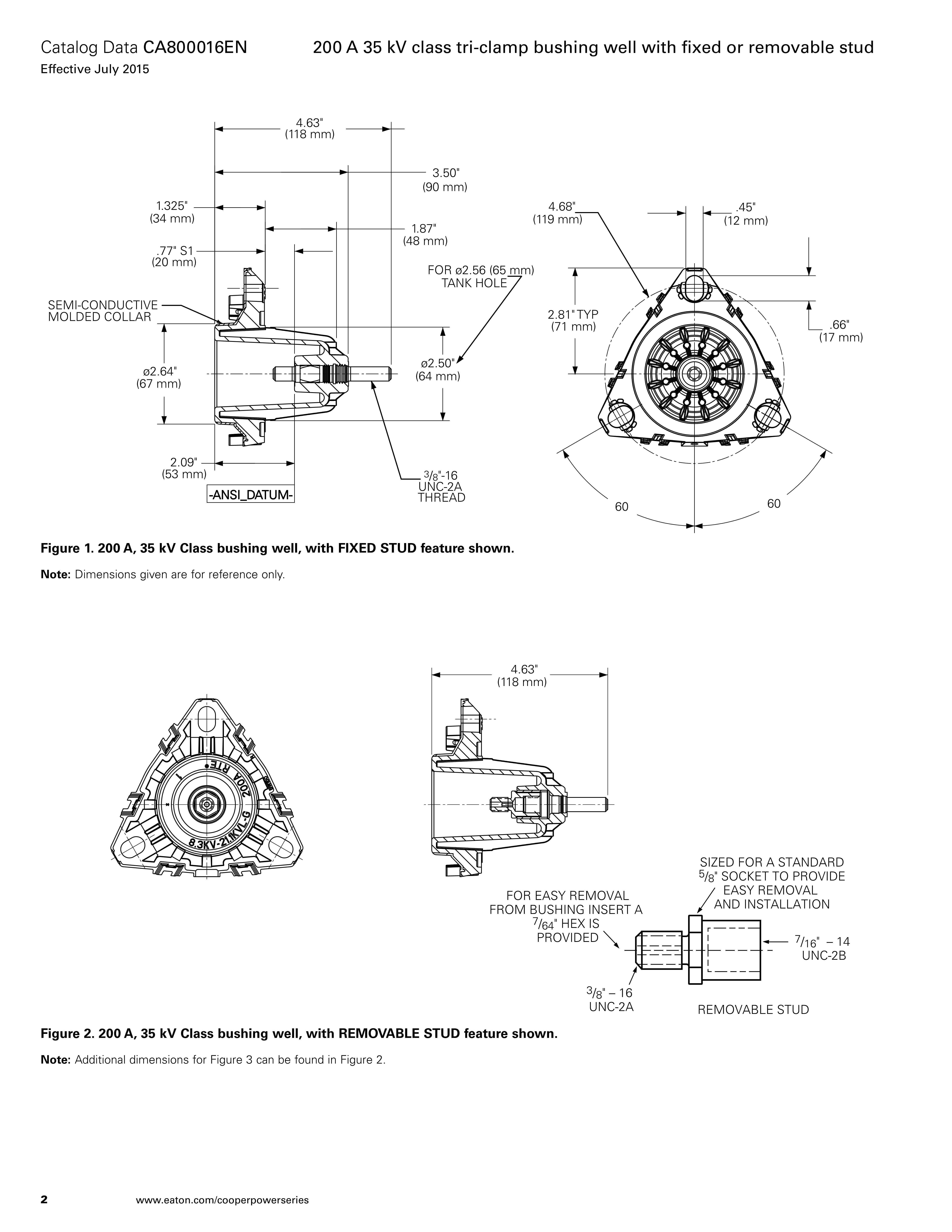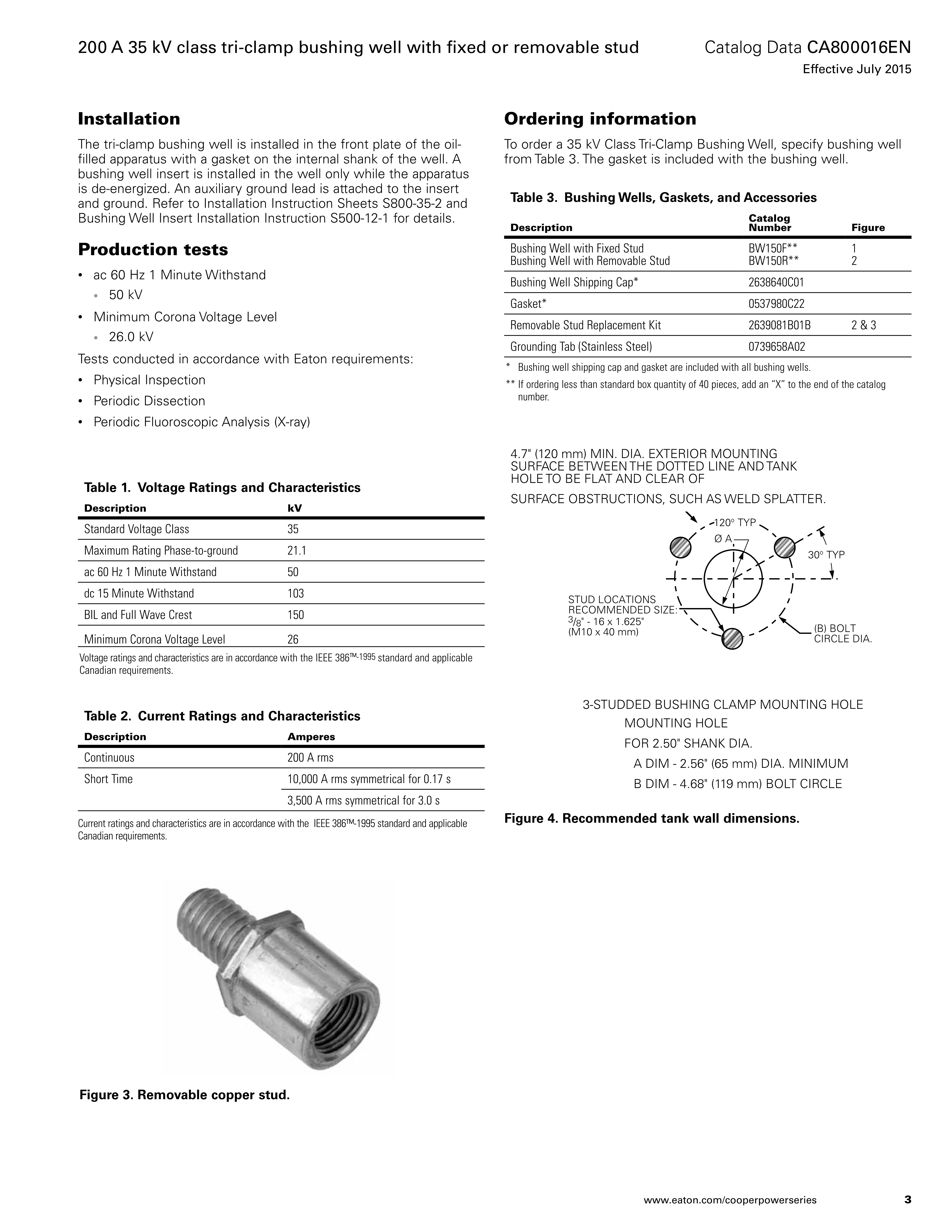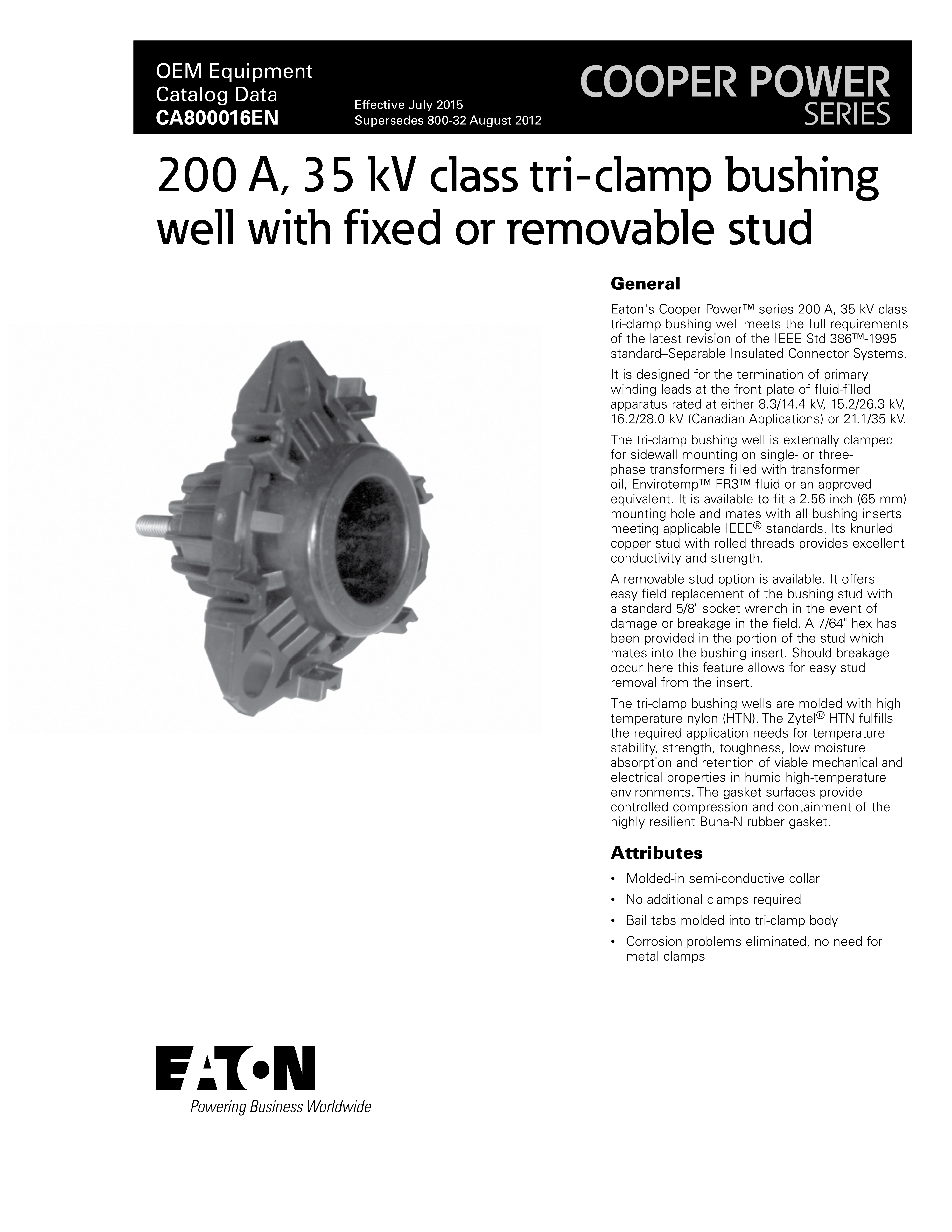 Eaton's Cooper Power™ series 200 A, 35 kV class tri-clamp bushing well meets the full requirements of the latest revision of the IEEE Std 386™-1995 standard–Separable Insulated Connector Systems.