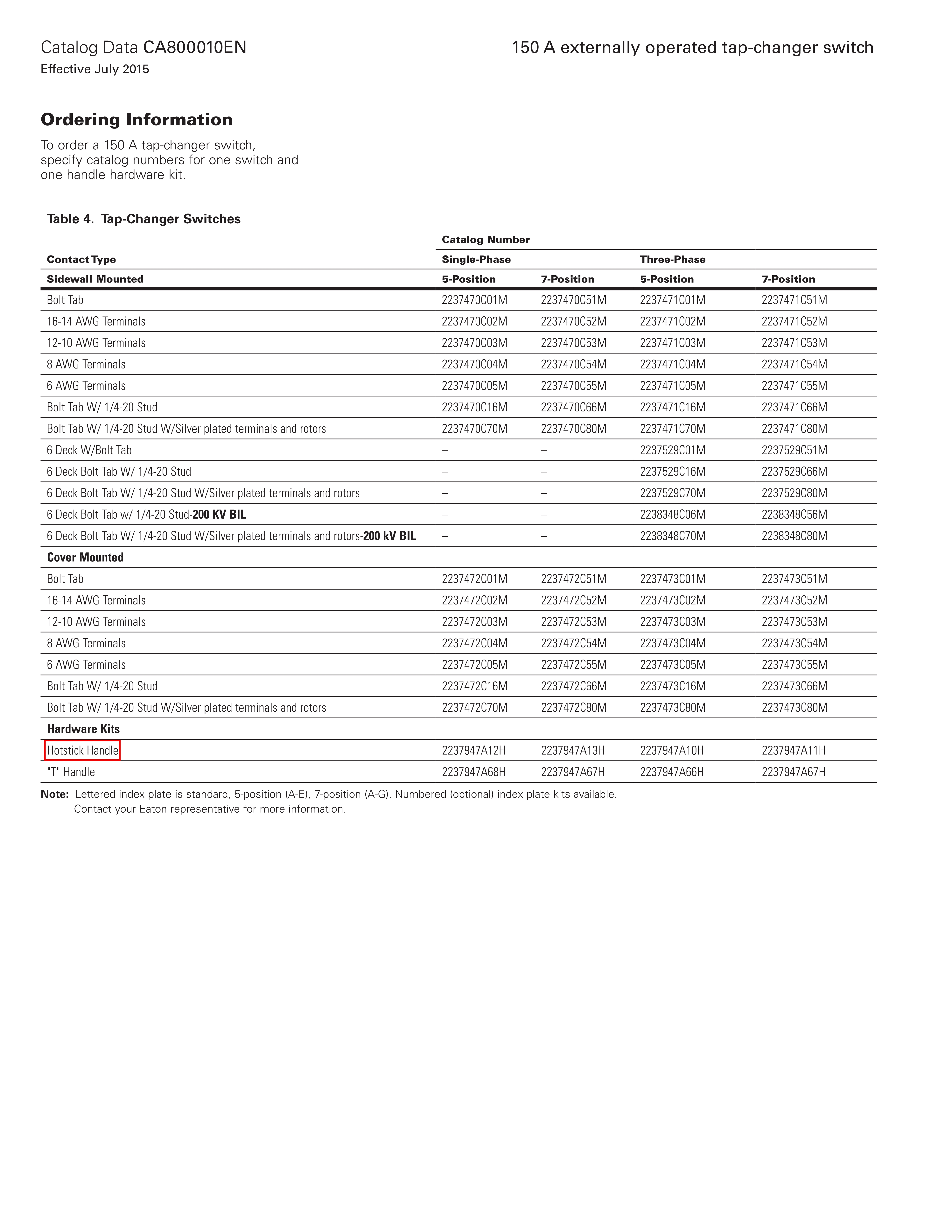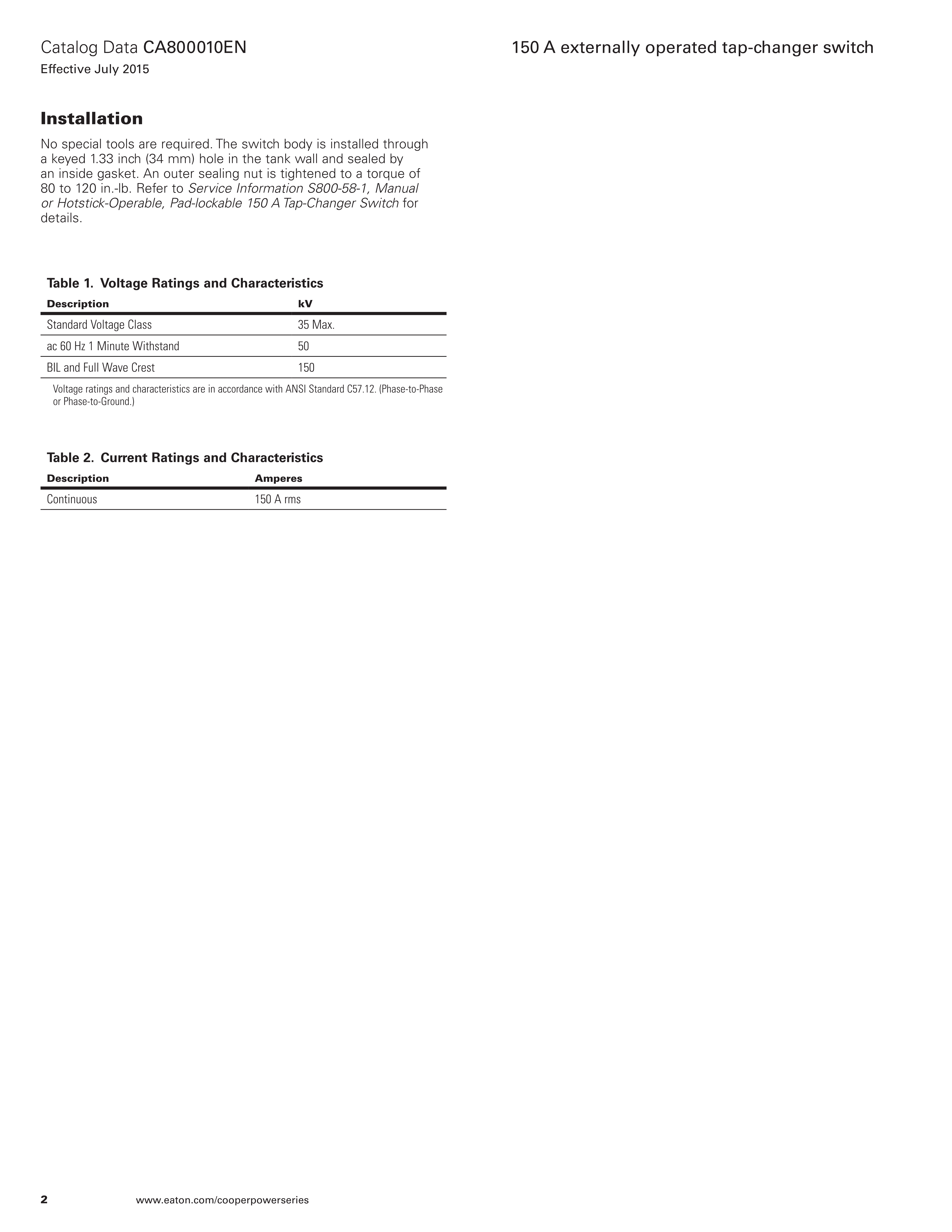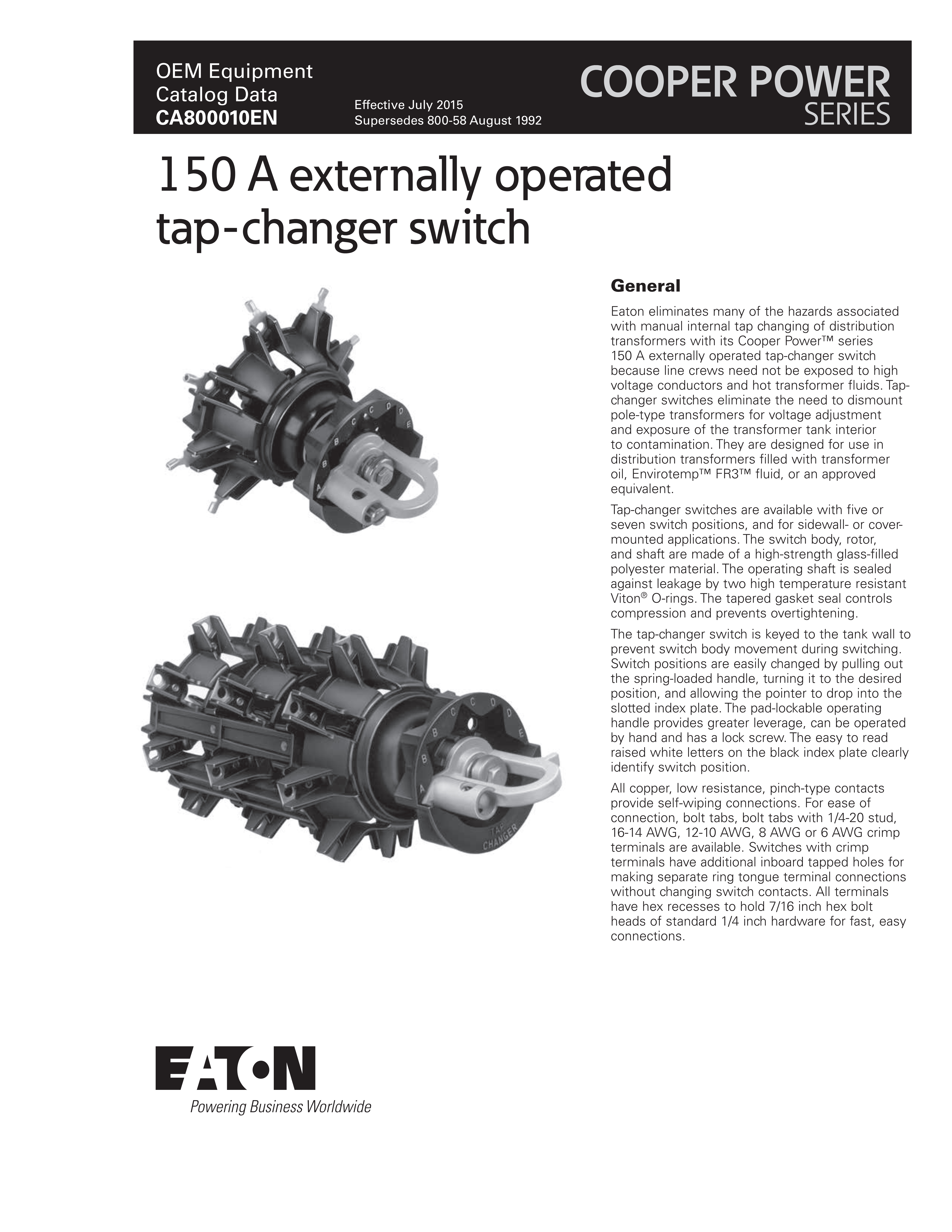 Eaton eliminates many of the hazards associated with manual internal tap changing of distribution transformers with its Cooper Power™ series 150 A externally operated tap-changer switch because line crews need not be exposed to high voltage conductors and hot transformer fluids. Tapchanger switches eliminate the need to dismount pole-type transformers for voltage adjustment and exposure of the transformer tank interior to contamination. They are designed for use in distribution transformers filled with transformer oil, Envirotemp™ FR3™ fluid, or an approved equivalent.