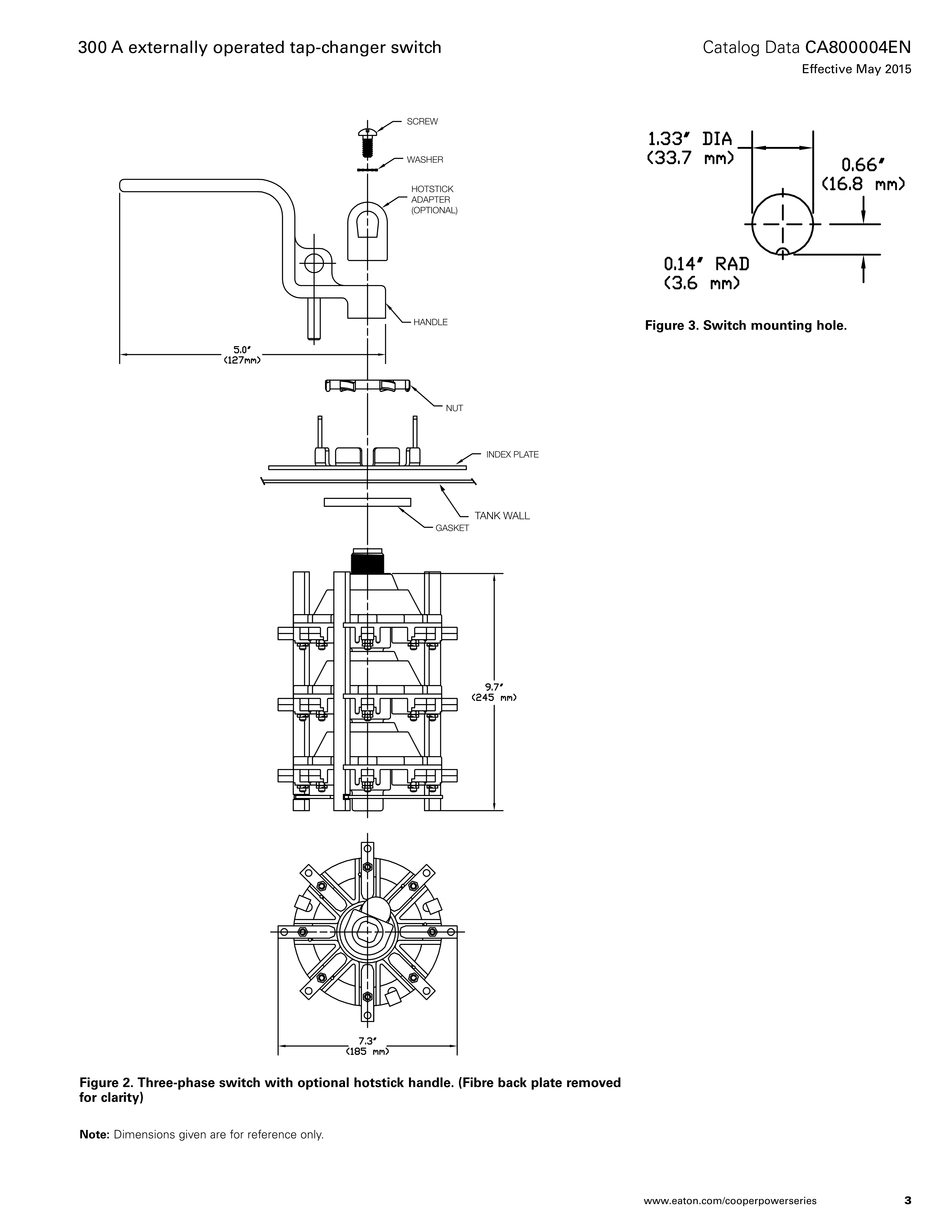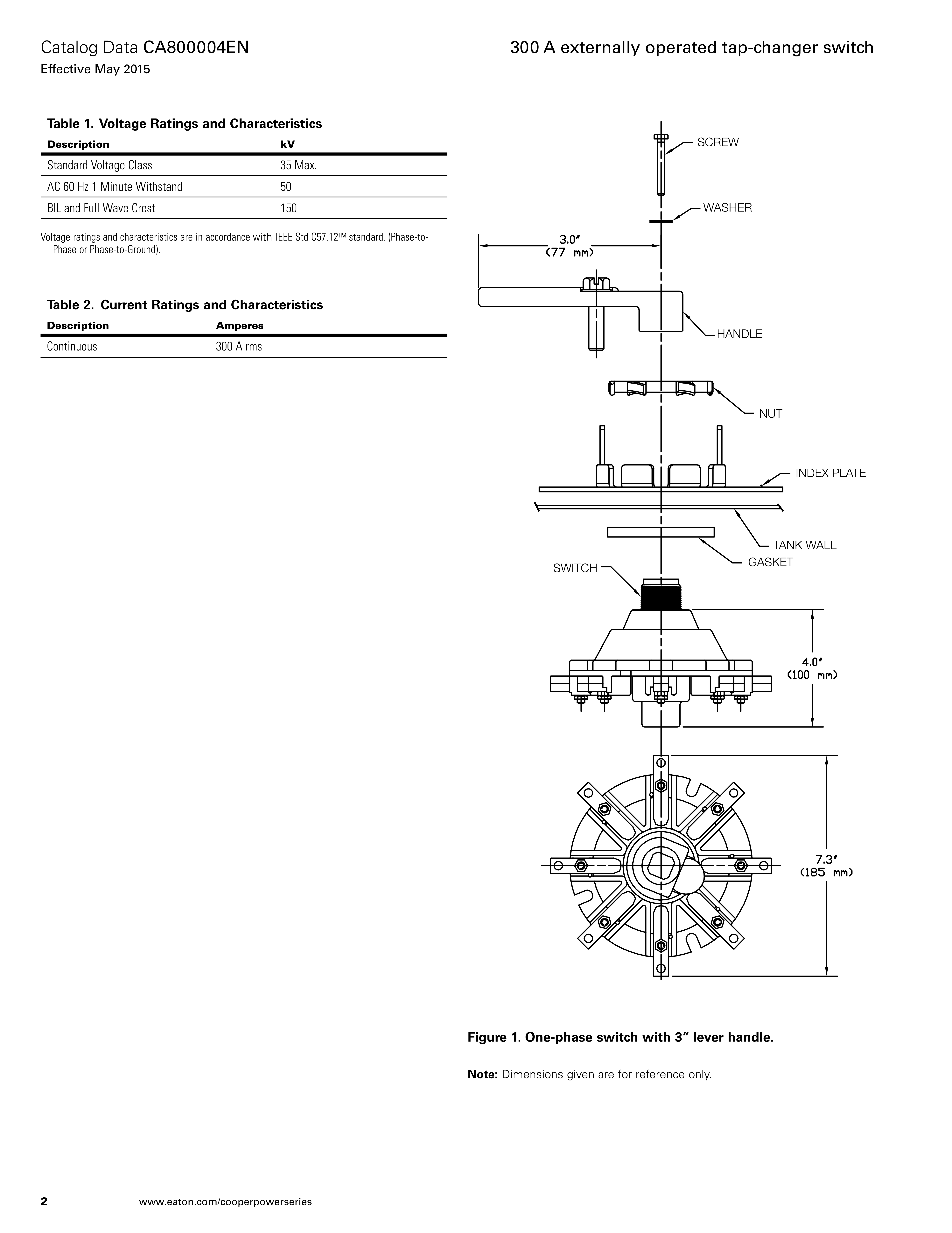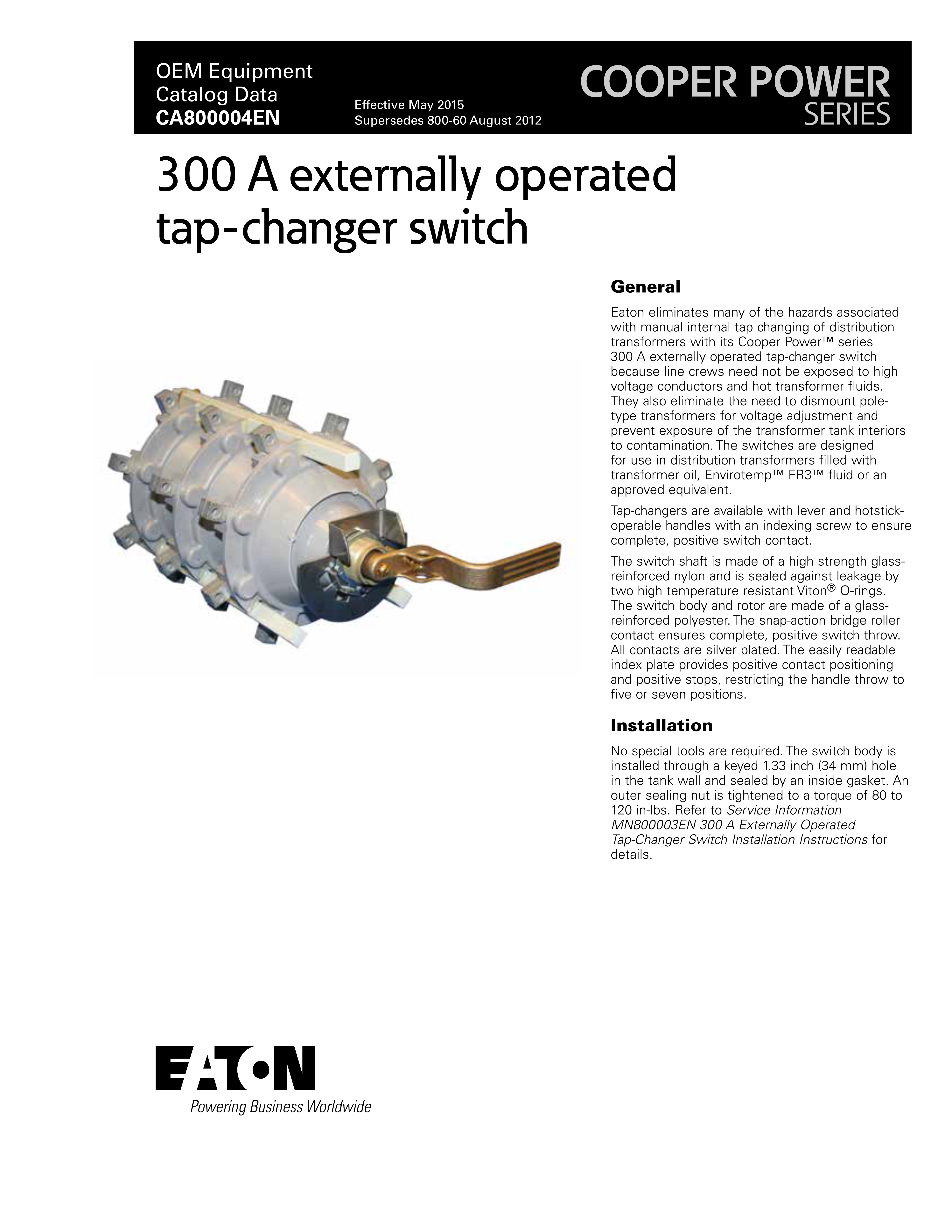 Eaton eliminates many of the hazards associated with manual internal tap changing of distribution transformers with its Cooper Power™ series 300 A externally operated tap-changer switch because line crews need not be exposed to high voltage conductors and hot transformer fluids. They also eliminate the need to dismount poletype transformers for voltage adjustment and prevent exposure of the transformer tank interiors to contamination. The switches are designed for use in distribution transformers filled with transformer oil, Envirotemp™ FR3™ fluid or an approved equivalent.