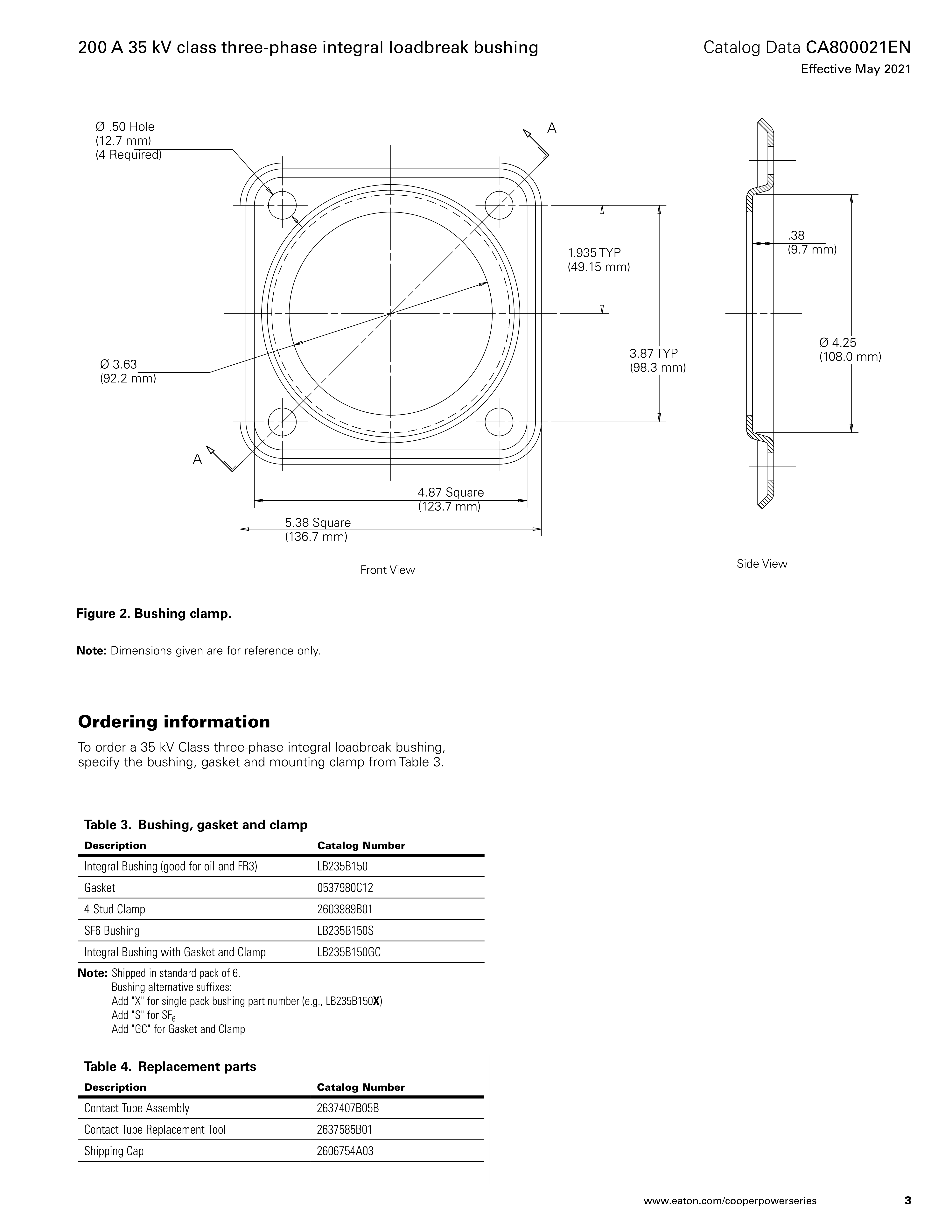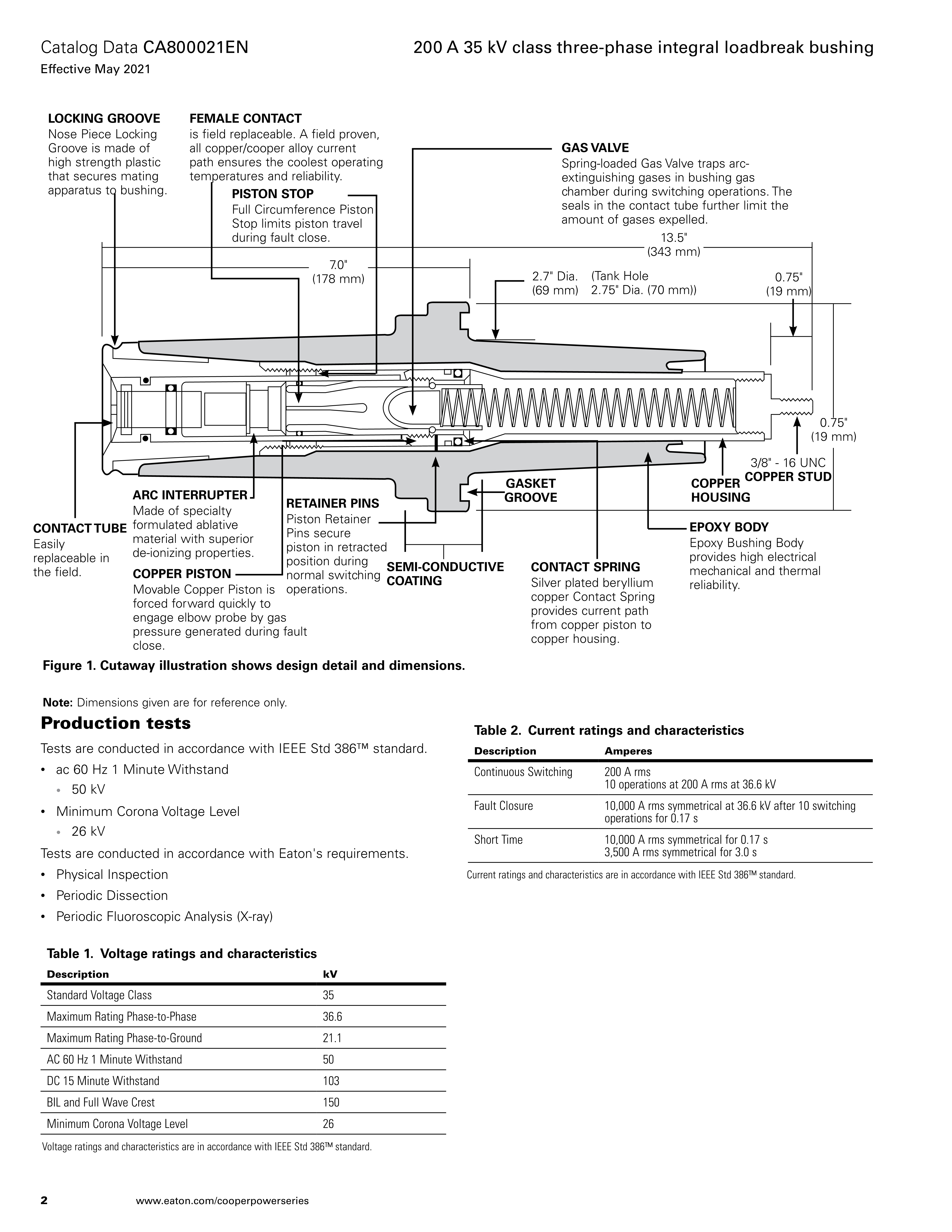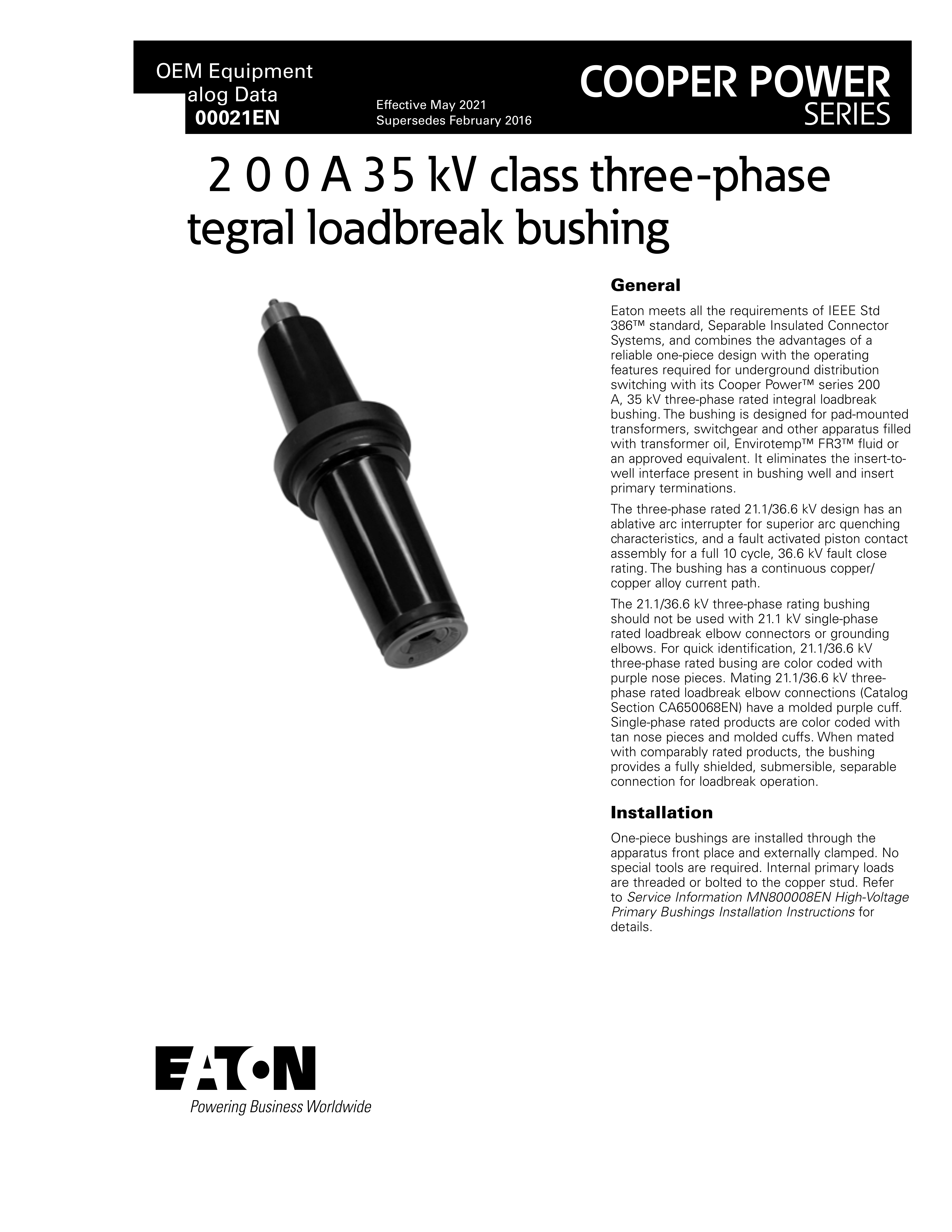 Eaton meets all the requirements of IEEE Std 386™ standard, Separable Insulated Connector Systems, and combines the advantages of a reliable one-piece design with the operating features required for underground distribution switching with its Cooper Power™ series 200 A, 35 kV three-phase rated integral loadbreak bushing. The bushing is designed for pad-mounted transformers, switchgear and other apparatus filled with transformer oil, Envirotemp™ FR3™ fluid or an approved equivalent. It eliminates the insert-towell interface present in bushing well and insert primary terminations.