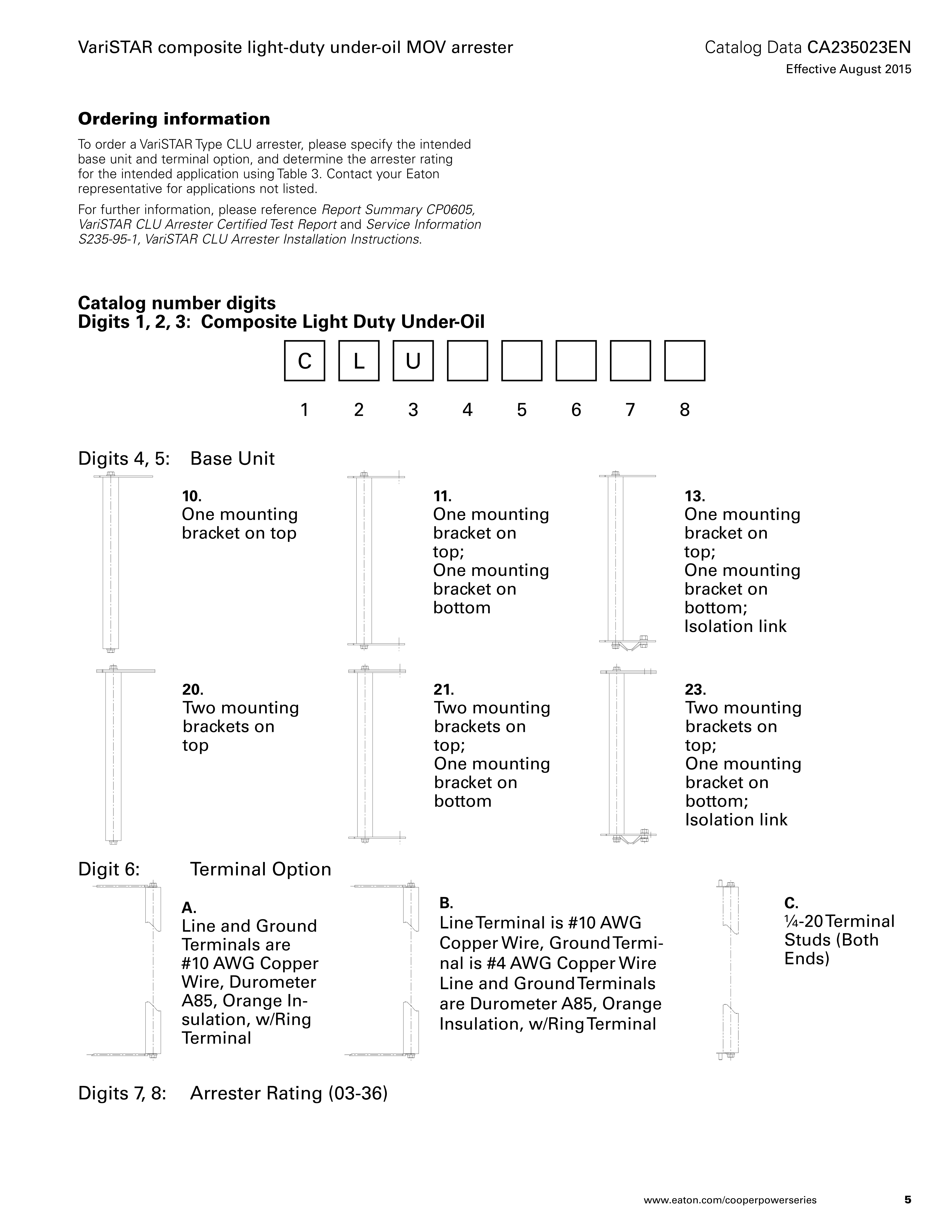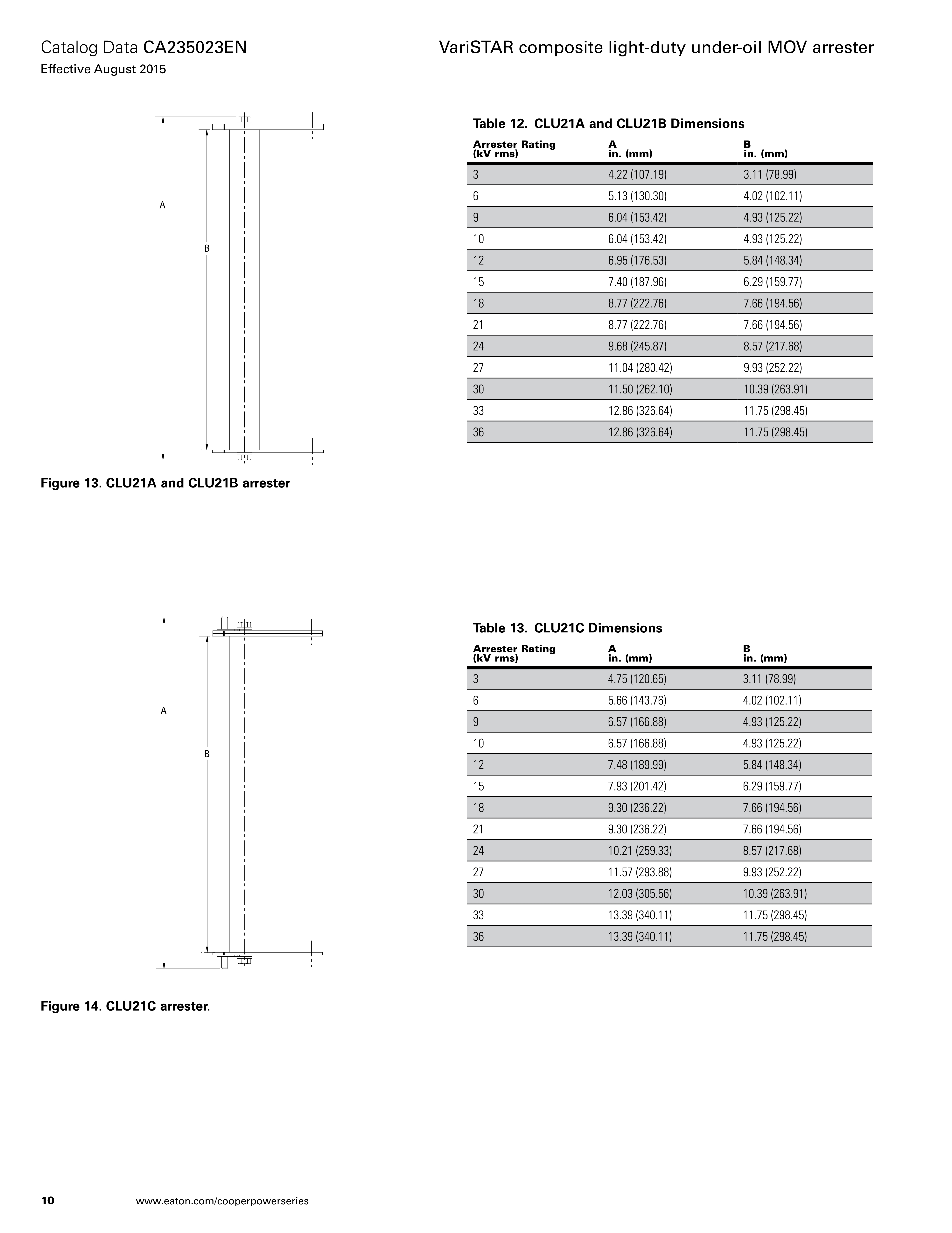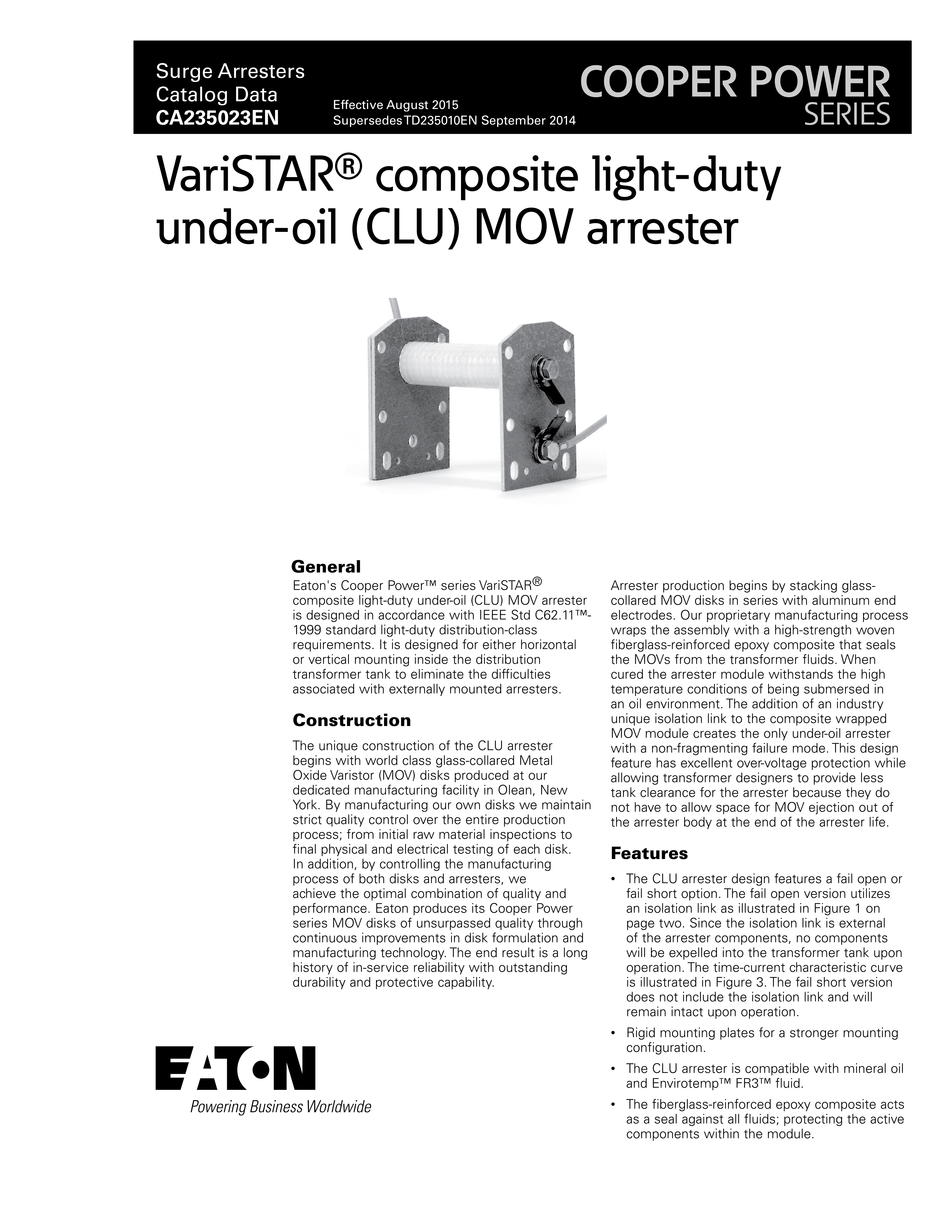 Eaton's Cooper Power™ series VariSTAR® composite light-duty under-oil (CLU) MOV arrester is designed in accordance with IEEE Std C62.11™-1999 standard light-duty distribution-class requirements. It is designed for either horizontal or vertical mounting inside the distribution transformer tank to eliminate the difficulties associated with externally mounted arresters.