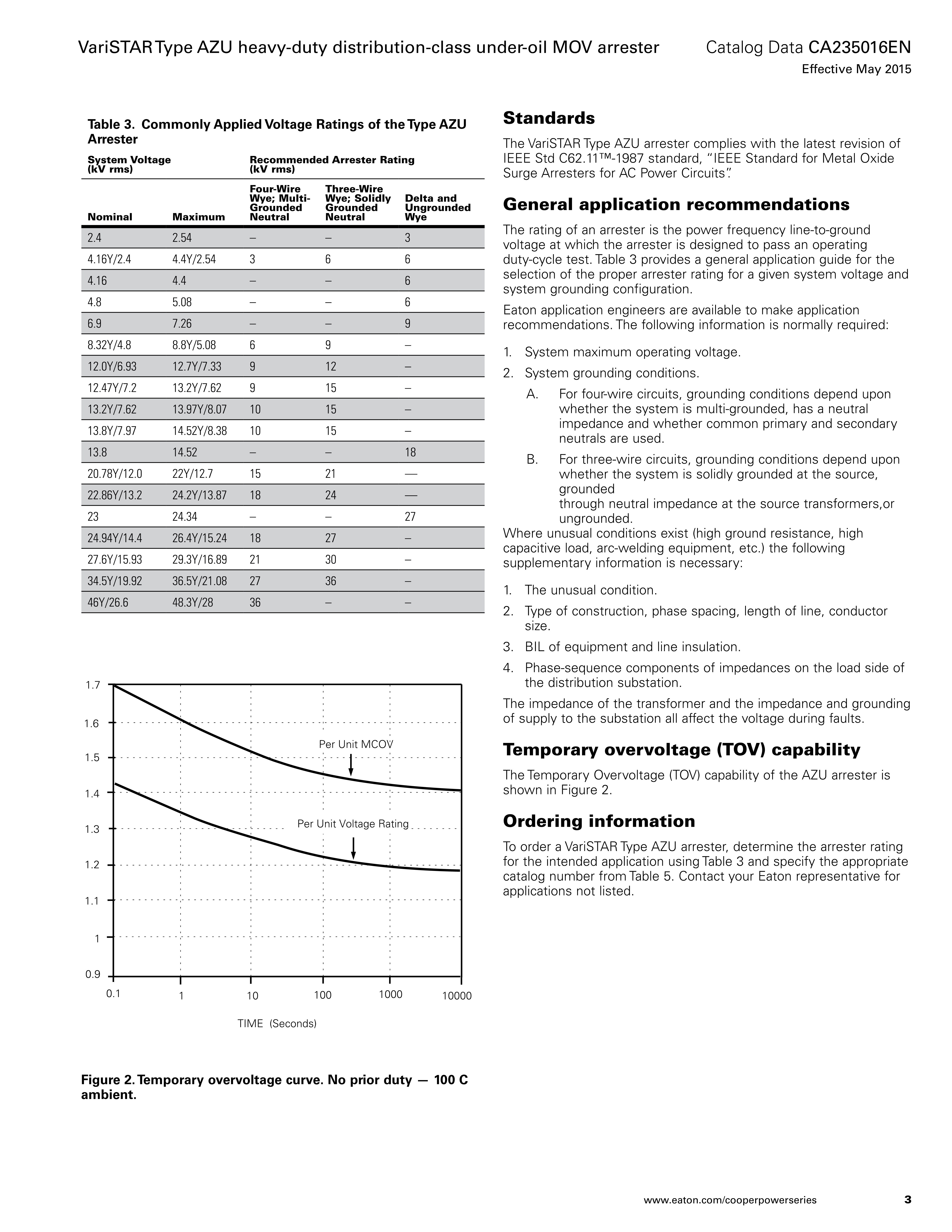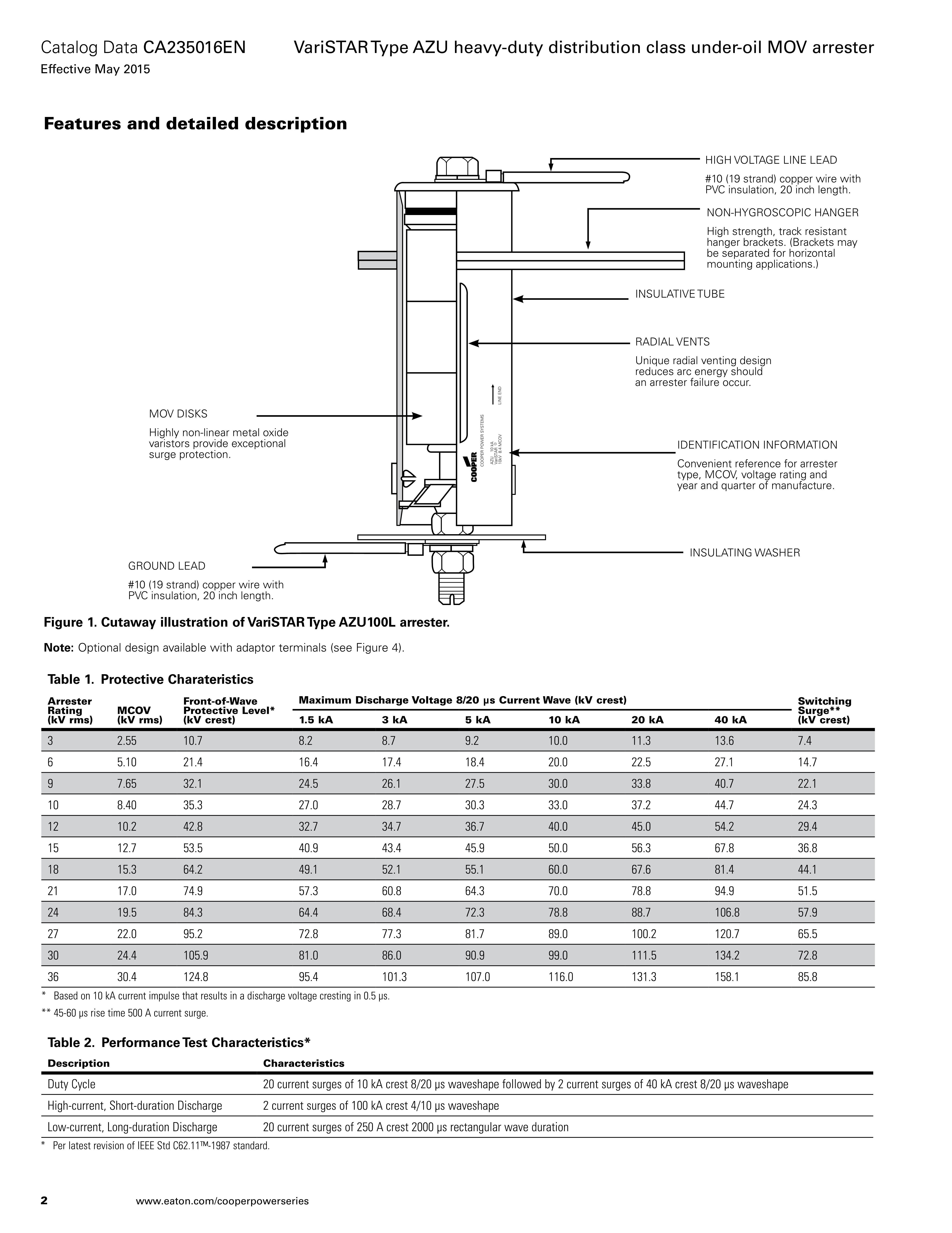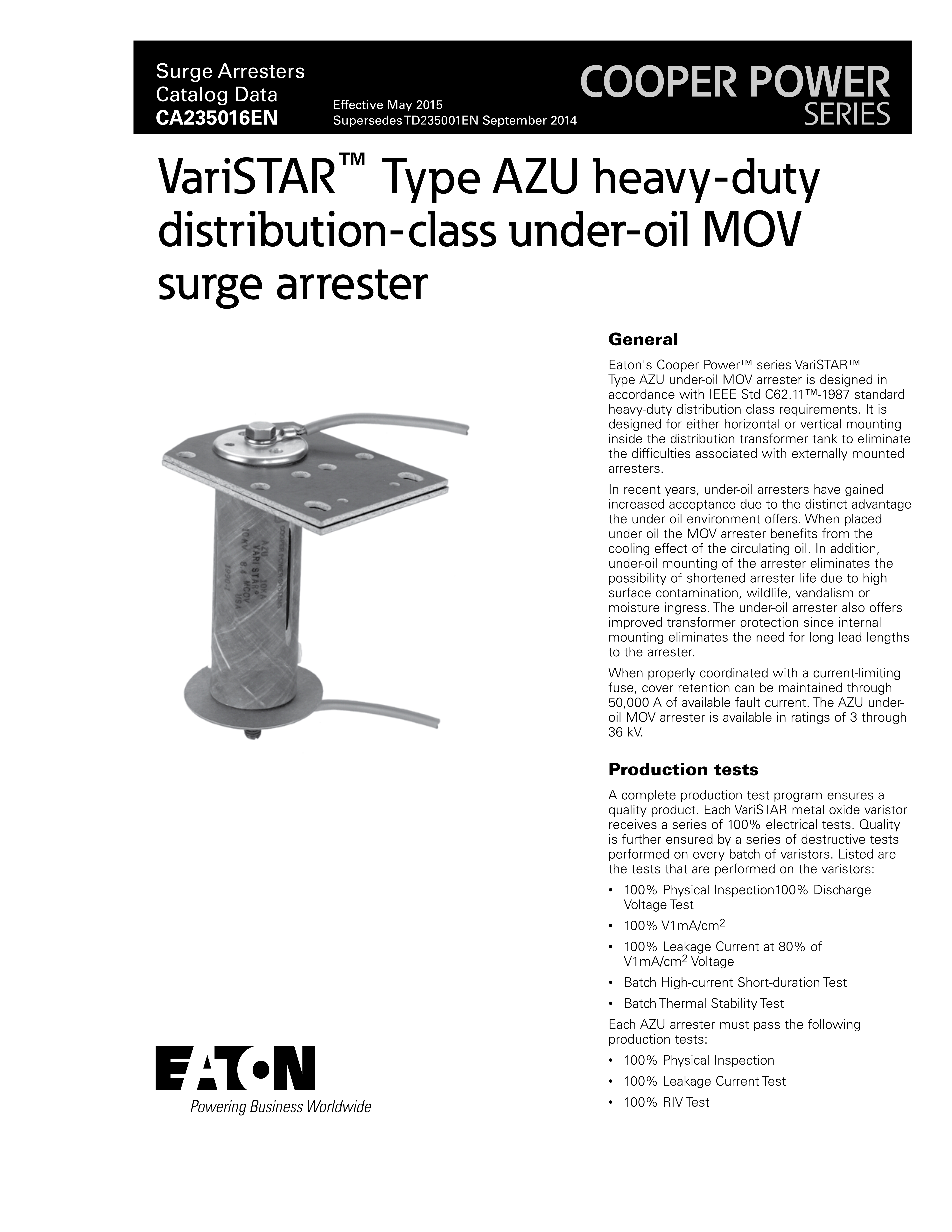 Eaton's Cooper Power™ series VariSTAR™ Type AZU under-oil MOV arrester is designed in accordance with IEEE Std C62.11™-1987 standard heavy-duty distribution class requirements. It is designed for either horizontal or vertical mounting inside the distribution transformer tank to eliminate the difficulties associated with externally mounted arresters.