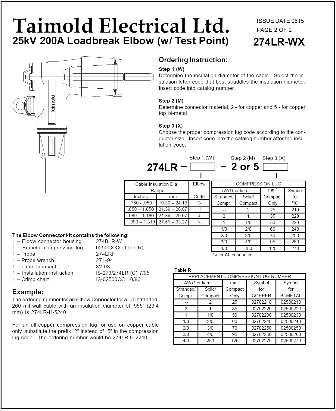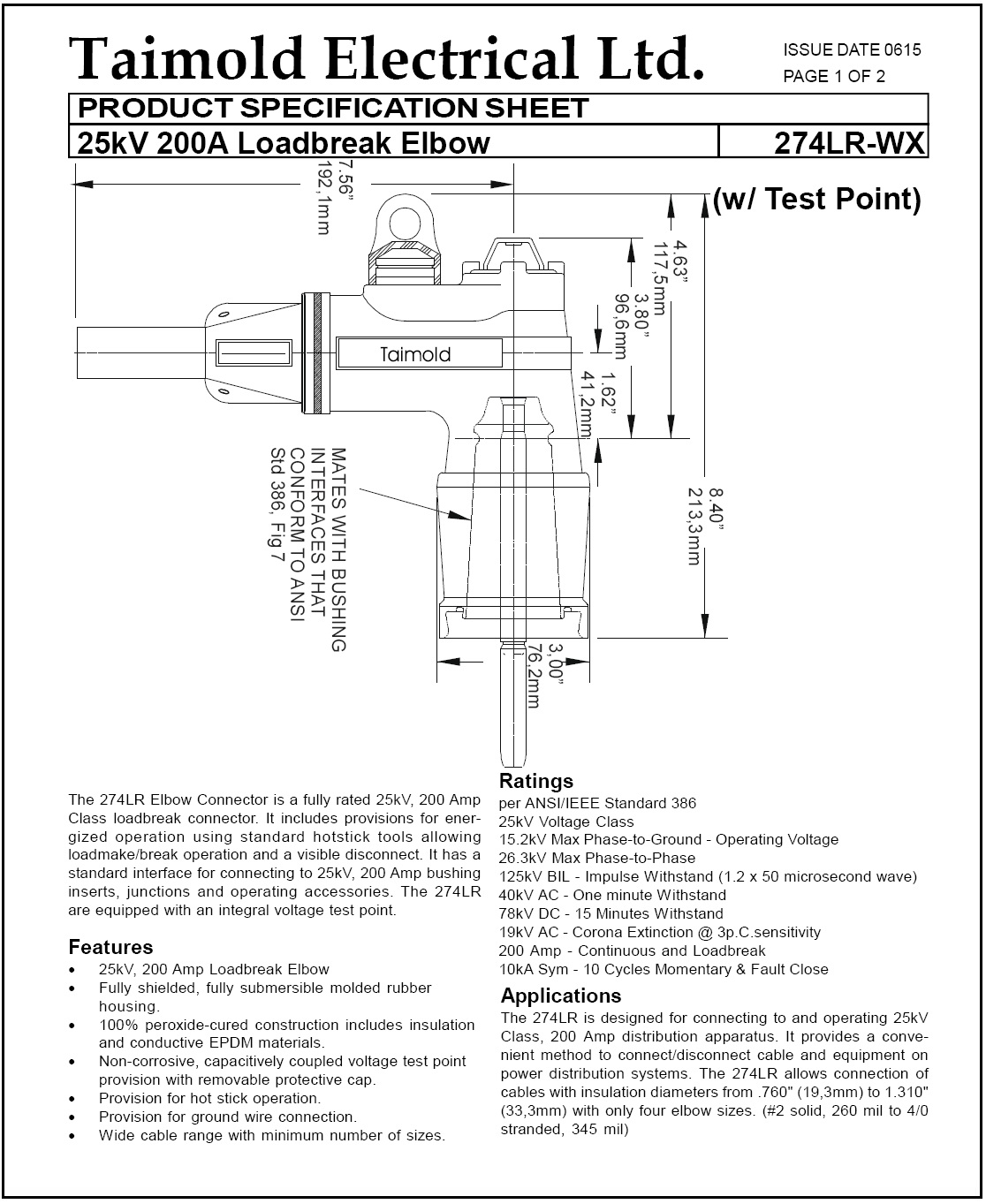 The 274LR Elbow Connector is a fully rated 25kV, 200 Amp Class loadbreak connector. It includes provisions for energized operation using standard hotstick tools allowing loadmake/break operation and a visible disconnect. It has a standard interface for connecting to 25kV, 200 Amp bushing inserts, junctions and operating accessories. The 274LR are equipped with an integral voltage test point.
